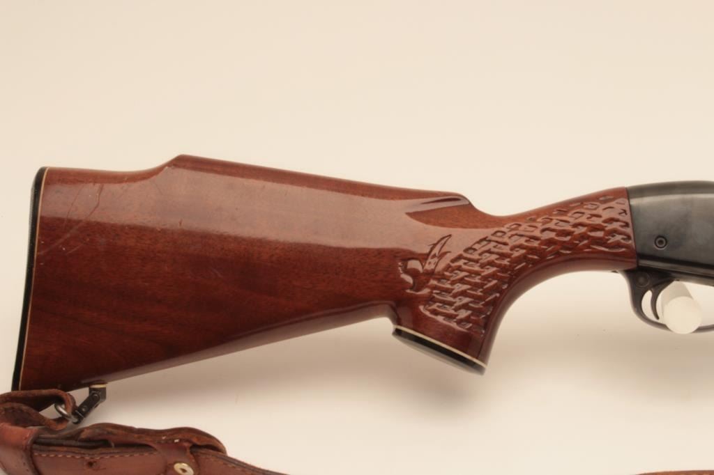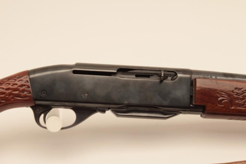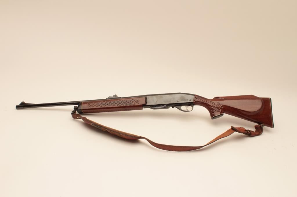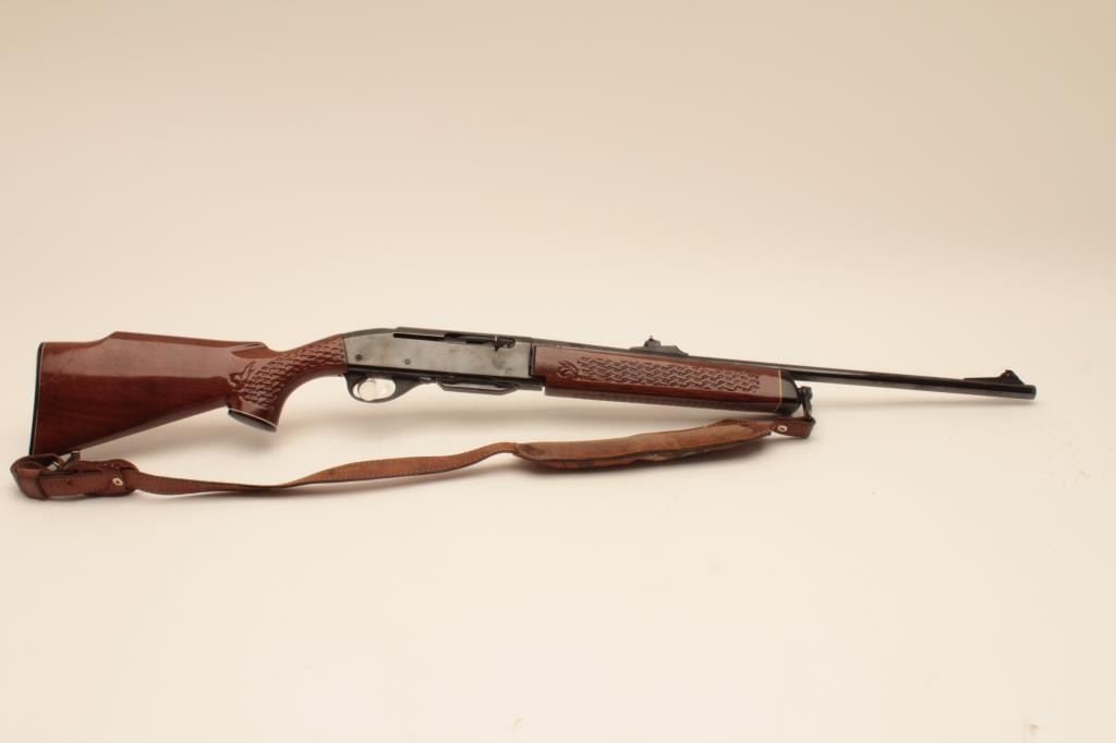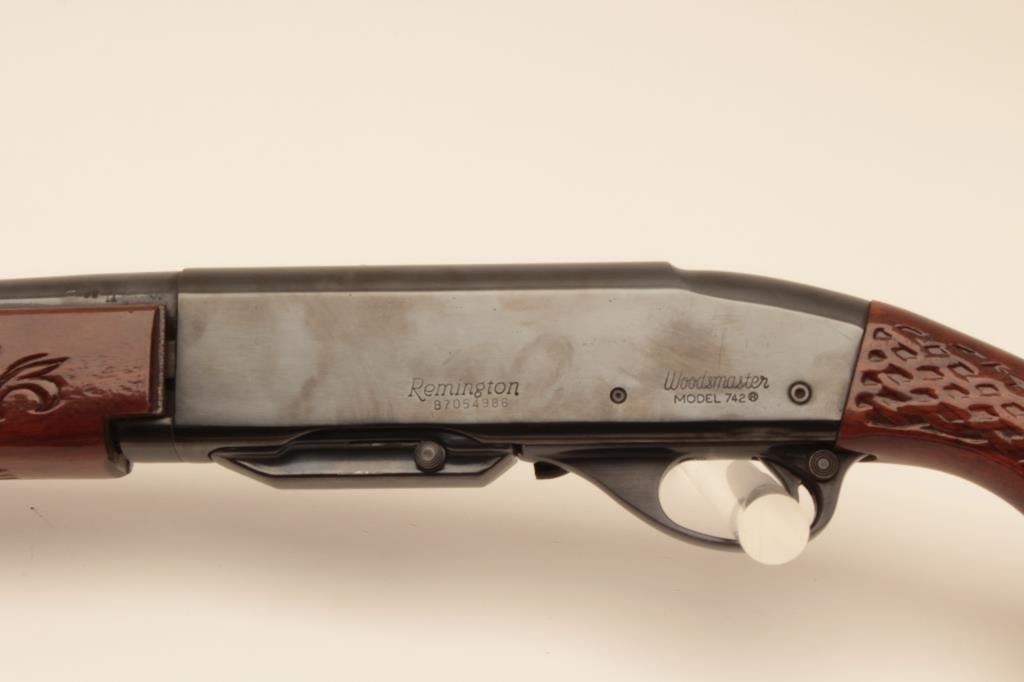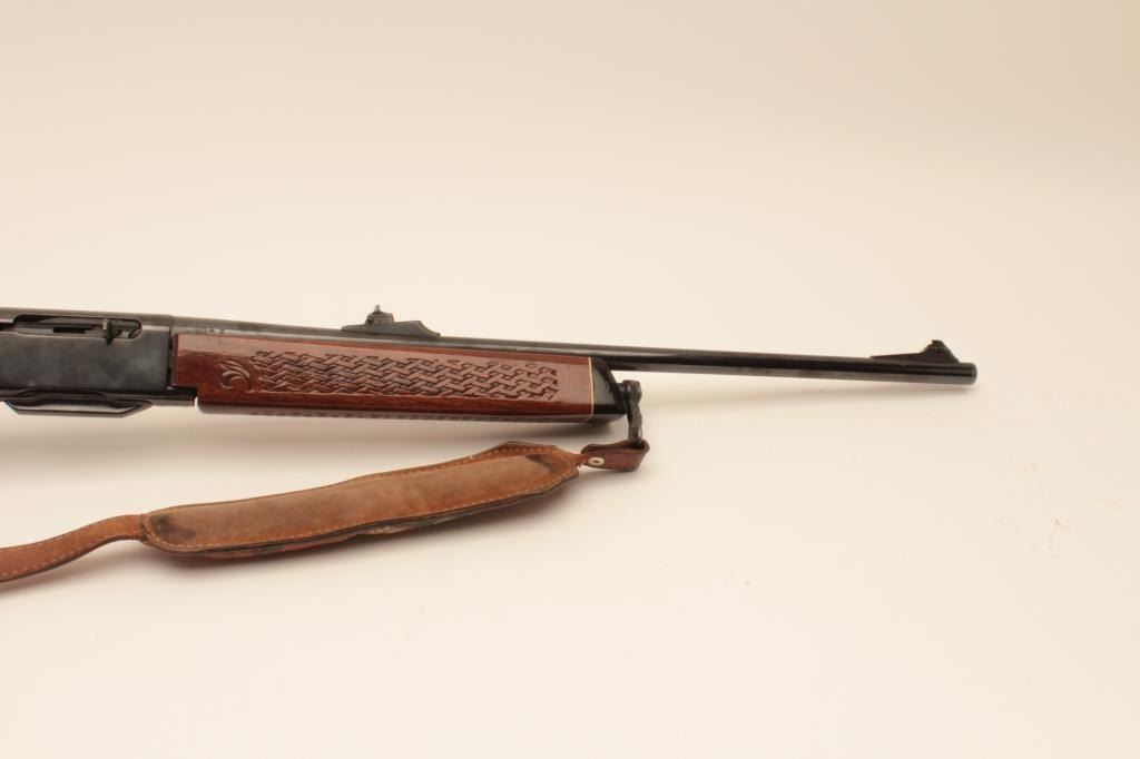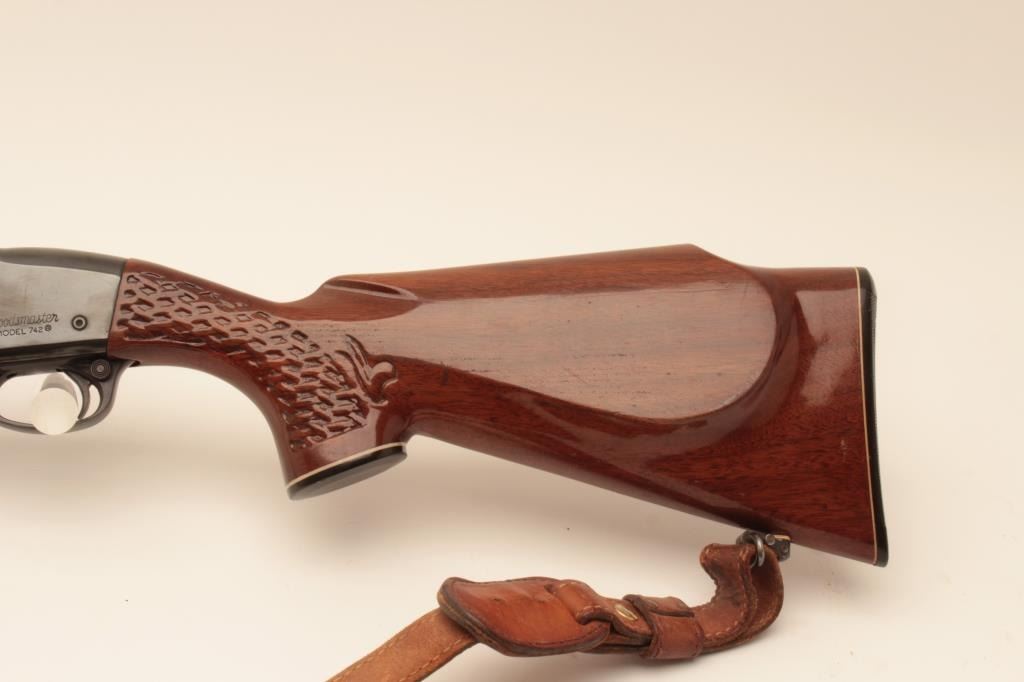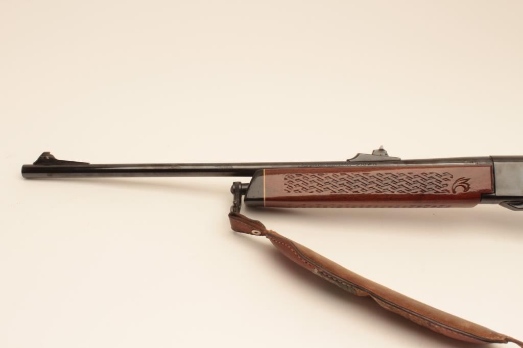 Remington Woodmaster 742, #B7054986, .308 cal., 22" barrel, quick detatchable sling mounts with leather sling. Rifle is in very good condition overall, retaining the majority of it's original bluing, bore isvery good, receiver has been drilled and tapped for scope mount (not present). (C&R) Est. $300-600