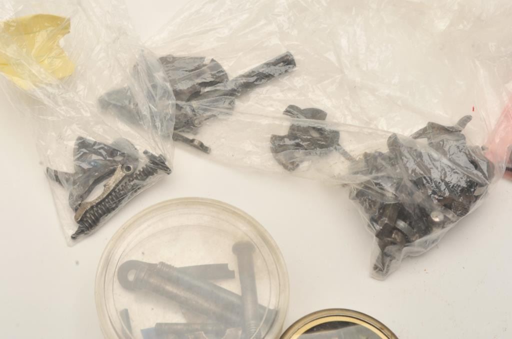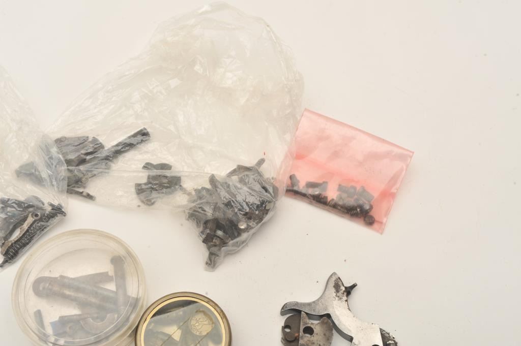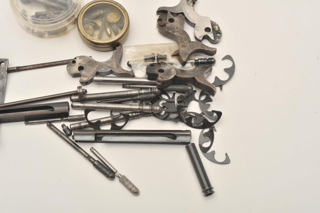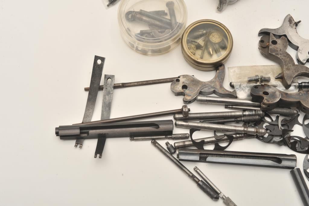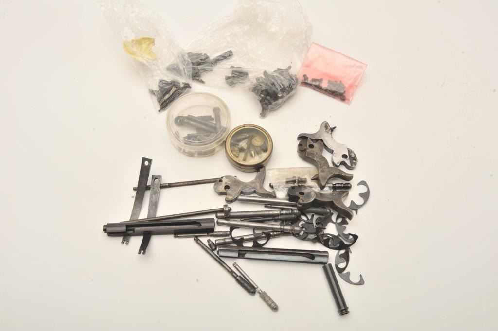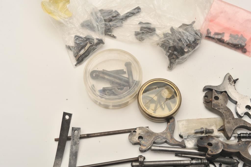Lot of early Colt small parts and some other makers; cylinder pins, hammers, screws, grip medallions, etc. Est.: $125-$250.