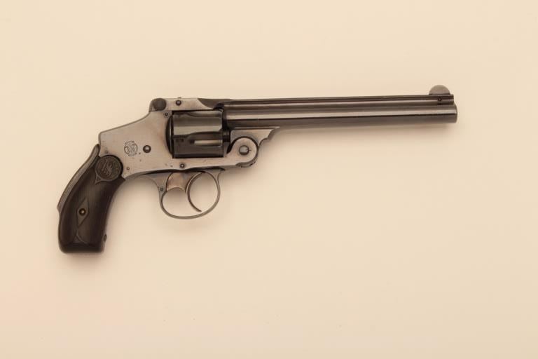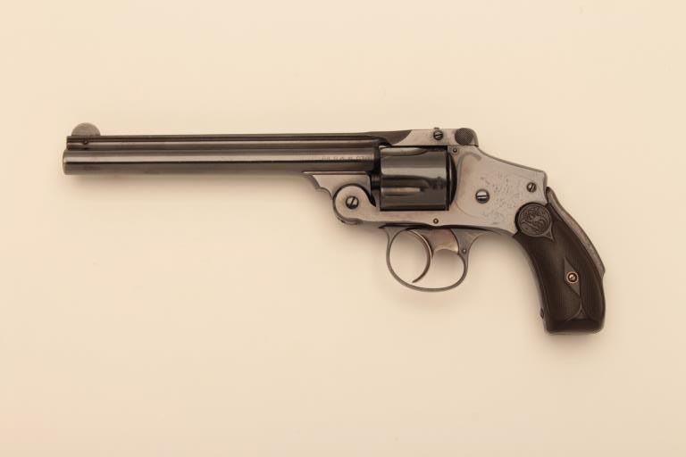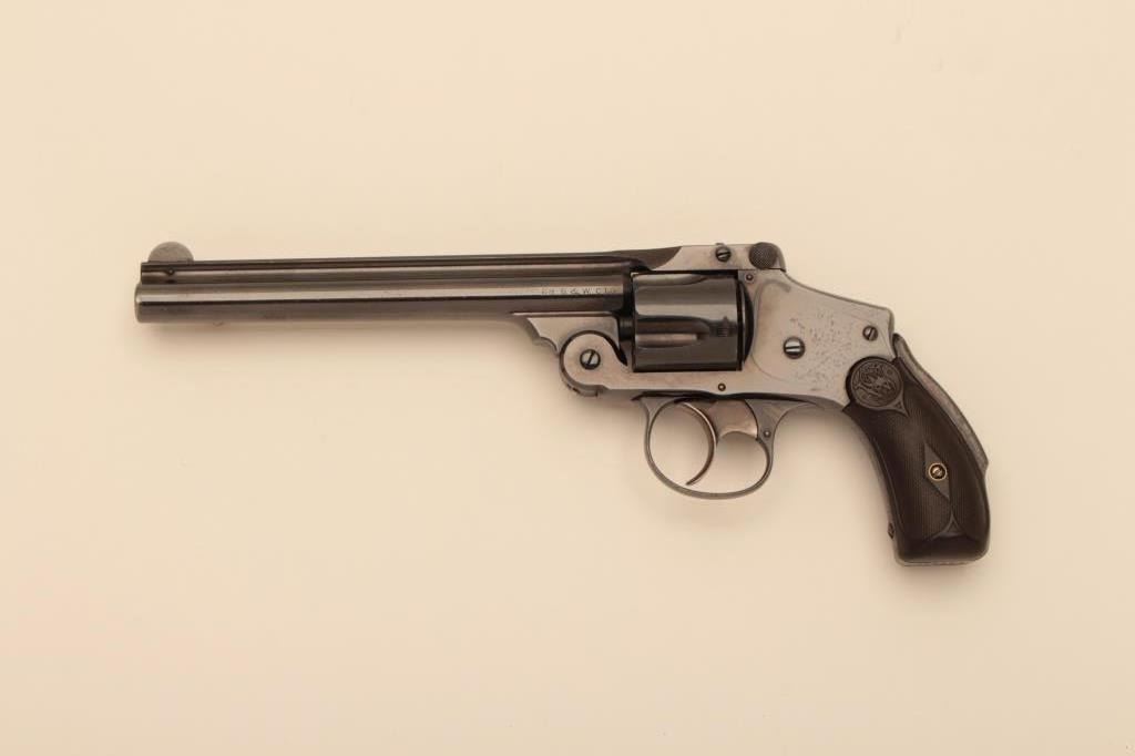 Smith & Wesson New Departure Model DA revolver, .38 caliber, desirable 6” barrel, blued finish, checkered hard rubber grips, S/N 140957 with returned to factory star over S/N on butt; appears to be a factory quality re-blue, very good bore, crisp action and markings, very good to near fine grips. (C&R). Est.: $600-$1,200.