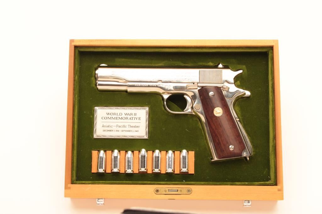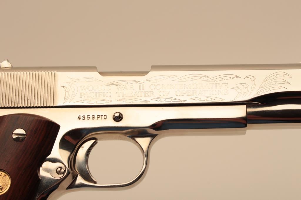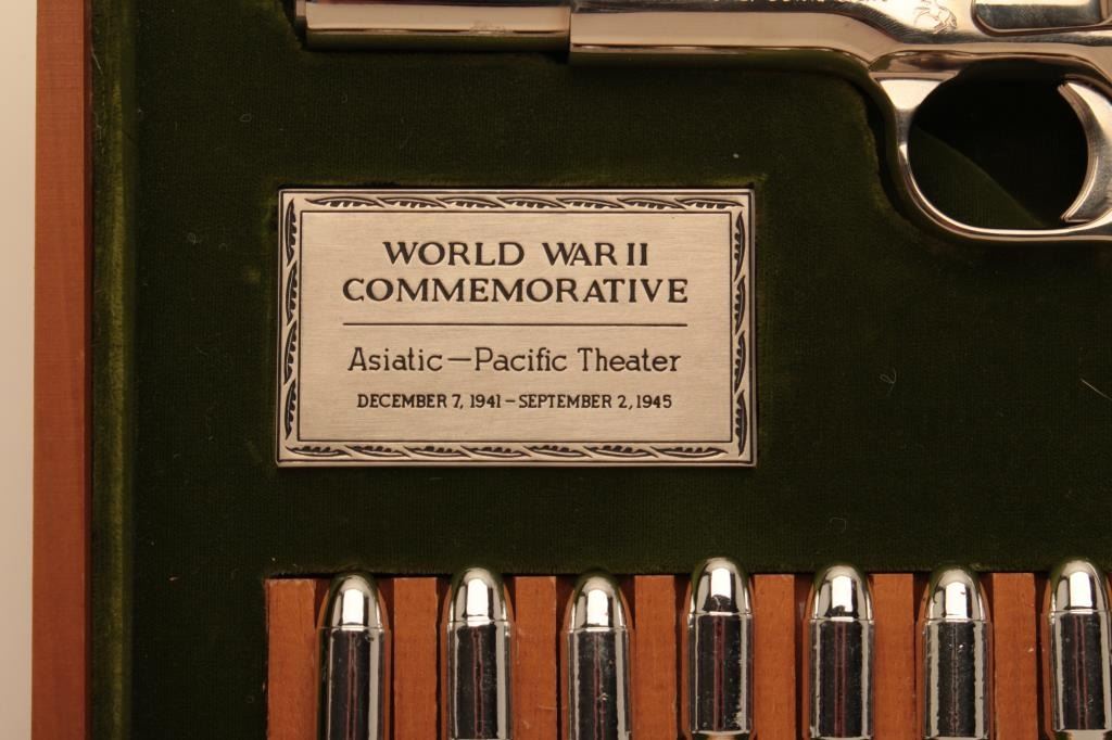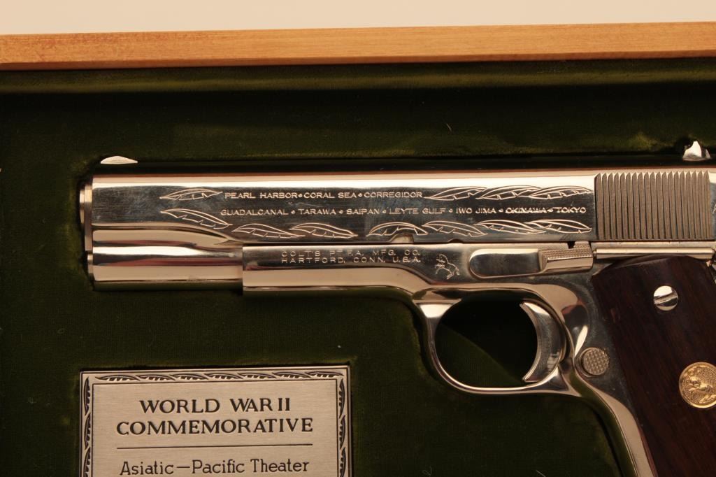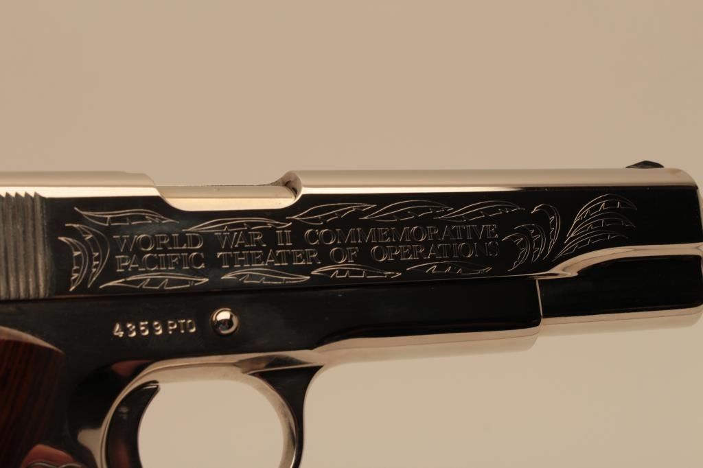 Colt Model 1911A .45 Auto caliber WWII Commemorative of Pacific theater of operations, S/N 4359PTO in fine to excellent condition. 99% with possibly few rounds fired. Slight storage marks and handling only to case. (C&R/PPT) Est.: $750-$1500