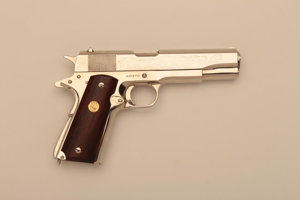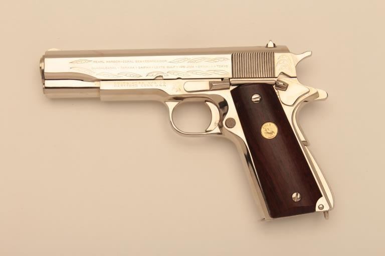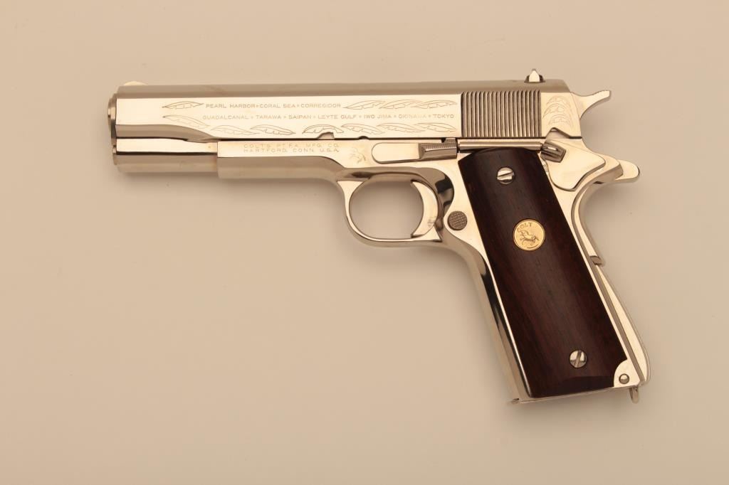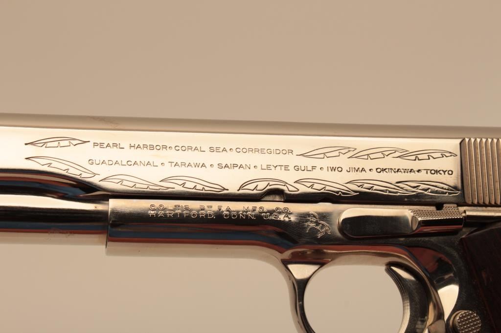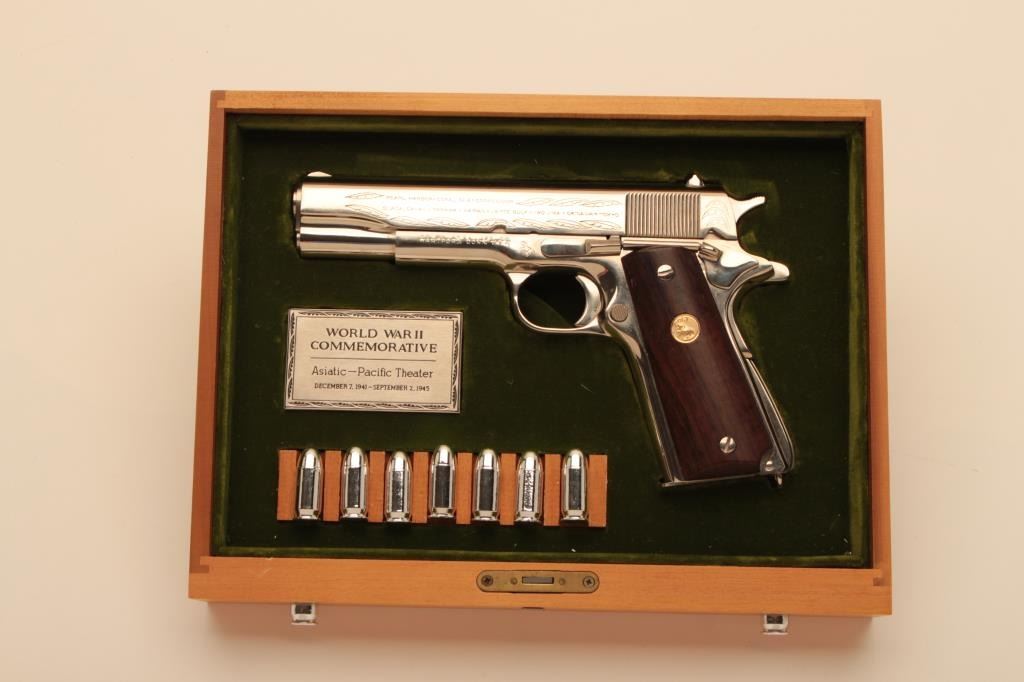 Colt Model 1911A .45 Auto caliber WWII Commemorative of Pacific theater of operations, S/N 4359PTO in fine to excellent condition. 99% with possibly few rounds fired. Slight storage marks and handling only to case. (C&R/PPT) Est.: $750-$1500