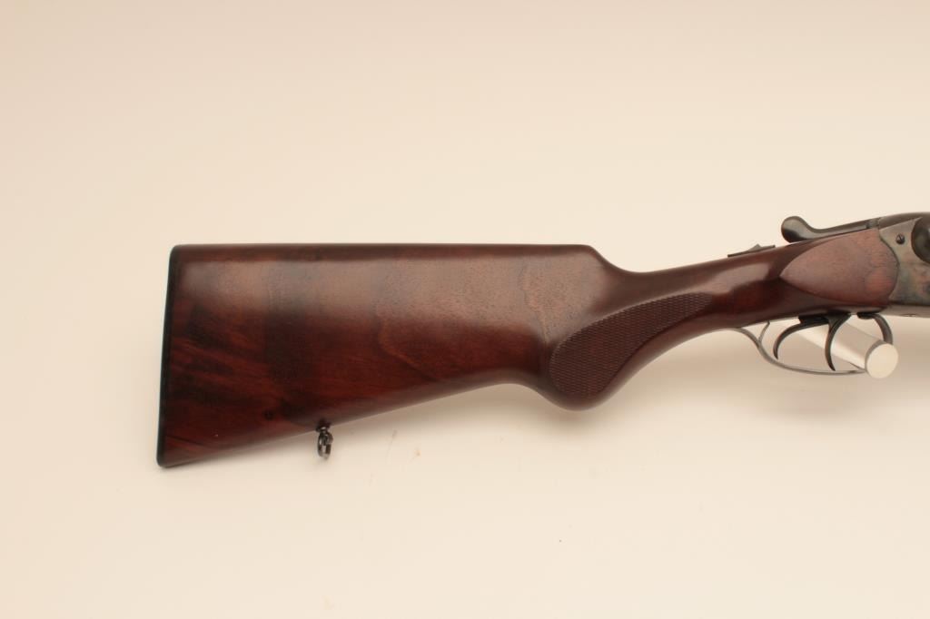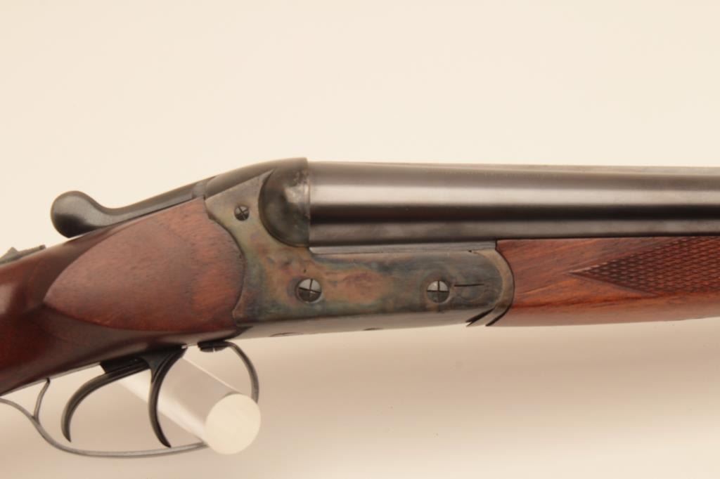 Suhl Germany Post War (GBR) guild gun in 12GA with 28” barrels choked modified right and full left, double triggers, standard extractors, rounded pistol grip European style stock with sling swivels, S/N 879716.Blue and case color finish remain in excellent condition with 98%-99% plus and colors are very brilliant. The stocks are fine to excellent. 2 ¾” chamber and shows very little to almost no use. With Europeanleather carry case. Obtained by an American G.I. in Europe before the wall came down and imported for own use. No import marks. Current replacement for comparable Suhl made gun is $2000-$2500. (Modern) Est.: $600-$1200