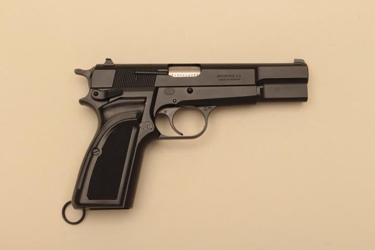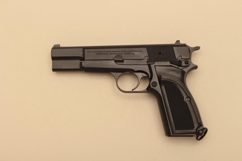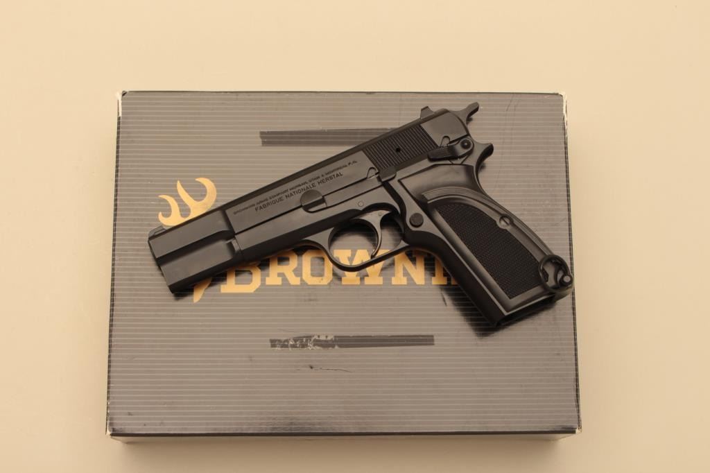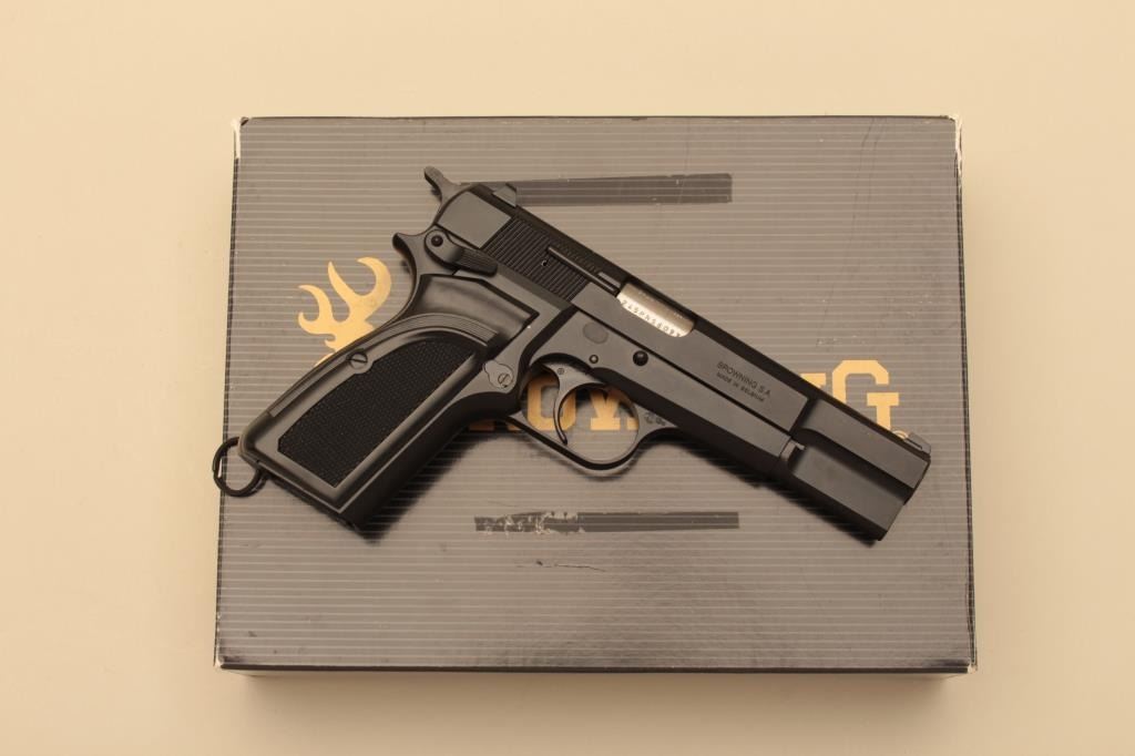 Browning Hi Power Mark III, #245PN56097, 9mm, matte black finish, 4.6" barrel, fixed sights, plastic checkered grips with thumb rests. This Belgian made Hi Power remains in excellent condition, showing minimalhandling marks. Includes box, instructions and 2 hi-cap mag (not transferrable to CA or other prohibited states or areas). (Modern/PPT) Est. $600-1200