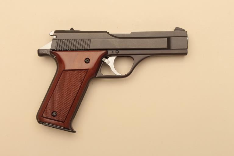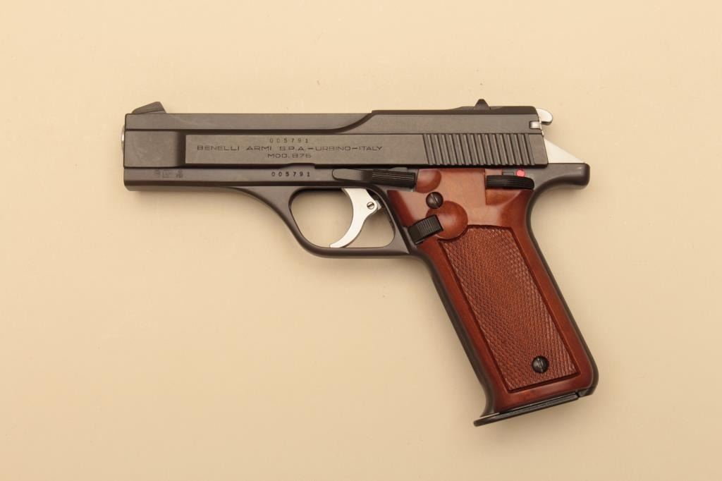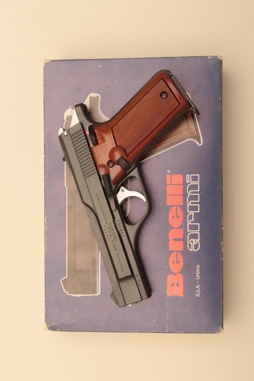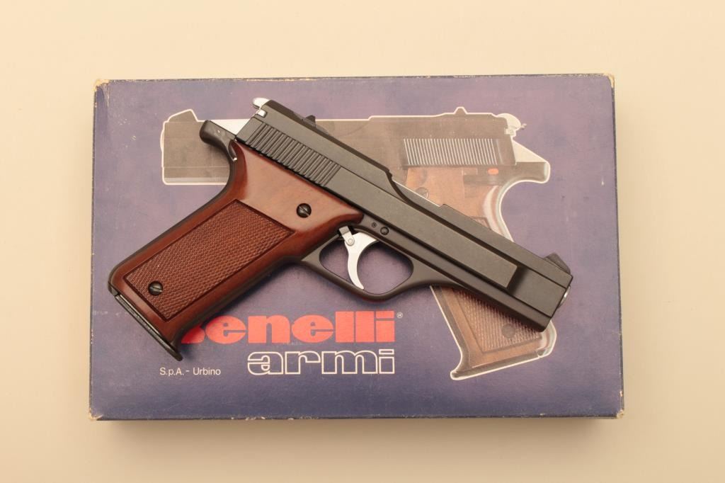 Benelli B76, #005791, 9mm, 4 1/4" barrel, matte blue finish, fixed sights, checkered wood grips. Pistol is in fine to near excellent condtion, retaining 95-98% original finish, showing just minimal handling marks. Bore is mint, action is crisp. Includes original box, one mag and manual. (Modern/PPT) Est. $500-1000