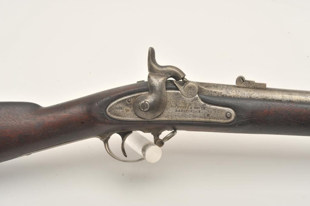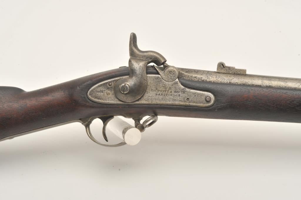 Colt percussion musket, lockplate dated 1862, .60 caliber, 39.5” barrel, light grey patina to metal surfaces, full length wood stock; overall good + condition showing scattered pinprick pitting around firing area, crispaction, good markings and overall good wood stock with scattered old mars, dings, scratches and some discolorations to wood. (Antique). Est.: $500-$1,000.