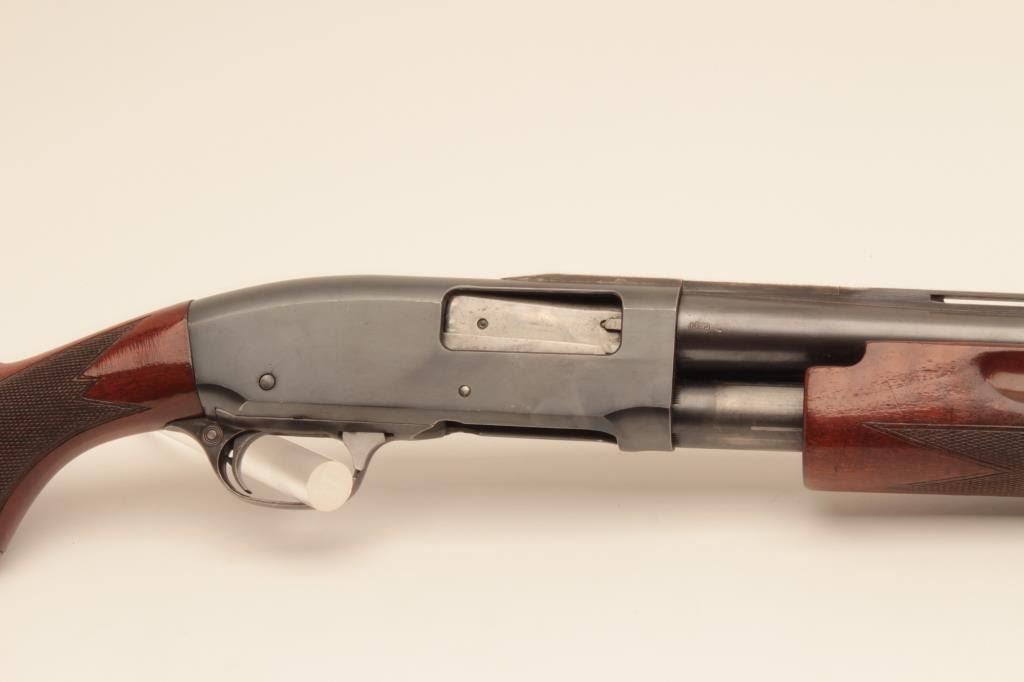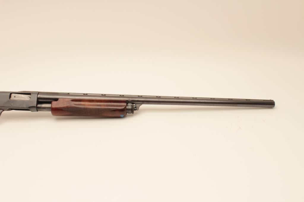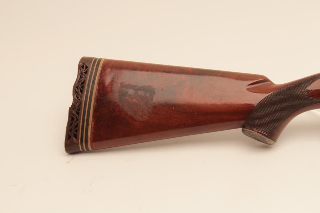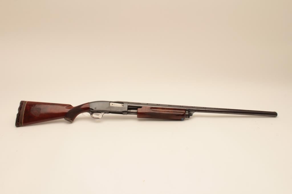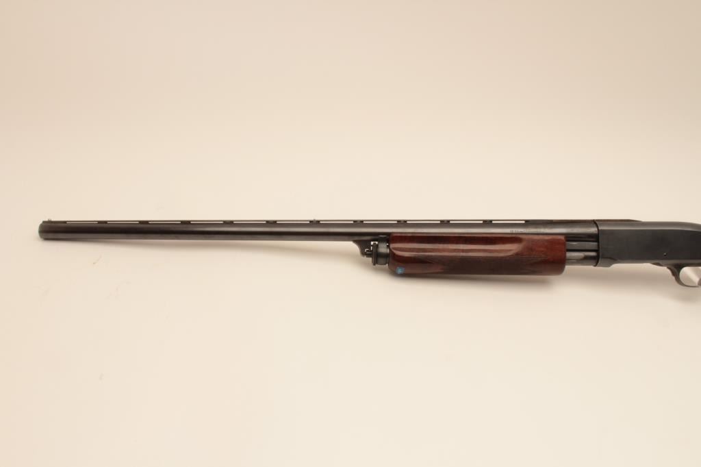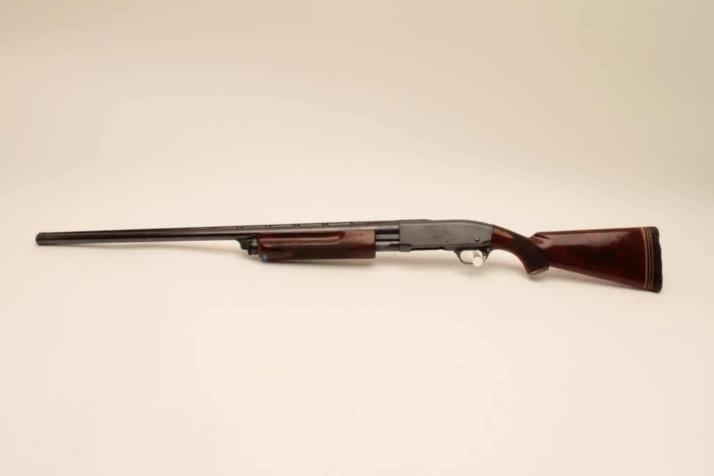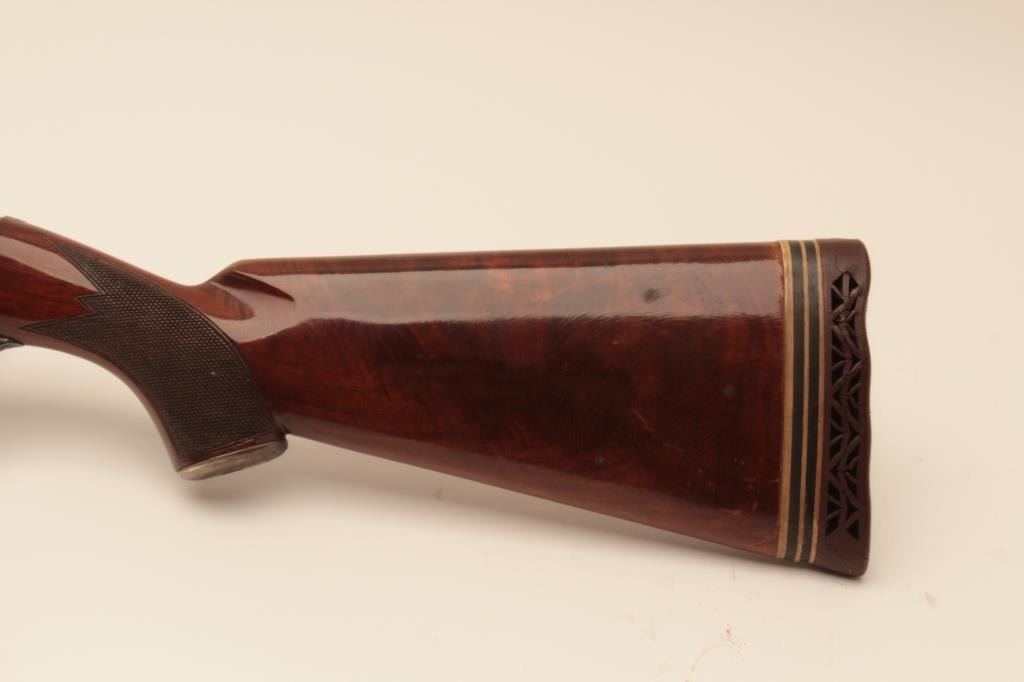 Remington Model 31-TC 12GA Pump Action Shotgun with 30” vent rib barrel, S/N 115155. Choke marked improved modified. 75%-85% original blue. Nicely figured walnut stocks with engraved silver pistol grip cap added.The stocks are good with wear to the finish. Rubber butt plate is deteriorated and in need of replacing. The action is good and the bore is bright. Measures 13” to the end of the wood and 14 ¼” to the end of the pad with 3 spacers. (Modern) Est.: $300-$600