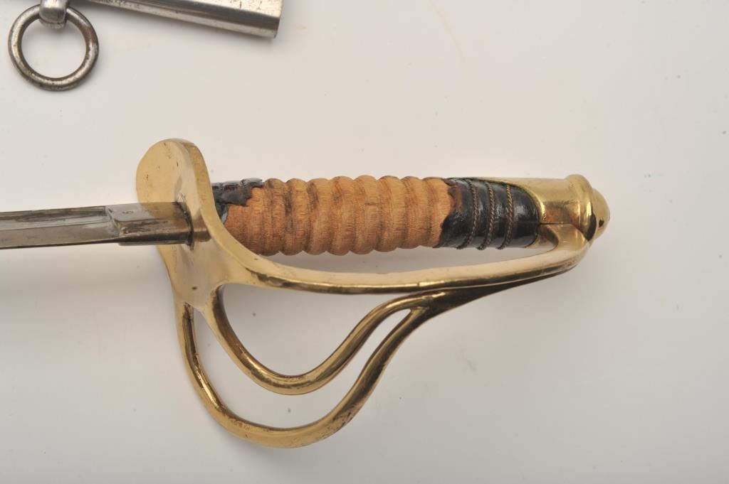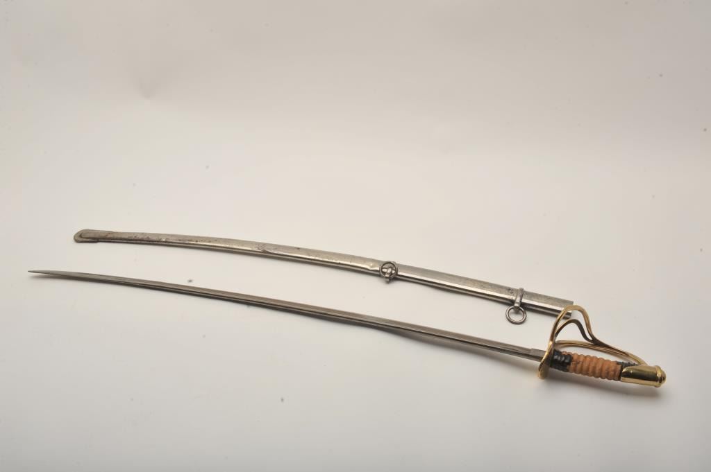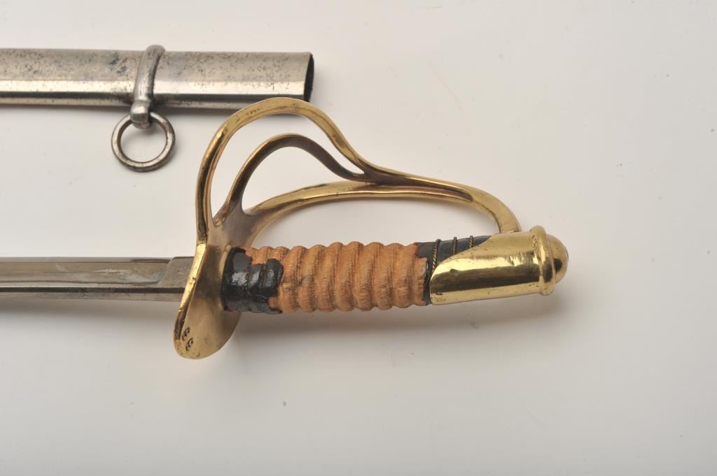 U.S. Model 1860 Cavalry Officer’s sword and metal scabbard; blade well-marked “U.S. 1865/A.G.M.” also marked “C. Roby”; brass guard and pommel; grip is missing most of its leather and wire wrap. Est.:$250-$500.