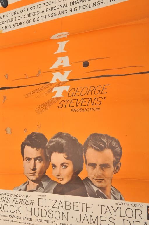 Classic color movie poster for the film “Giant” starring Elizabeth Taylor, Rock Hudson and James Dean; approximately 41” x 27”. Est.: $150-$300.
