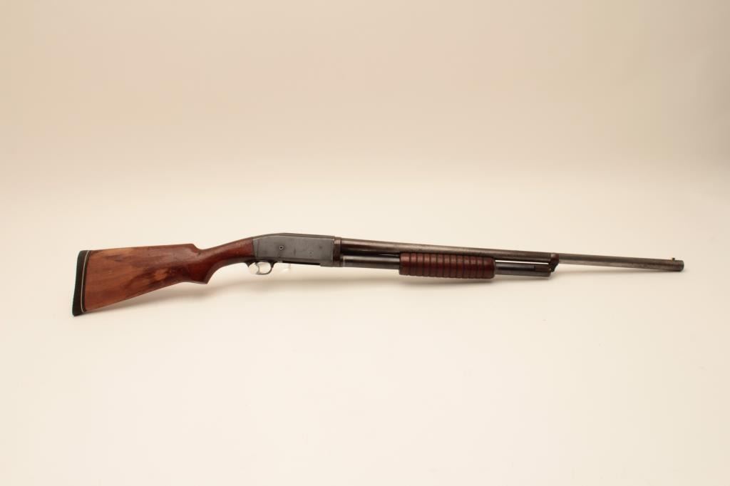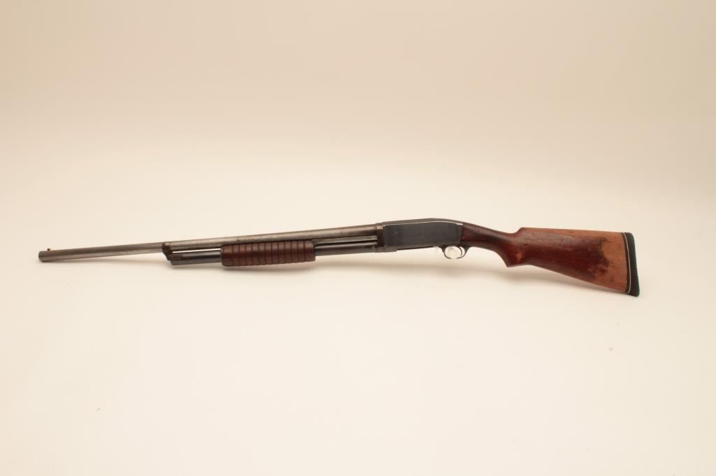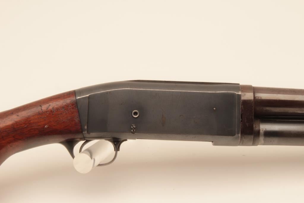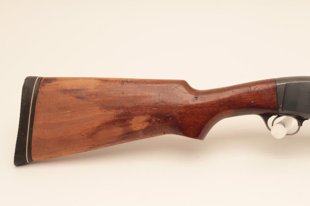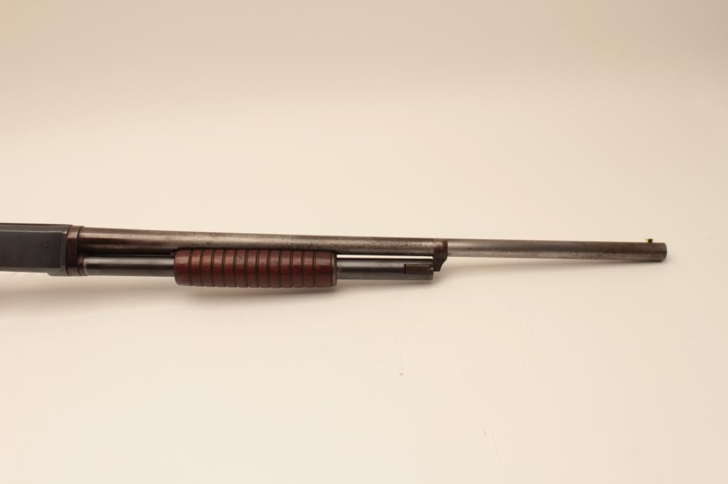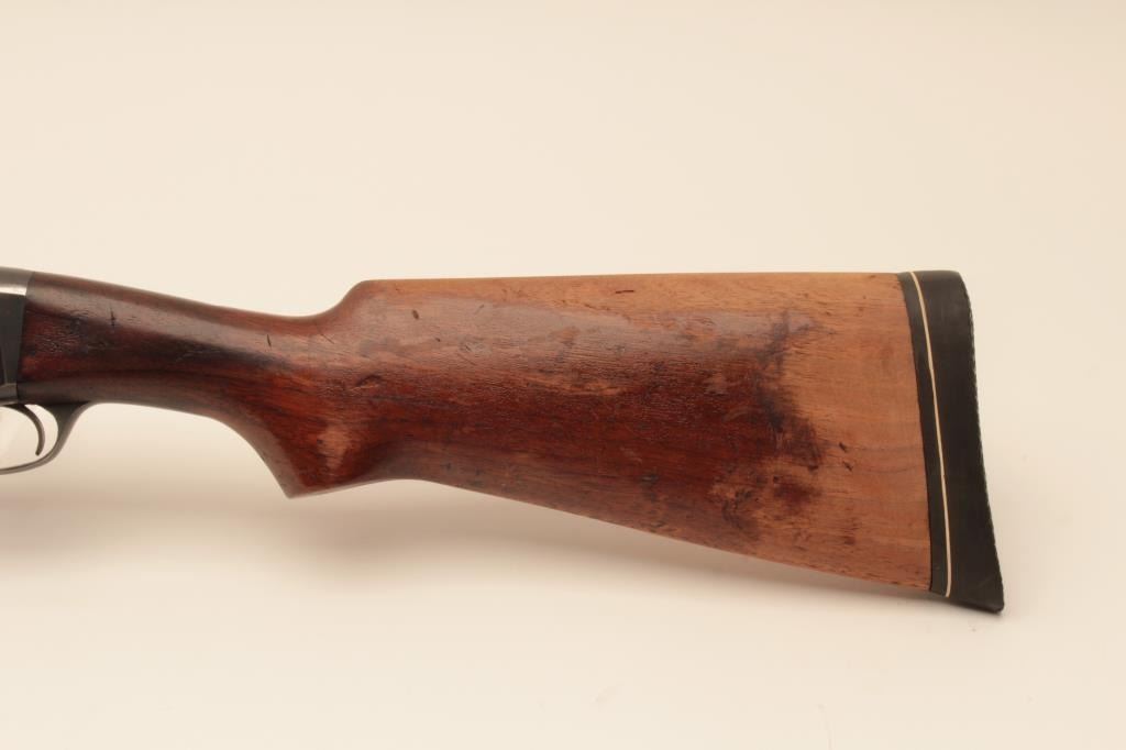Remington Model 10 12GA pump action shotgun with a 28” barrel and full choked, S/N 24460. Fair to good with 30%-50% original finish. The stocks show crude fitting of rubber pad. Mechanically sound. (Modern) Est.: $150-$300