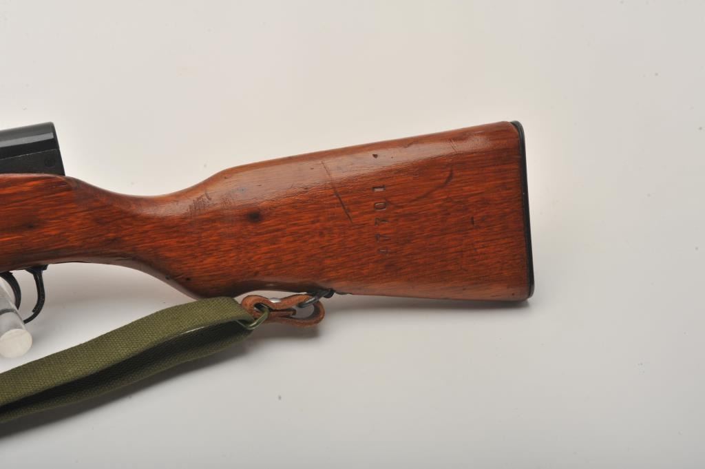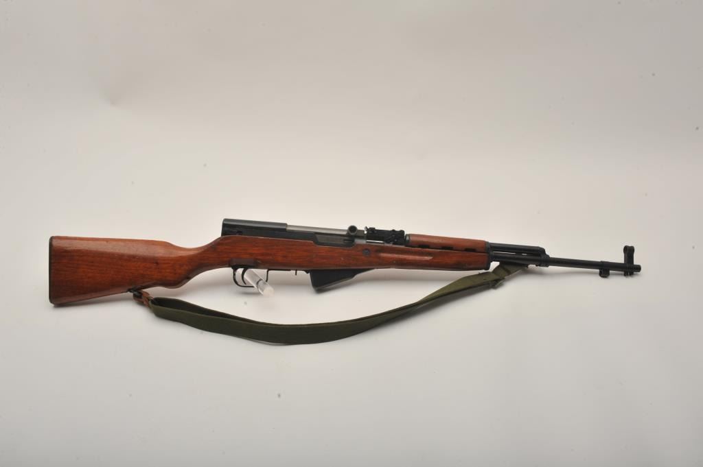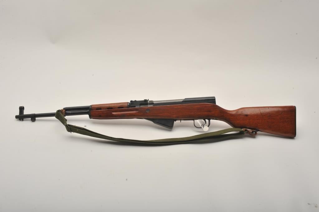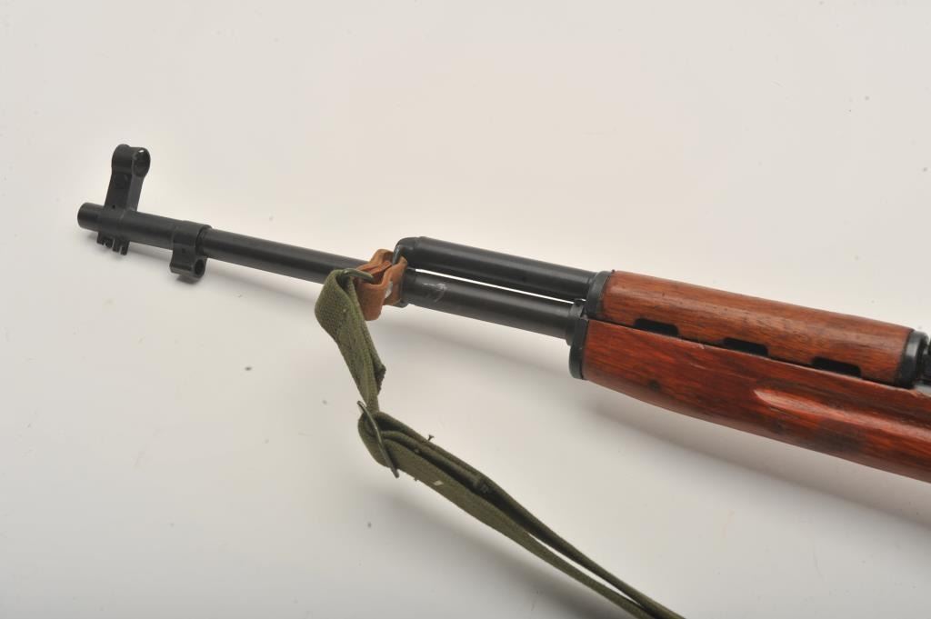 Chinese SKS semi-automatic rifle, 7.62 x 39 mm caliber, 19.5” barrel, black finish, wood stock and olive green woven sling, S/N 122047701, in overall very good + condition with a very good bore, crisp action and verygood wood. (Modern). Est.: $175-$350.