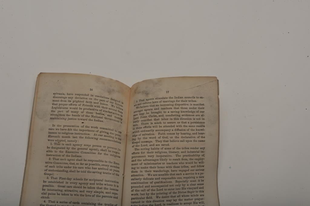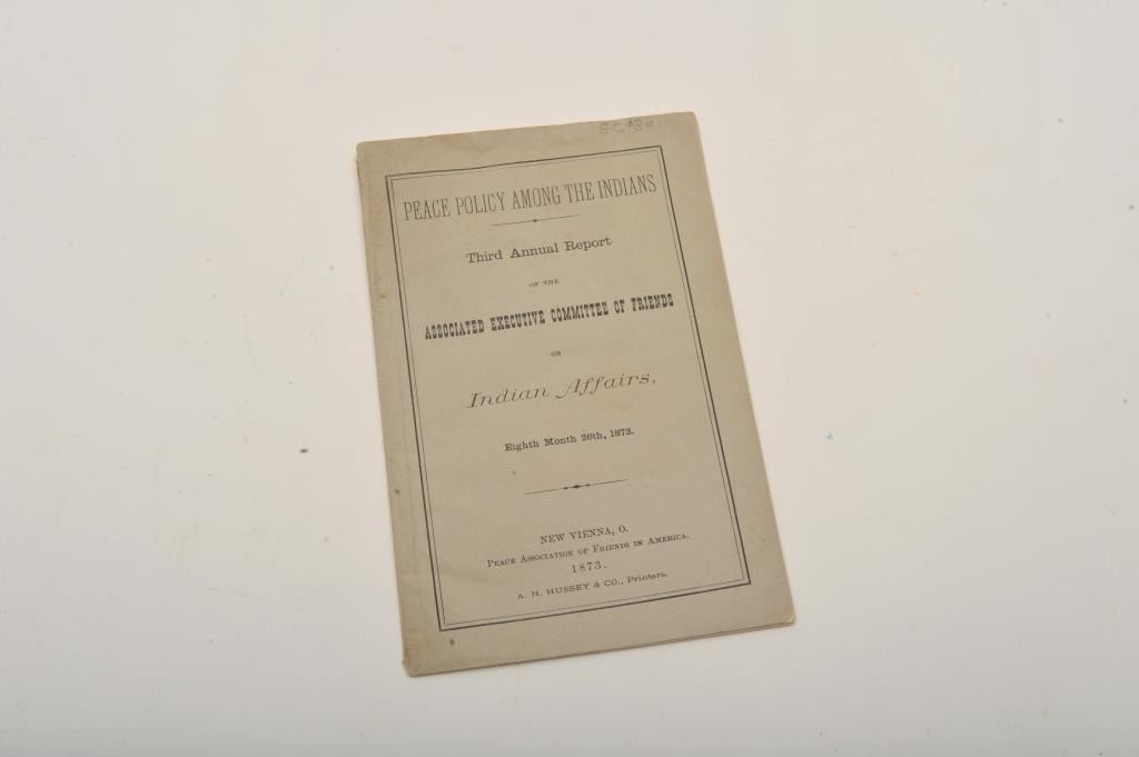 Pocket booklet entitled “Peace Policy Among the Indians/Third Annual Report dated 1873 and issued by the Peace Association of Friends in America. Est.: $150-$300.
