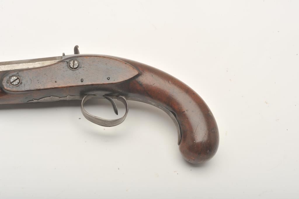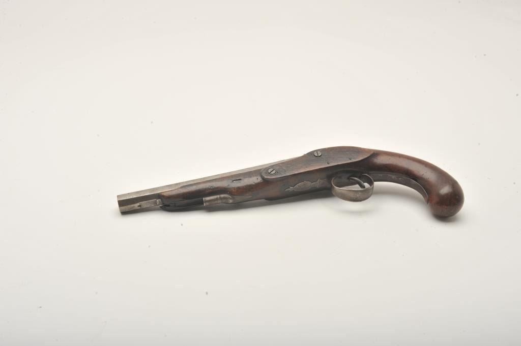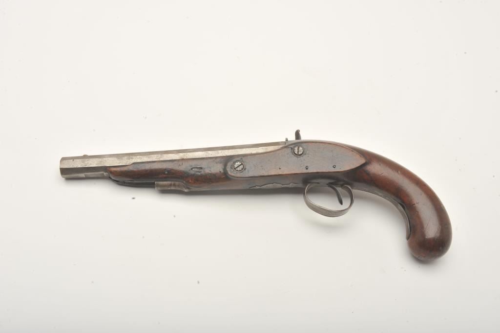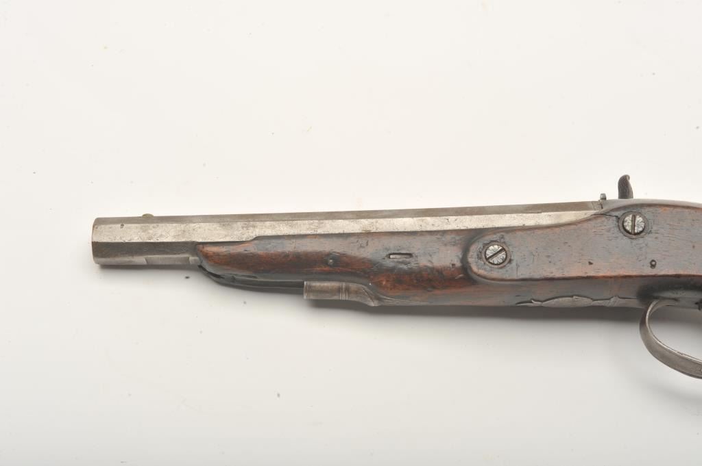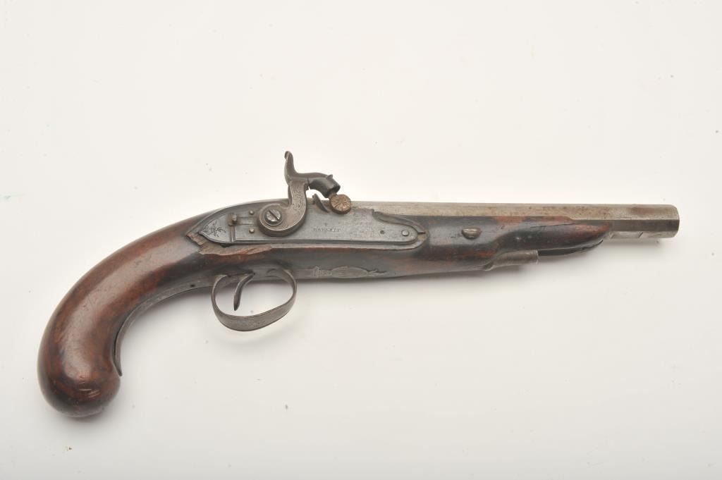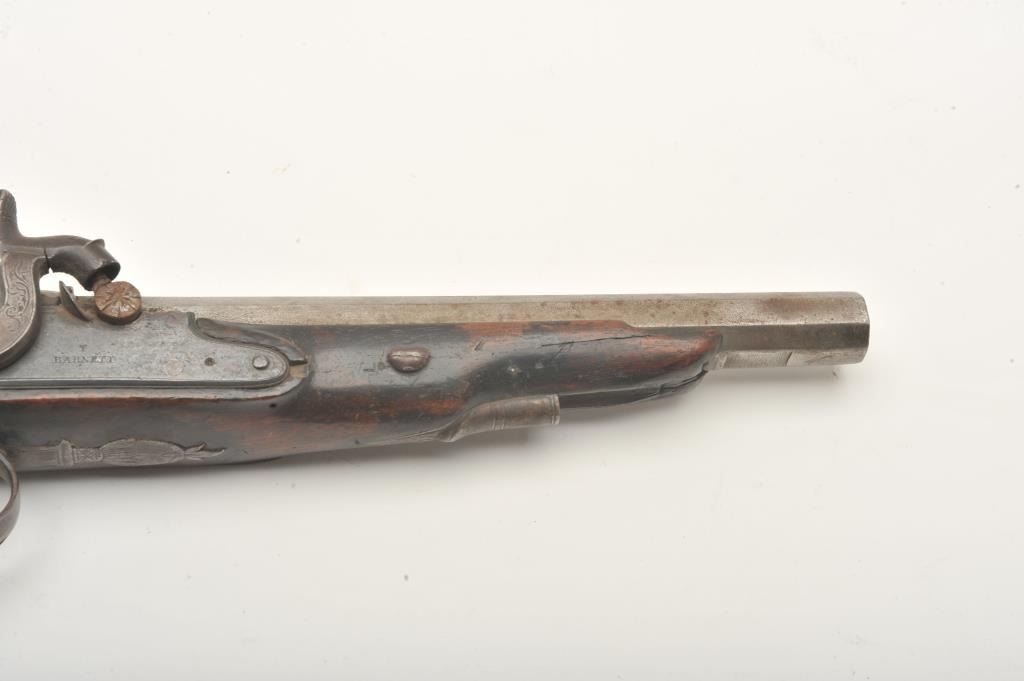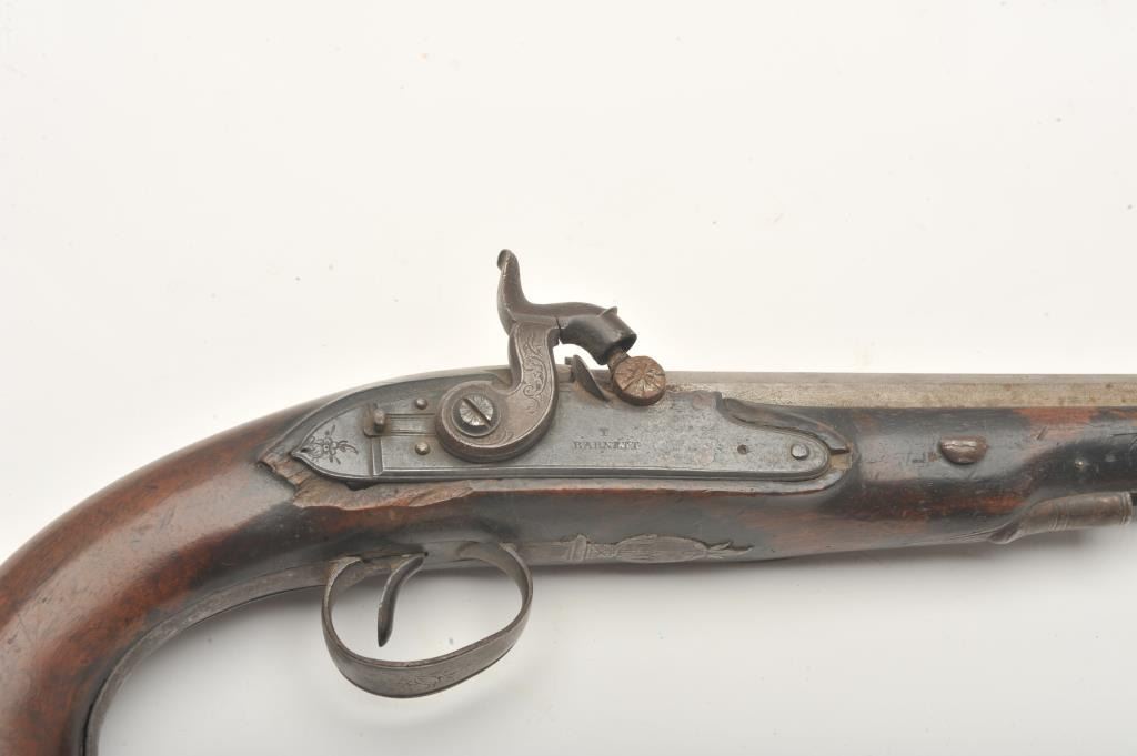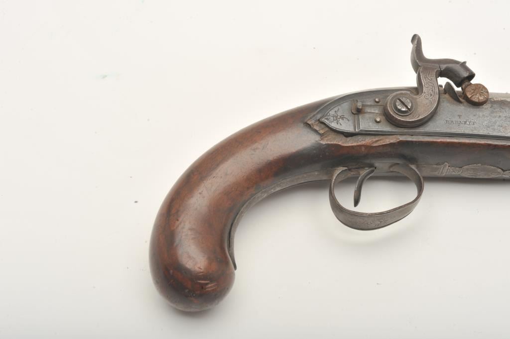 Flintlock pistol converted to percussion marked “T. Barnett” on lockplate, approximately .80 caliber, 14” overall with wood stock, missing ramrod; fair condition with working action, iron mounts, faircondition overall with scattered old losses to some edges of forend and around back of lockplate. (Antique). Est.: $150-$300.