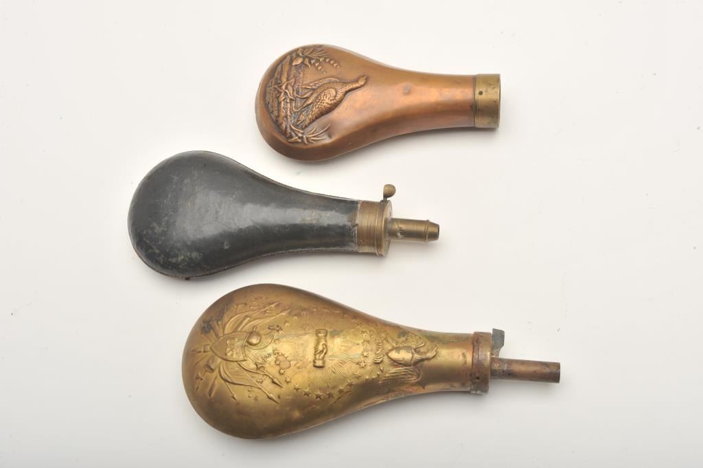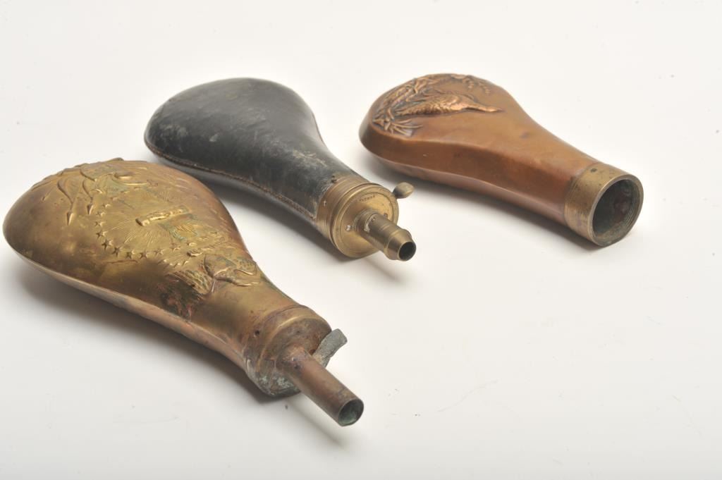 Lot of 3 powder flasks including one reproduction Peace flask and two 19th Century flasks; one leather wrapped the other missing its spout. Est.: $100-$200.
