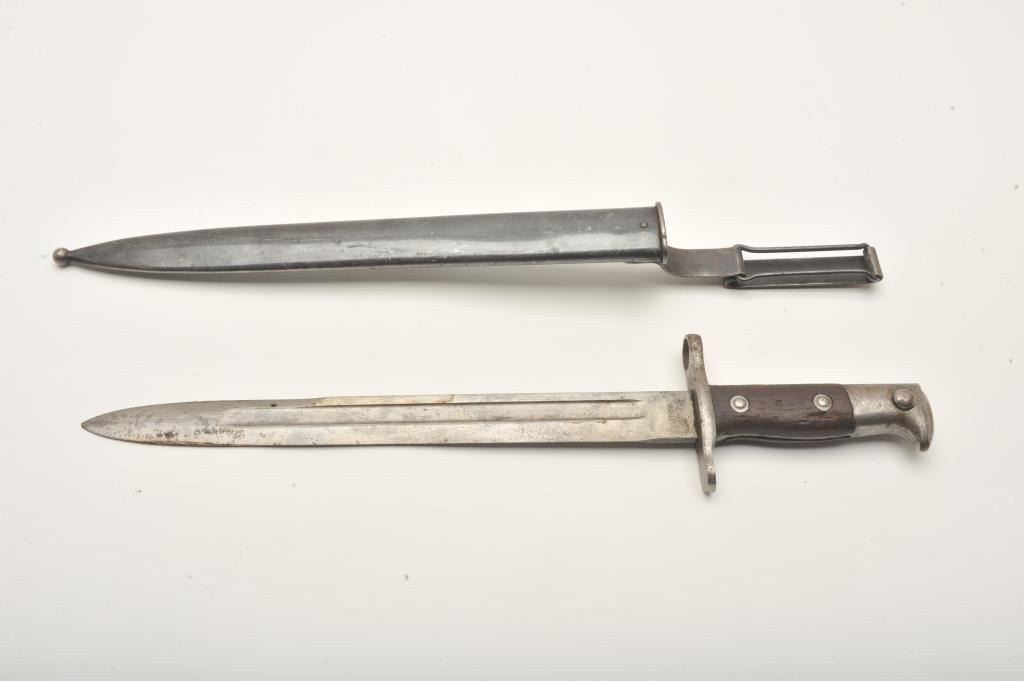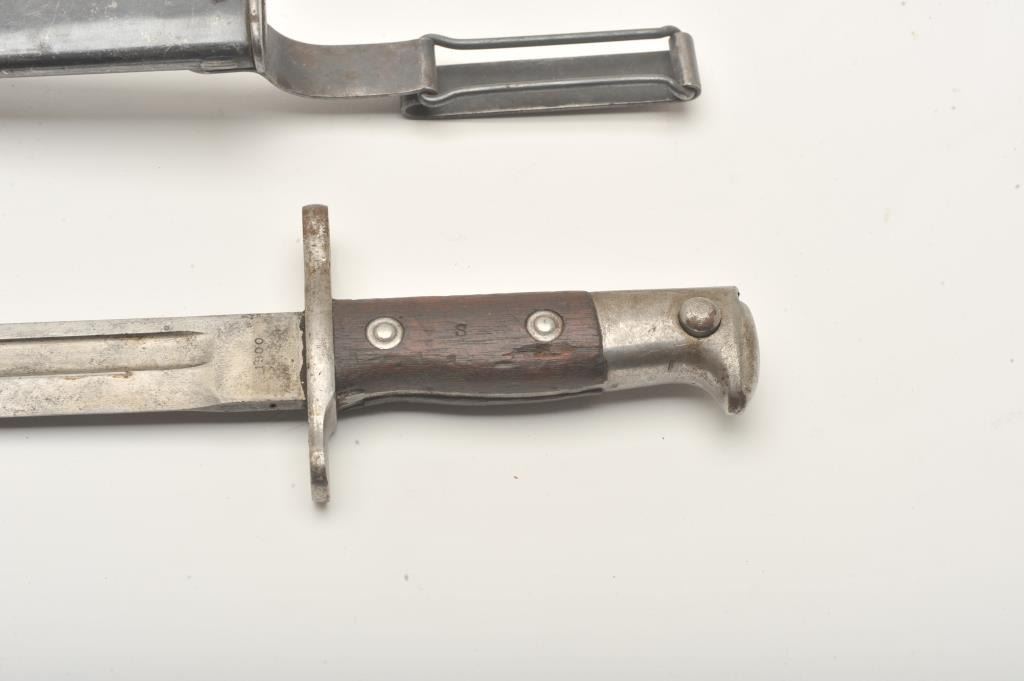 U.S. Krag bayonet, metal sheath and metal hanger; blade is dated 1900 and shows some scattered spots of erosion; wood scales of grip and stamped each with an āSā; sheath displays considerable original blueremaining. Est.: $100-$200.