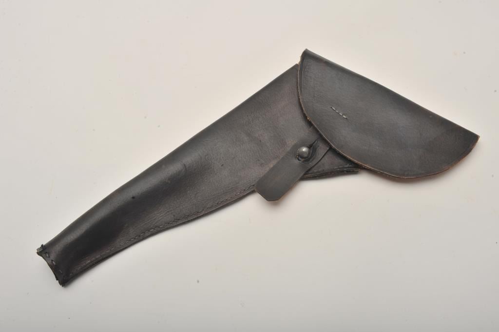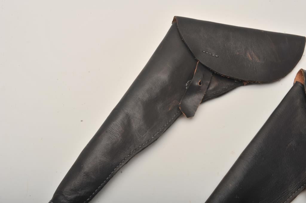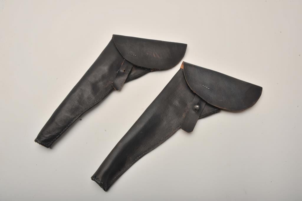 Lot of 2 costume military style flap leather holsters ca. 1940’s-60’s; possibly used in Civil War classic movies and appear to be for Colt 1860 Army percussion revolvers. Est.: $125-$250.