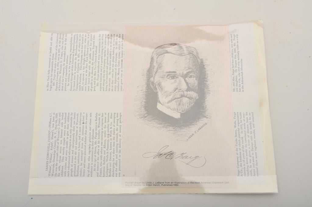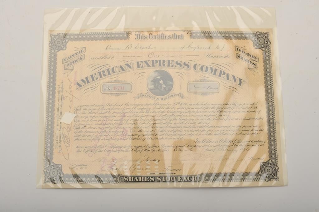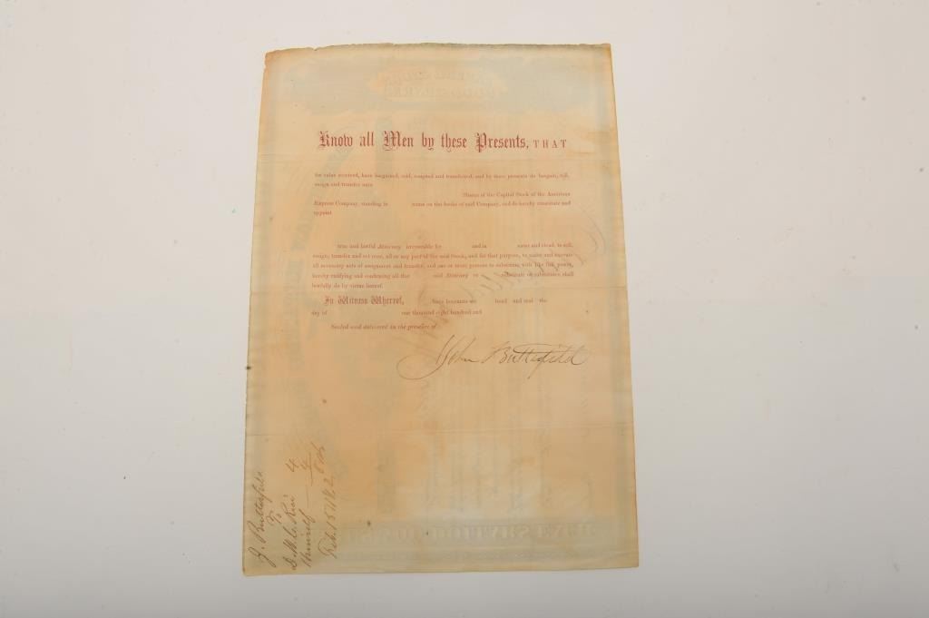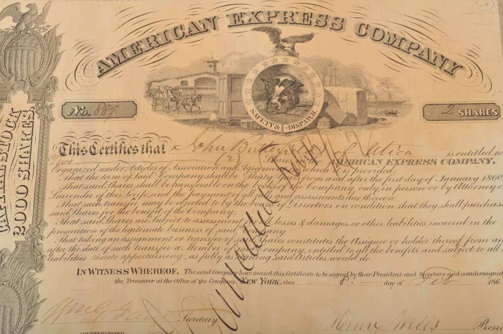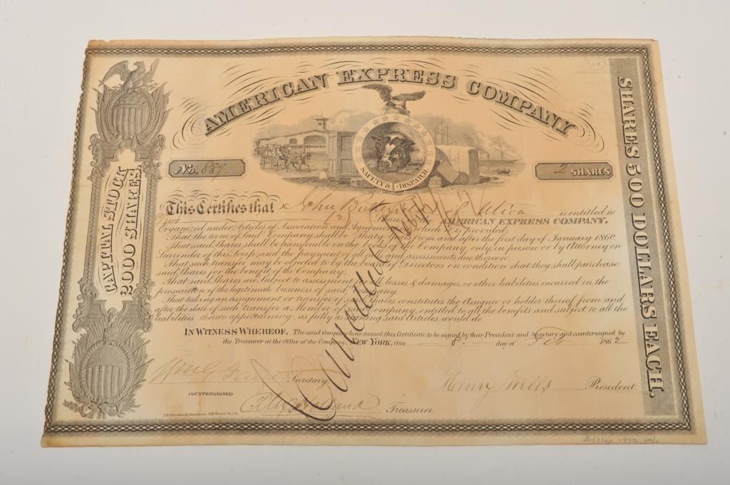 Lot of two American Express Co. Stock Certificates; one dated Feb. 11, 1896 and appearing to have been signed on the lower right corner by W. C. Fargo; the other dated February 8, 1862 and appearing to have beensigned on the lower right corner by Henry Wells and having been issued to John Butterfield of Utica with note on reverse side of clear sleeve indicating “The Stock Certificate was made out to John Butterfieldowner of The Overland Mail Stage at the time. His line started in 1858 from Tipton, Mo to San Francisco. His autograph on the back is a little extra bonus for you”. Est.: $100-$200.