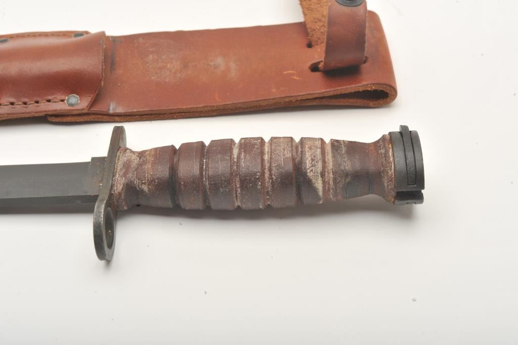 Camillus bayonet with leather sheath. The bayonet is approximately 11 ¼” in overall length with a 6 ½” blade and stacked leather grip in good overall condition. The blade is in fine overall condition showing little ifany use. The lot includes a leather Camillus marked belt sheath with lanyard tie down. Est.: $40-$80.