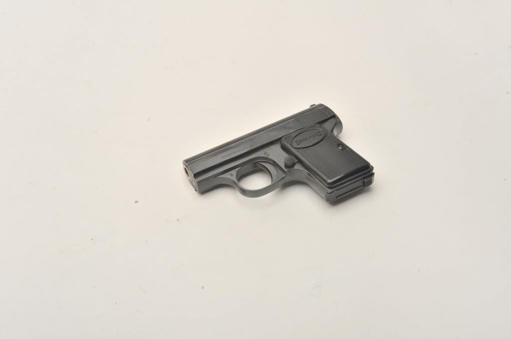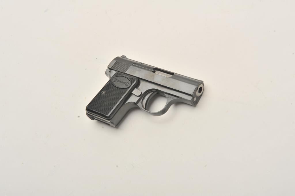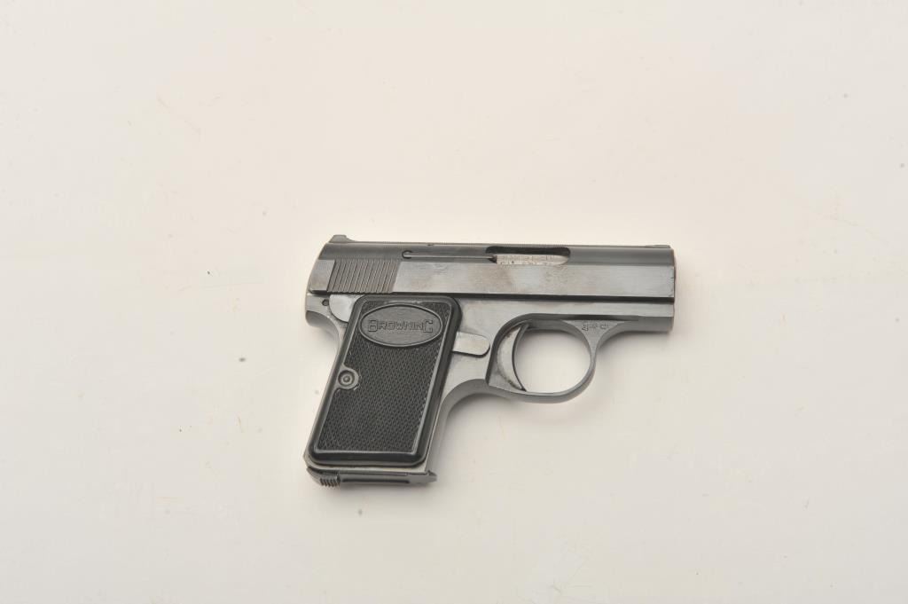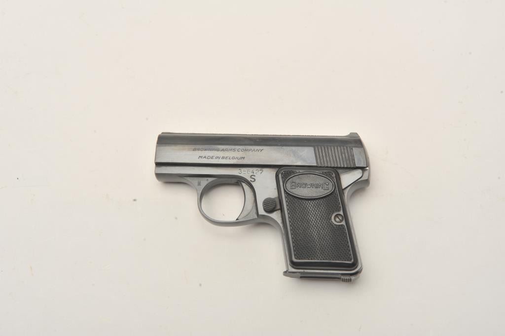 Belgian-made Browning baby pocket semi-automatic pistol, 6.35mm caliber, 2” barrel, blued finish, checkered black grips, S/N 356427, in overall near new condition. (Modern/PPT). Est.: $200-$400.