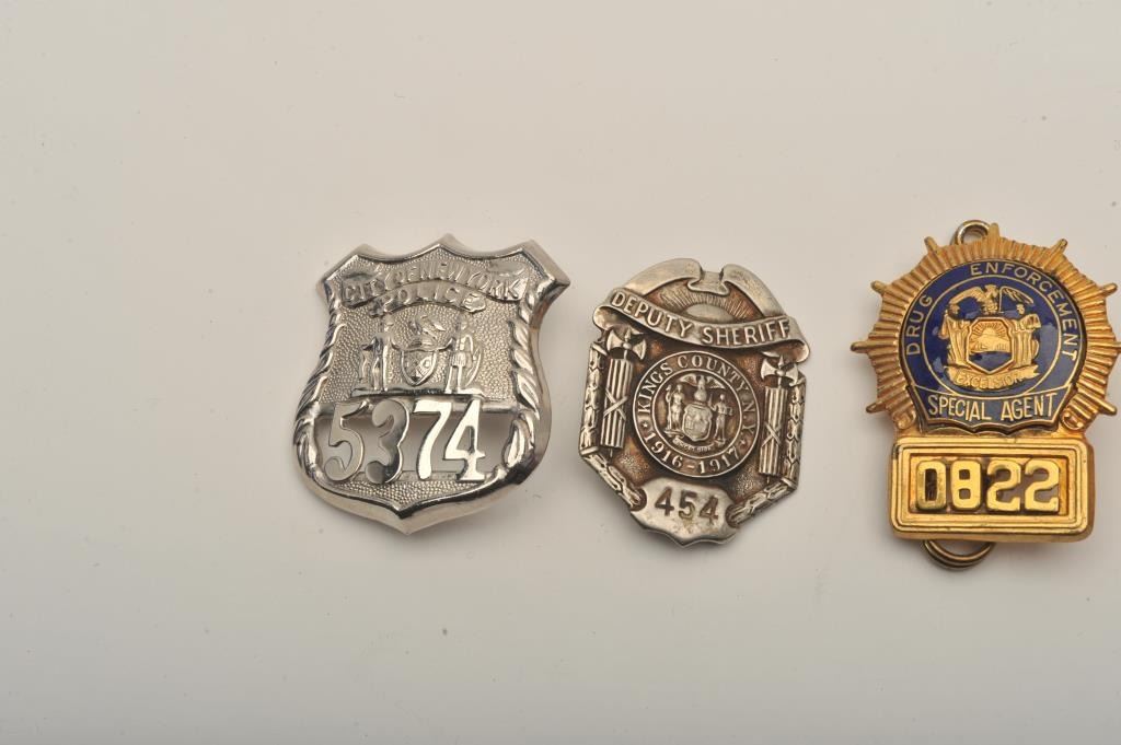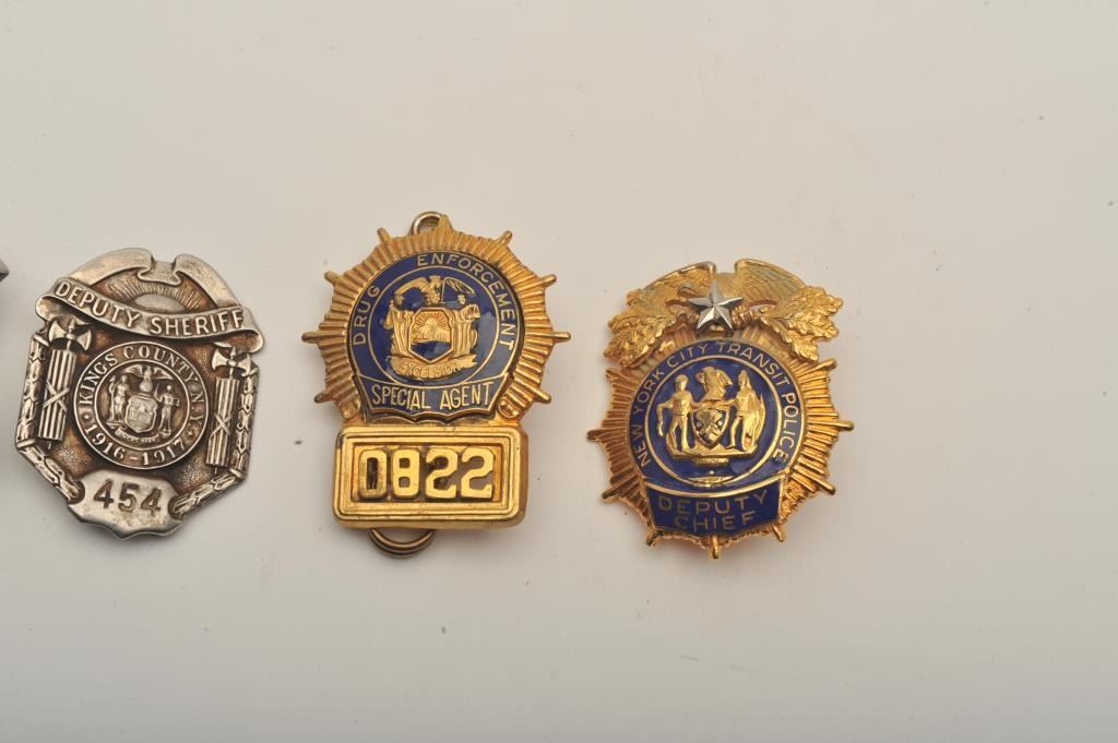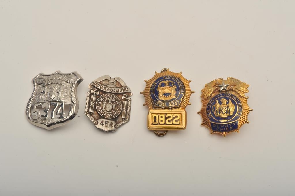 Lot of 4 badges including a Deputy Sheriff Kings County N.Y. pin shield badge, #454, a Drug Enforcement Special Agent cap badge #0822, a New York City Transit Police Deputy Chief cap badge and a City of New York Police cap badge, #5374. Est.: $200-$400.