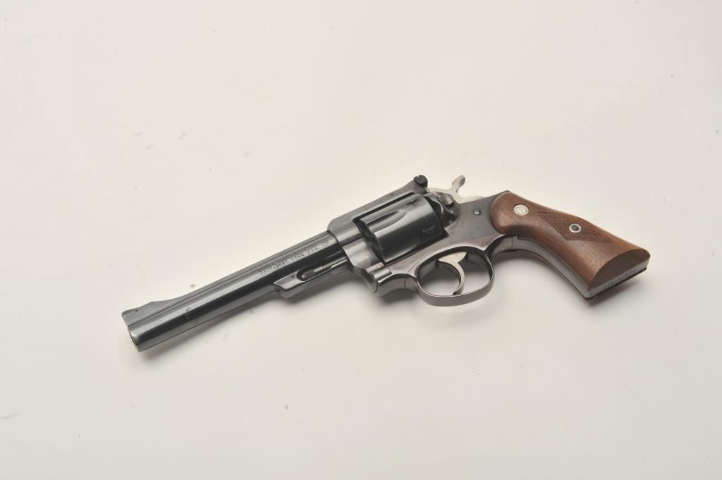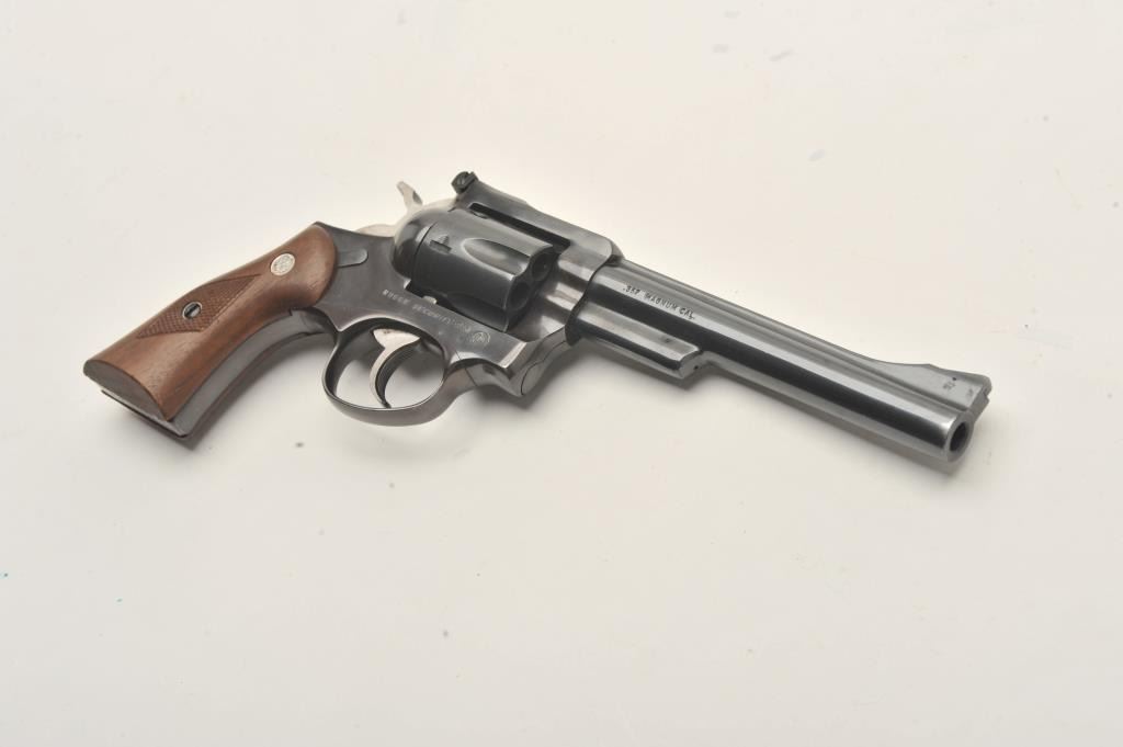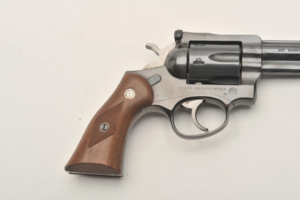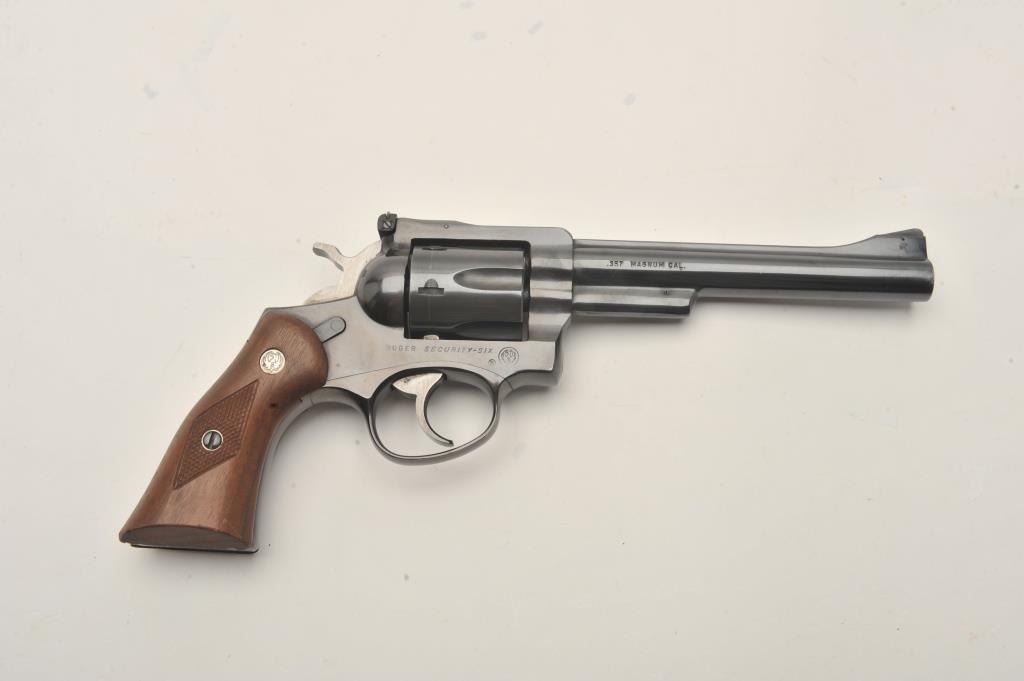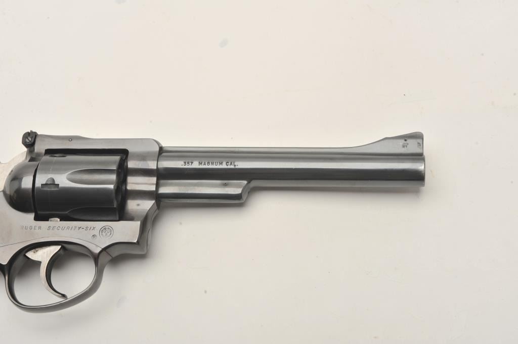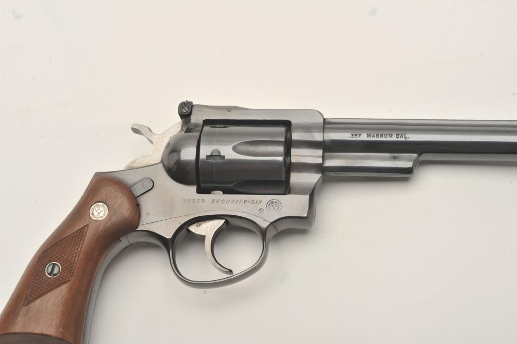Ruger Security Six single action revolver, .357 Magnum caliber, 6” barrel, blued finish, checkered wood medallion grips, S/N 150-61679, in overall very good + condition displaying the majority of its originalfinish with some muzzle and high point wear and a couple very minor spots of surface rust on the barrel, very good bore, crisp action, sharp markings and very good + grips. (Modern/PPT). Est.: $250-$500.