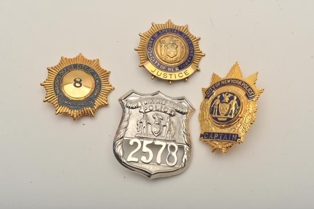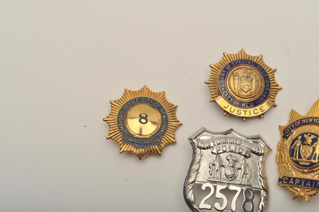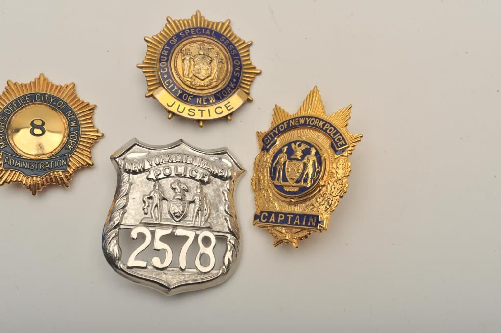 Lot of 4 badges including a City of New York Court of Special Sessions Justice pin shield badge (hallmark Johnson National/N.Y.), a City of New York Mayor’s Office Administration #8 pin Captain cap badge and a New York City Transit Police cap badge #2578. Est.: $200-$400.
