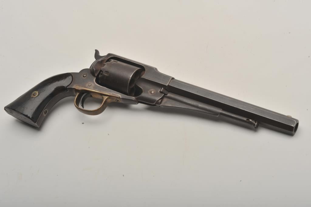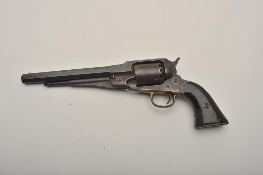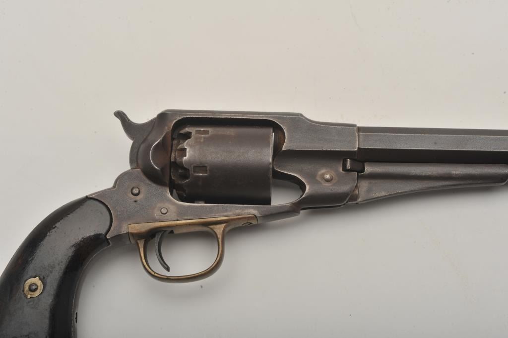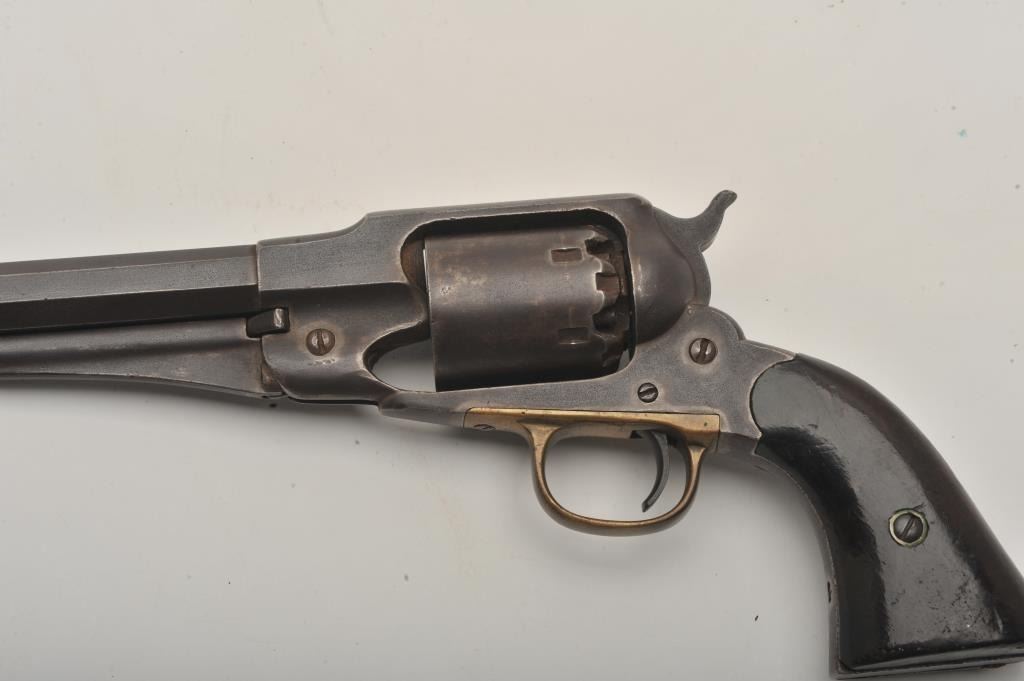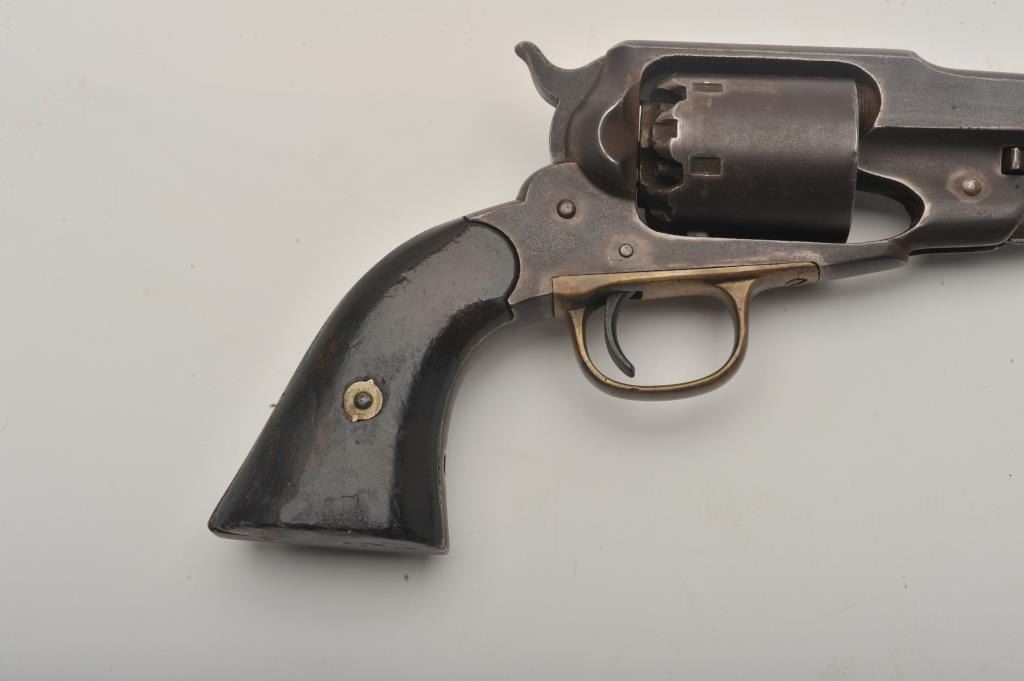 Remington Model 1858 single action percussion revolver, .44 caliber, 8” octagon barrel, dark patina to metal surfaces, wood grips, S/N 37865, in overall good condition with an even brown patina to metal, crisp action,grips fair to good with some small old repairs to chips in butt areas. (Antique). Est.: $400-$800.