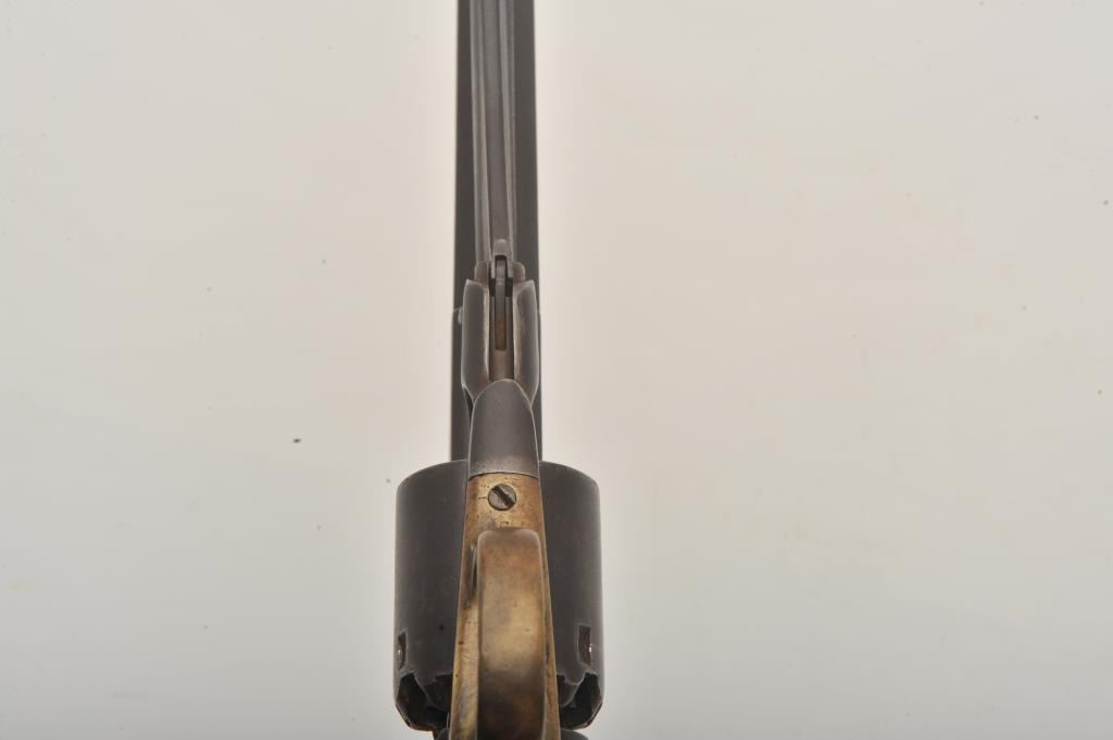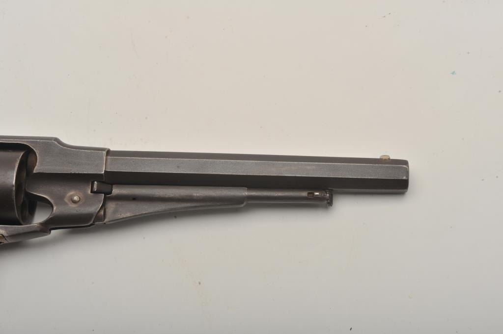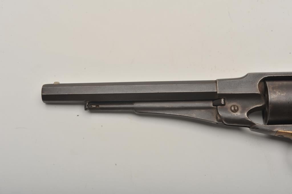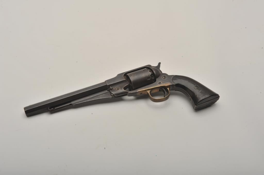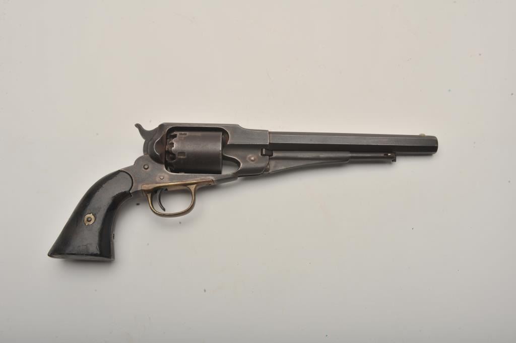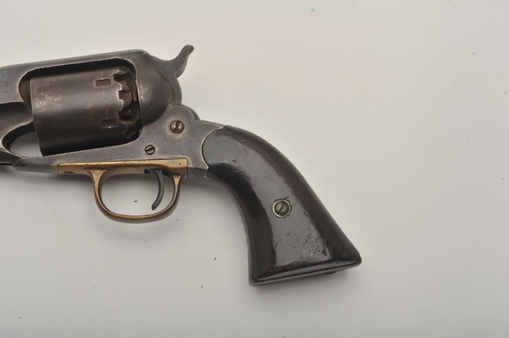Remington Model 1858 single action percussion revolver, .44 caliber, 8” octagon barrel, dark patina to metal surfaces, wood grips, S/N 37865, in overall good condition with an even brown patina to metal, crisp action,grips fair to good with some small old repairs to chips in butt areas. (Antique). Est.: $400-$800.