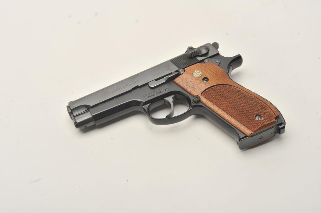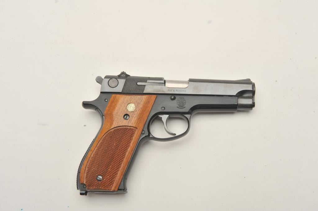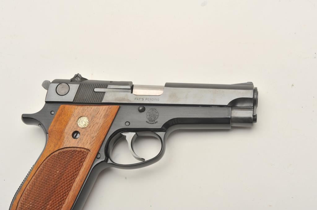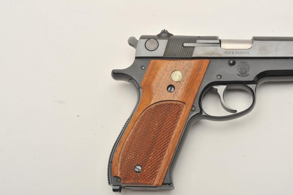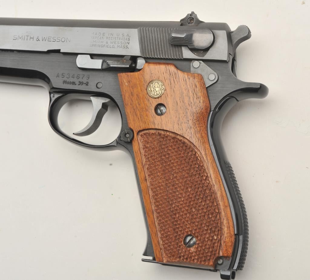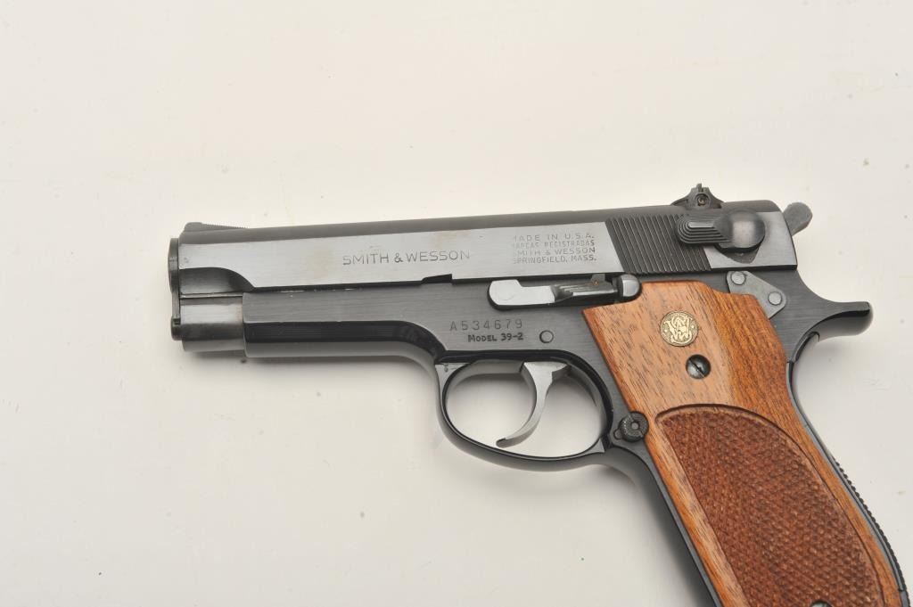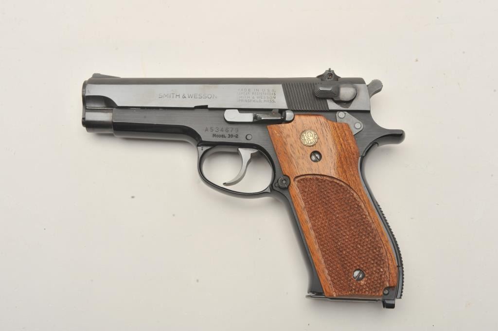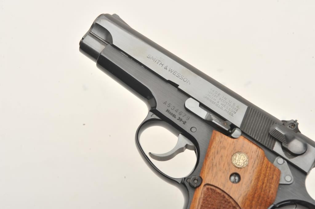 Smith & Wesson Model 39-2 DA semi-automatic pistol, 9mm caliber, 4” barrel, blued finish, checkered wood S&W medallion grips, S/N A534679, in near new condition with factory two piece blue cardboard box displaying endlabel matched to this gun, instructions and cleaning rod. (Modern/PPT). Est.: $300-$600.