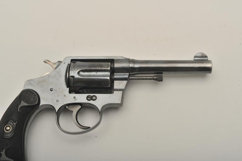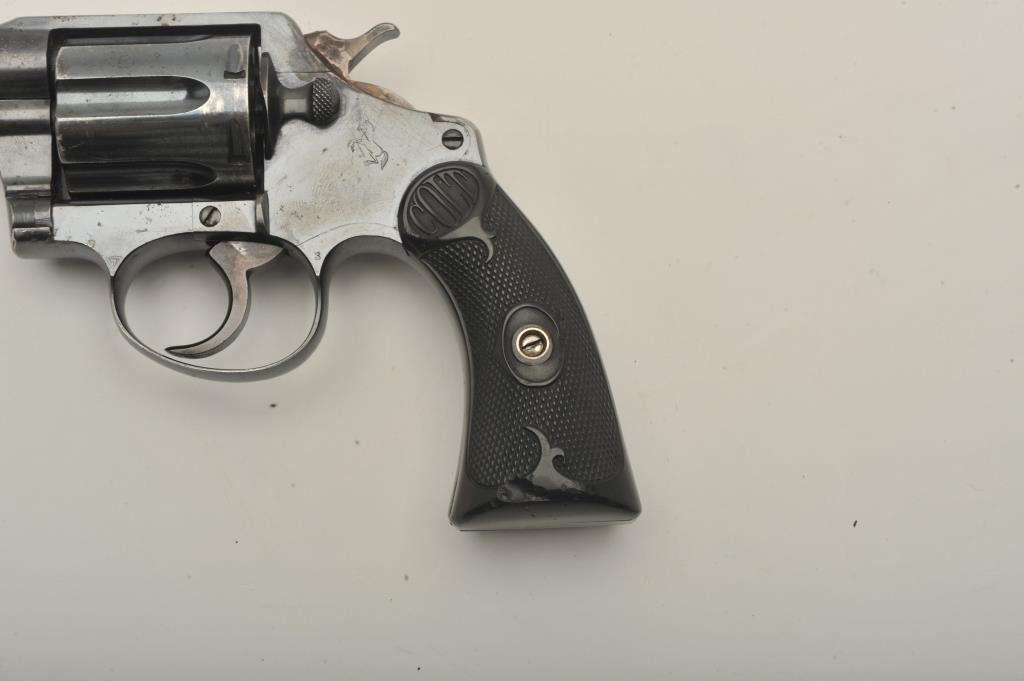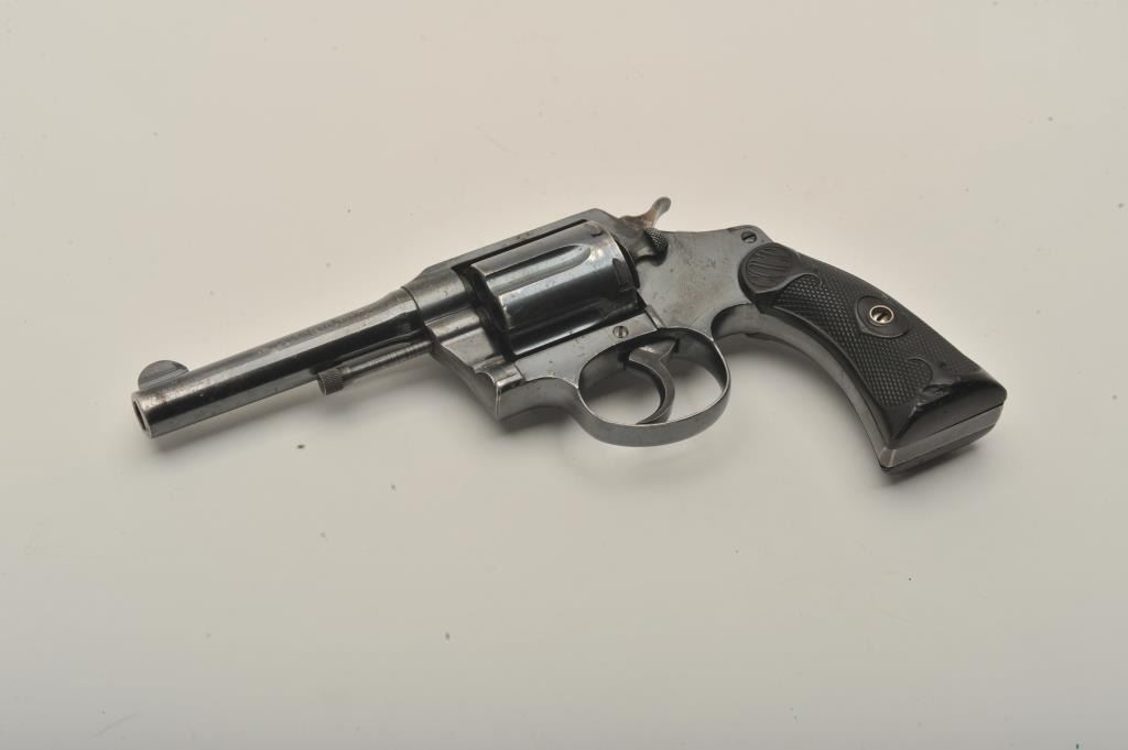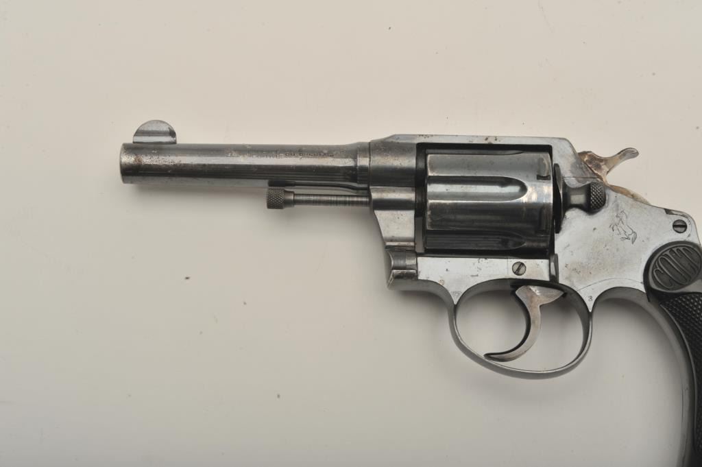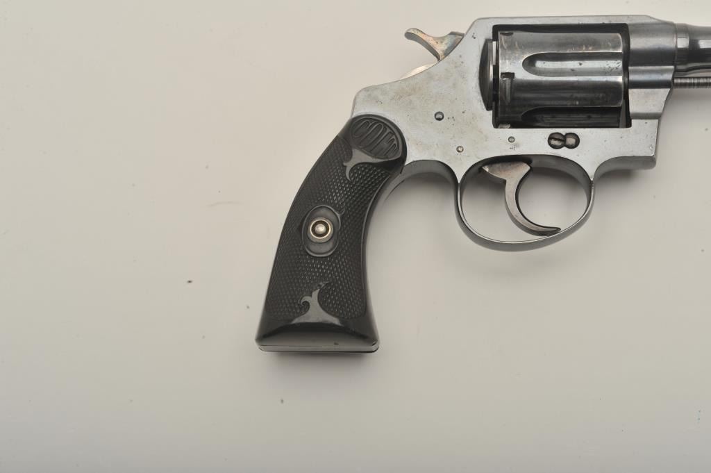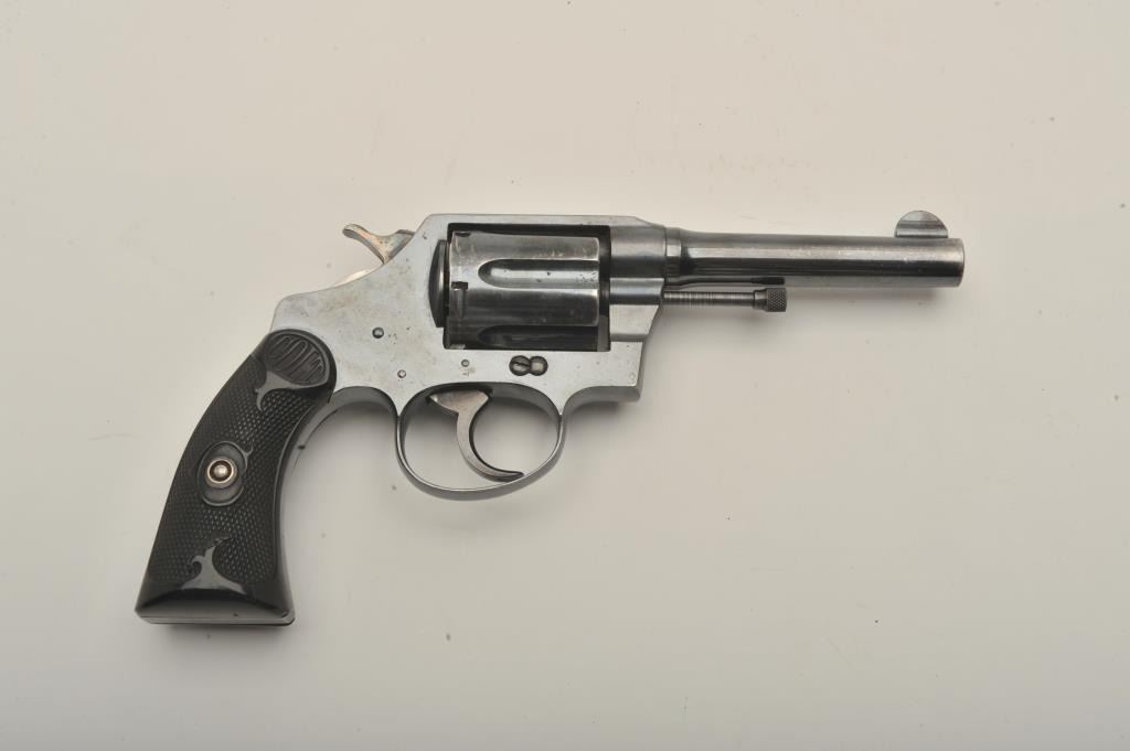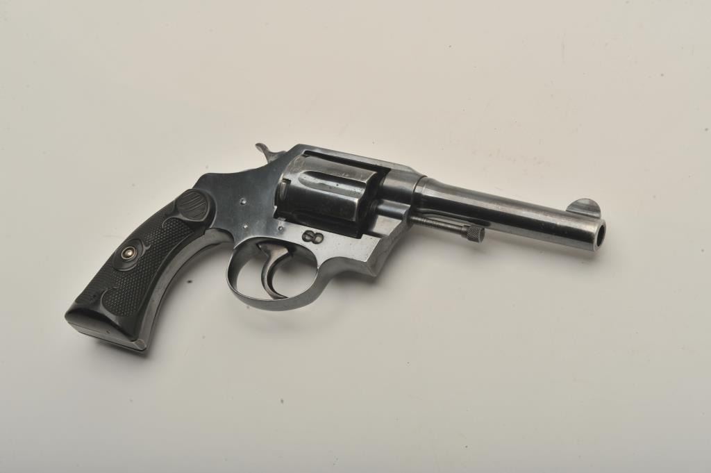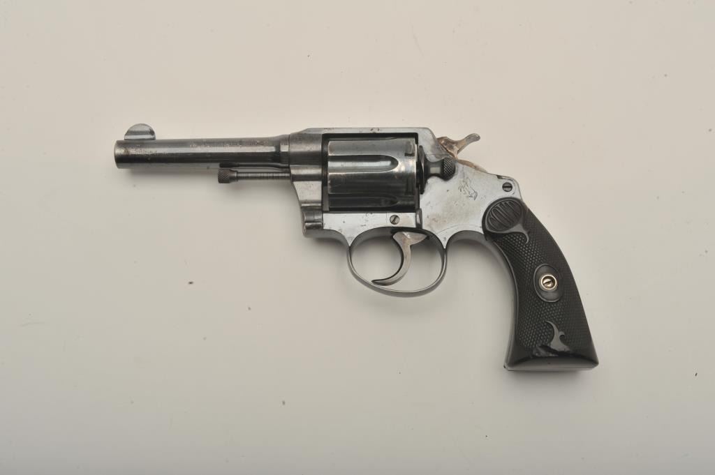 Desirable Colt Police Positive DA revolver, .38 Special caliber, 4” barrel, high polish blued finish, checkered hard rubber grips, butt strap marked “W.F. & Co.”, S/N 130630; overall very good + condition displayingmajority of original finish, some scattered small spots of erosion and losses primarily to top left side of barrel, very good bore, crisp action, sharp markings and very good grips overall. Accompanied by a Colt factory letter confirming caliber, barrel length, finish, type of stocks “Not Listed”, factory engraved “W.F. & Co.” on butt of revolver, shipped to Wells Fargo and Co. c/o A. G. Brandenburg, General Supply Agent, New York,N.Y. on April 3, 1916, 36 guns in shipment. Also including an e-mail dated March 19, 2015, indicating a statement from Greg Beseth of Historical Militaria Ltd. that this gun was presented to and owned by the Presidentand CEO of Railway Express, Tom Kole, in 1971 and that Railway Express ceased operations in 1975. (C&R). Est.: $500-$1,000.