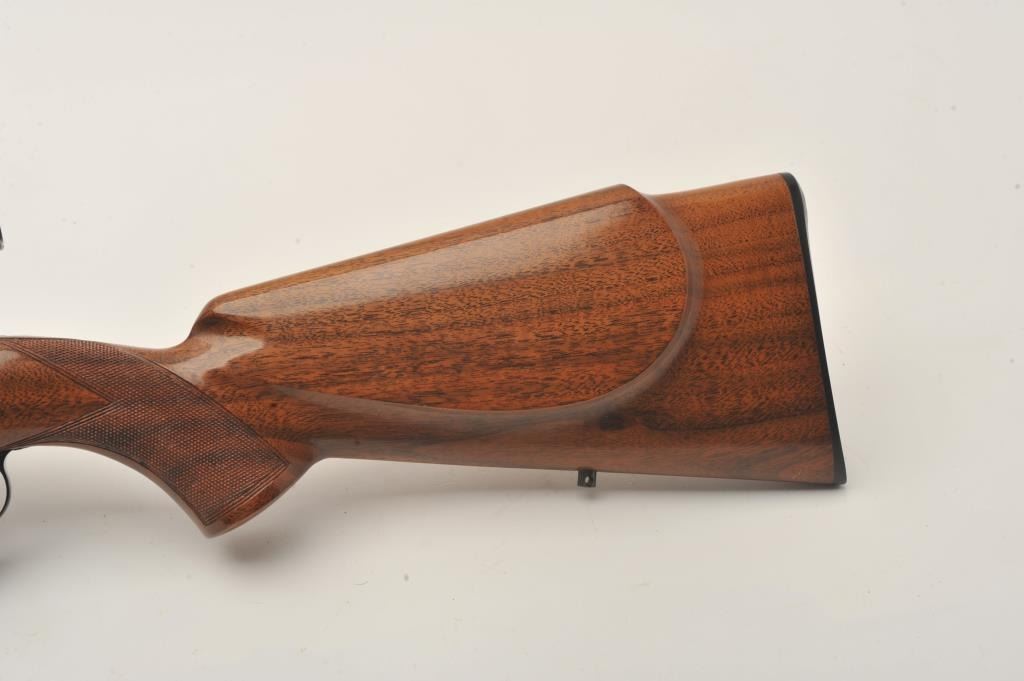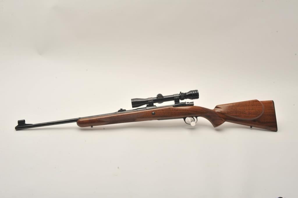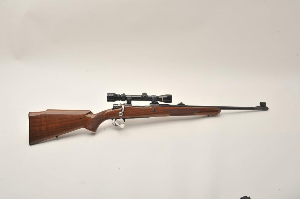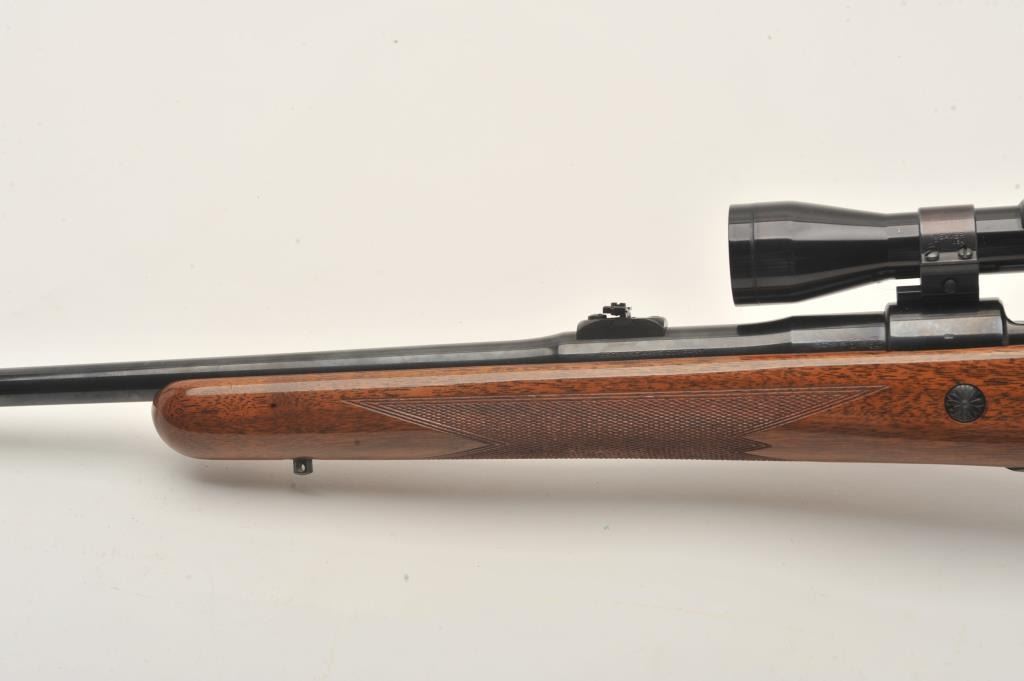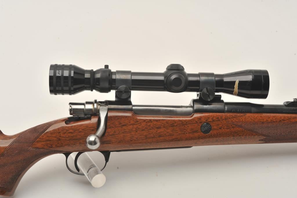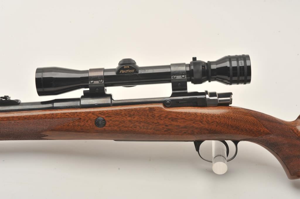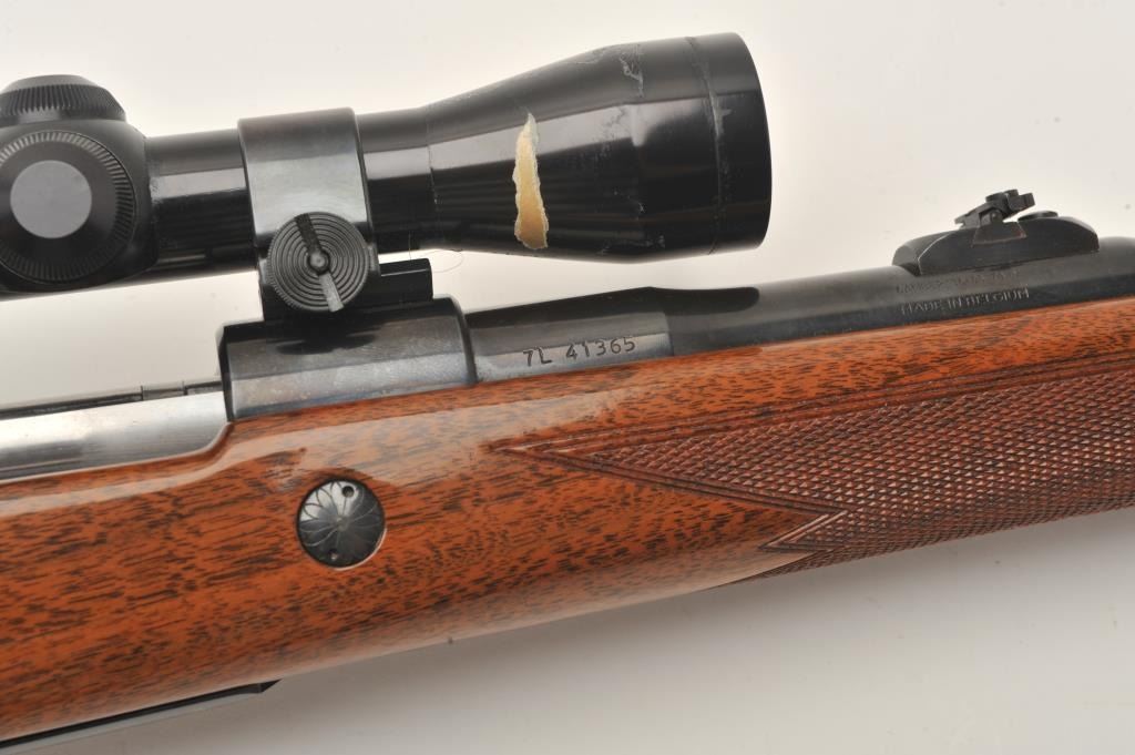 Belgian-made Browning Safari bolt action rifle, .30-06 caliber, 23” barrel, blued finish, checkered wood stock, S/N 7L41365, overall very good to fine condition with a very good bore, crisp action, sharp markingsand fine wood stock; mounted with a Redfield 2x-7x scope with clear optics. (Modern). Est.: $500-$1,000.