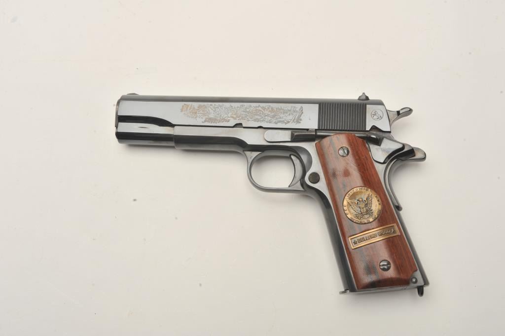 Colt Government Model 1911 semi-automatic pistol, .45 caliber, 5” barrel, blued finish with a WW I Commemorative (1917-1967) Belleau Wood slide and medallion wood grips, S/N C163413, in overall very good to near finecondition as modified, majority of original finish, very good bore, crisp action, sharp markings and very good grips showing two spots of wear to left grip. (Modern/PPT on modern frame). Est.: $700-$1,400.