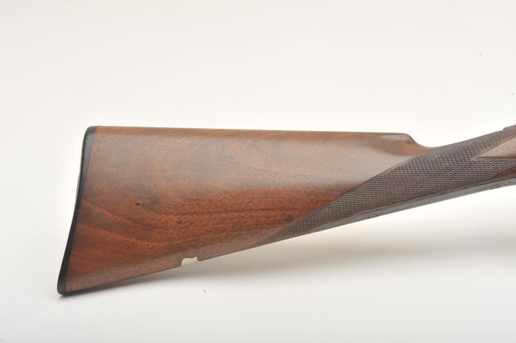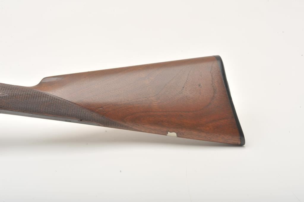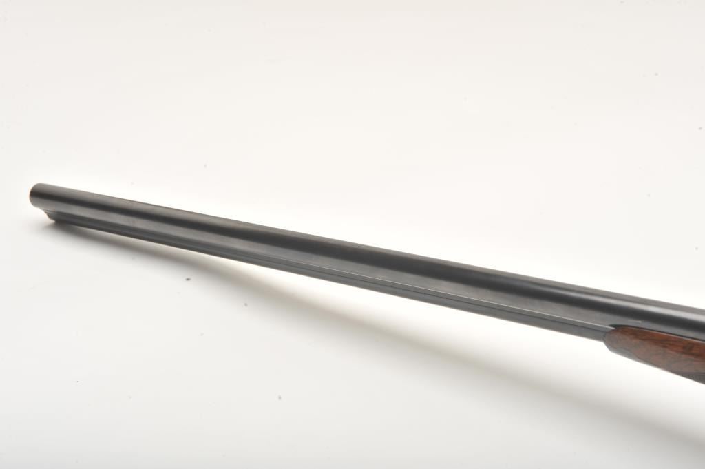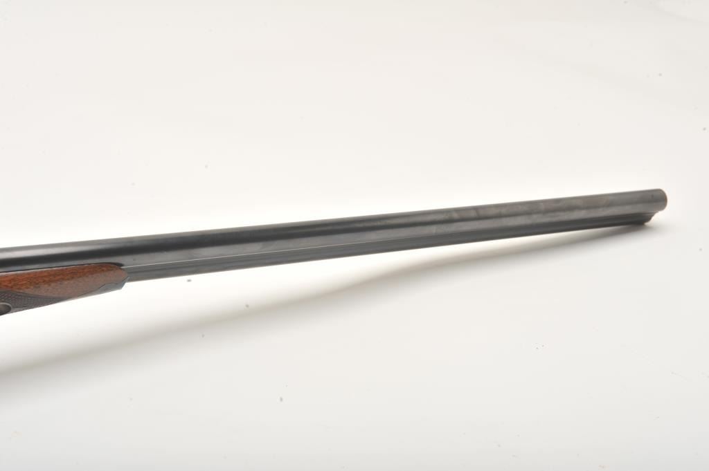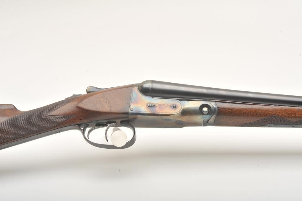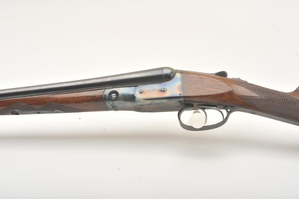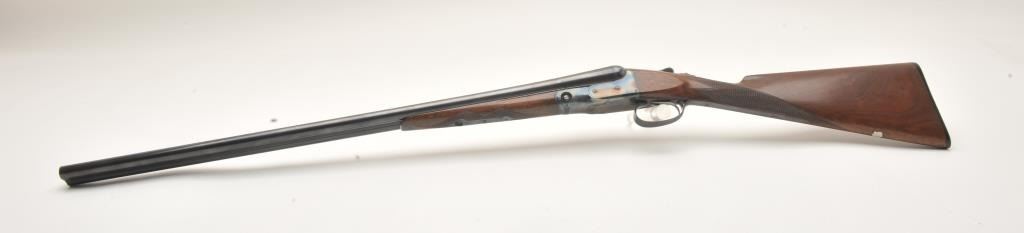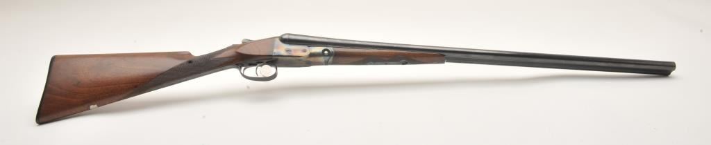 Parker Bros. side by side shotgun, 20 gauge, Serial #99981. The shotgun is in excellent overall condition as re-finished with 28” barrels with a full-length filed rib and steel bead front sight. The barrels retainnearly all of their blue finish. The receiver has been beautifully case colored with tasteful scroll engraving, double triggers and a tang mounted safety. The checkered wood stock is in very goodcondition with a splinter fore end and sharp checkering. The butt stock ends with a plastic, Parker Brothers marked butt plate providing a 14” LOP to the front trigger. The bores good, the action crisp and markings are sharp on this beautifully reconditioned Parker. Est.: $800-$1,600. (C+R).