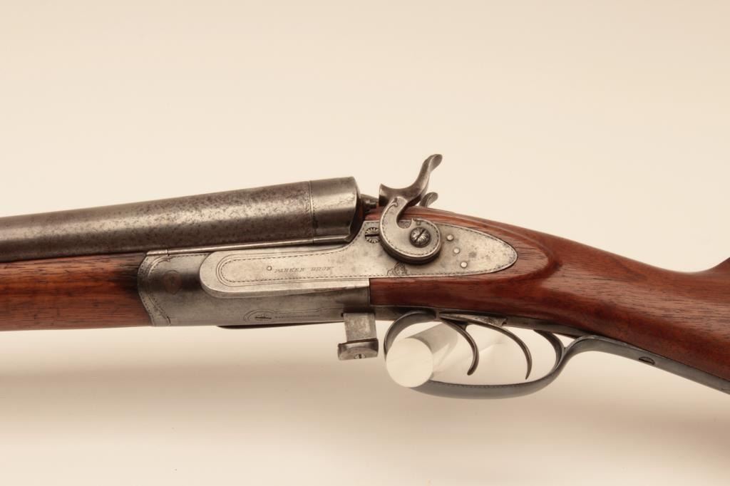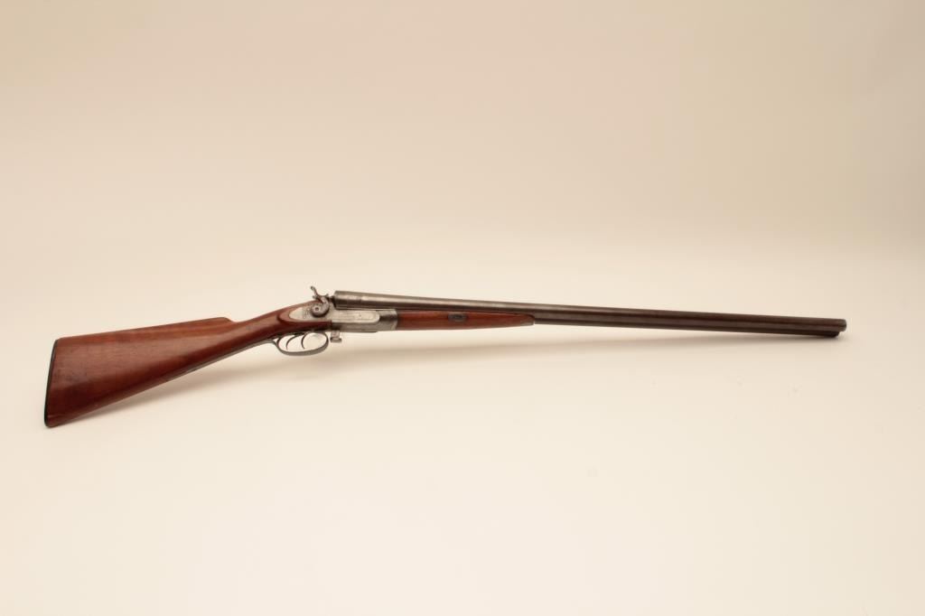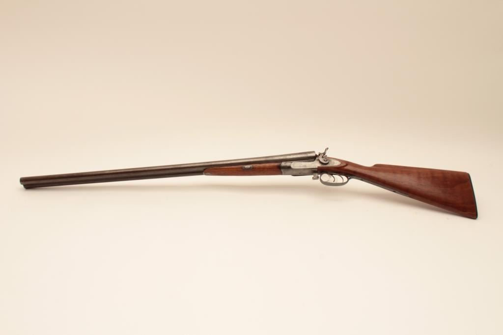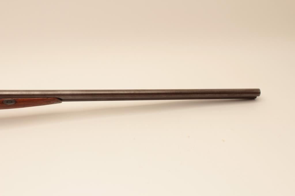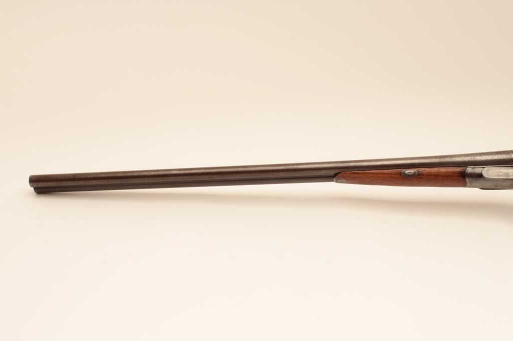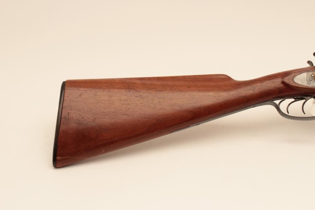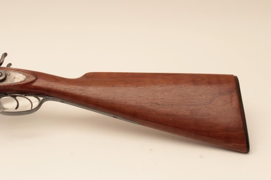 Early bottom release Parker Bros. (1866 PT. Marked) 12GA Damascus shotgun with exposed hammers, S/N 2659 with 30” barrels, double triggers and extractors, and choked full and full. The trigger guard and buttstock havebeen expertly restored and replaced. The gun locks up and functions well with acceptable (fair) bores. Measures 13 7/8” to the end of rubber dog head butt plate. (Antique) Est.: $500-$1000
