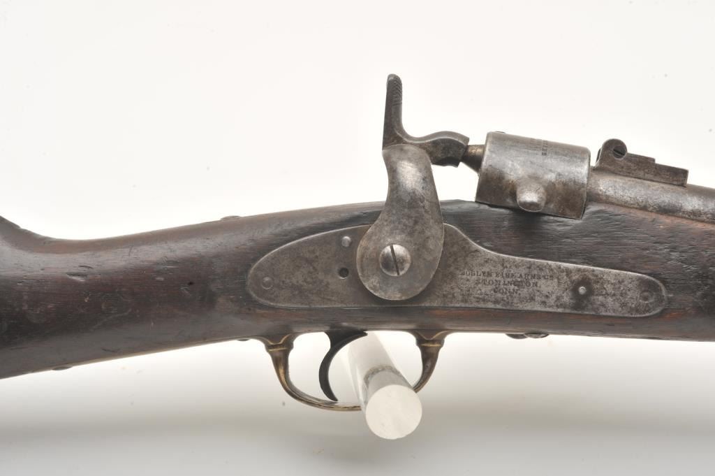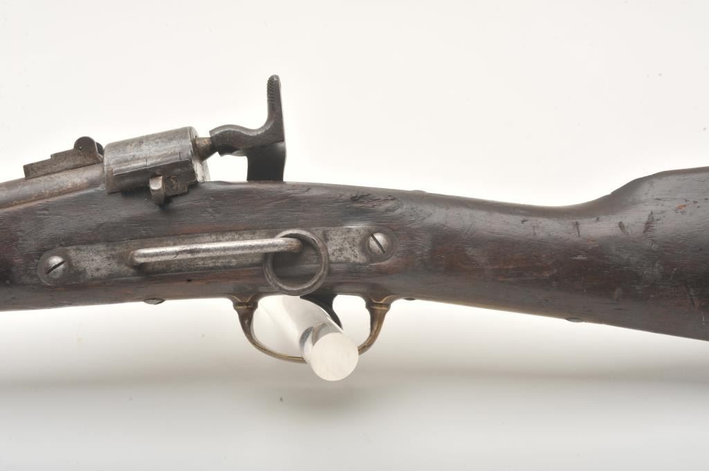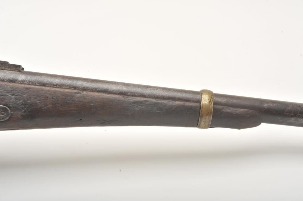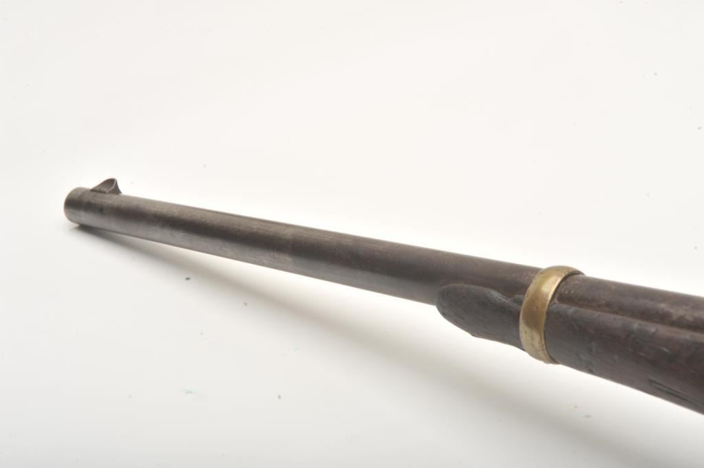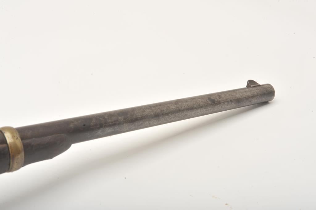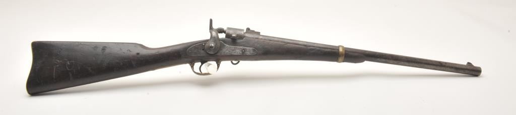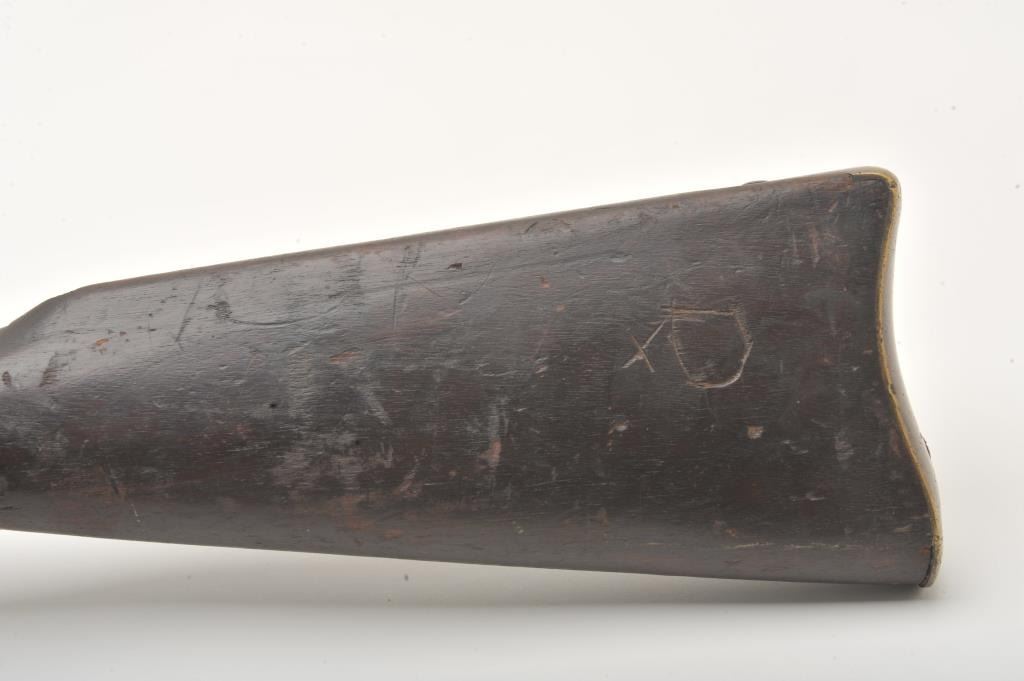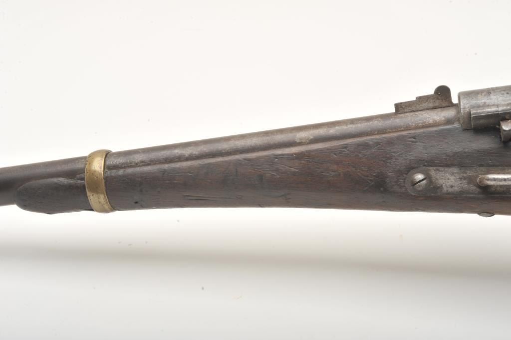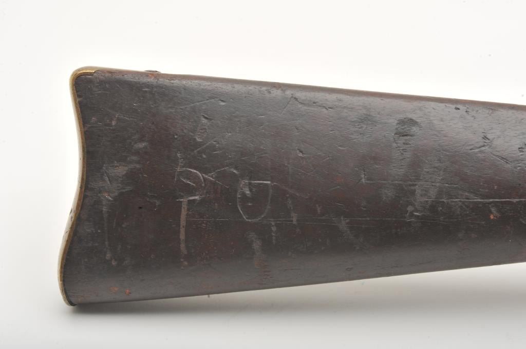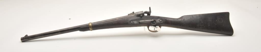 Joslyn Model 1862 Saddle Ring percussion carbine, .52 caliber, Serial #2307. The carbine is in good overall condition with a 22” round barrel. The barrel has gone to a mottled silver/brown patina with areas oflight surface erosion. The receiver has gone to a toned silver patina with the saddle ring intact and all matching visible serial numbers. The carbine features all brass hardware, barrel band, trigger guard and butt plate. The smooth wood stock is in fair condition showing heavy use with mars and dents, crude carvings on both sides of the butt stock and some wood loss at the fore end. The bore in fair, the action is crispand the markings are sharp on this Civil War era carbine. Est.: $900-$1,800. (Antique).