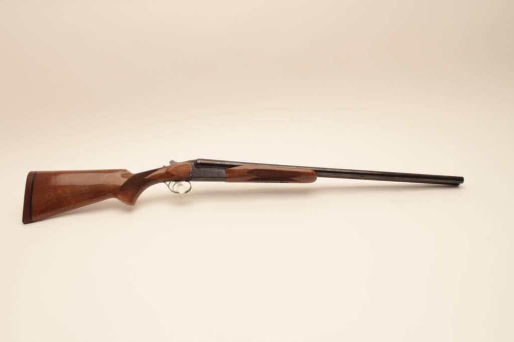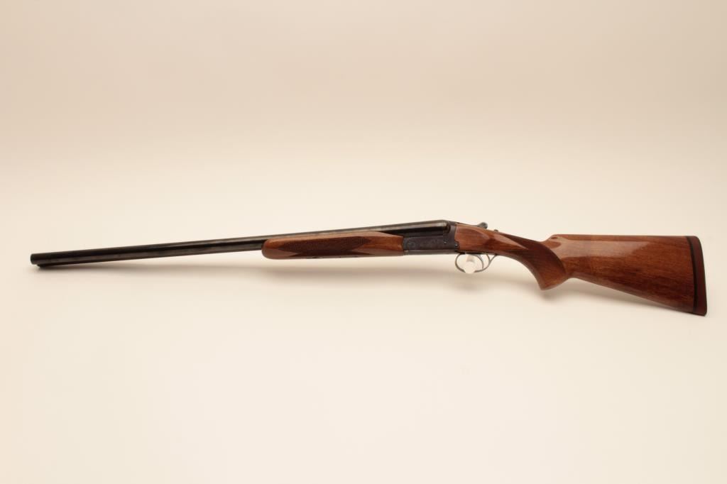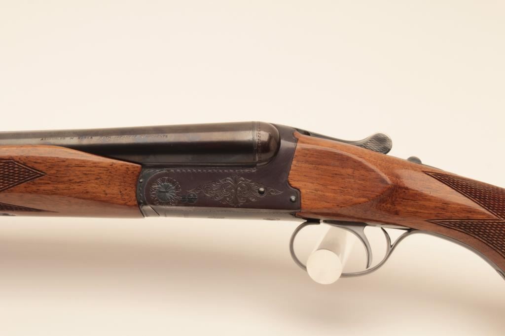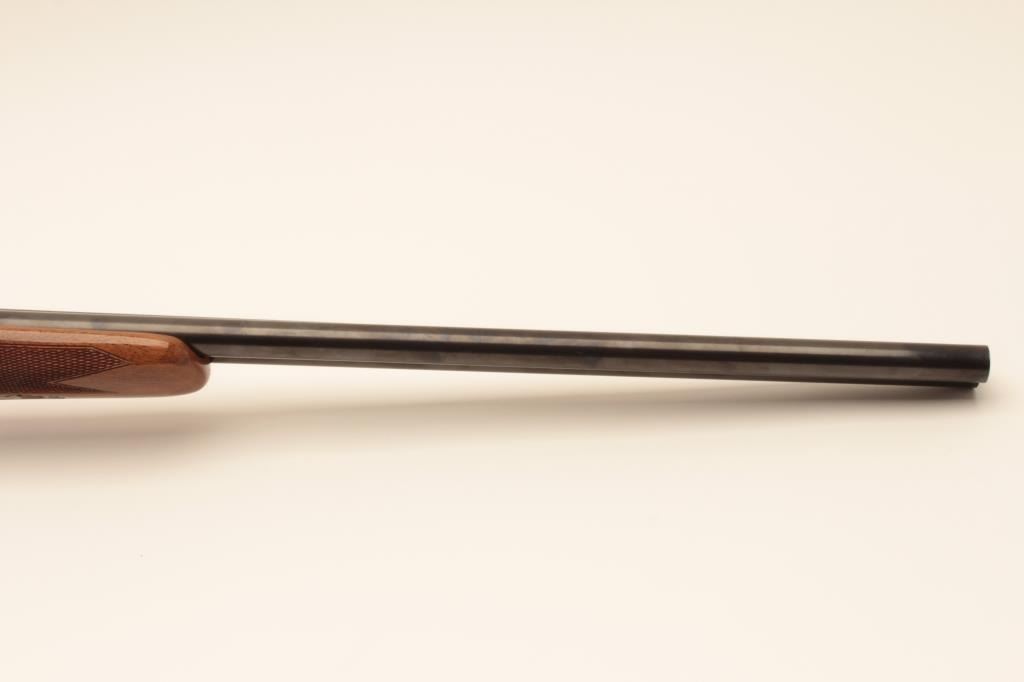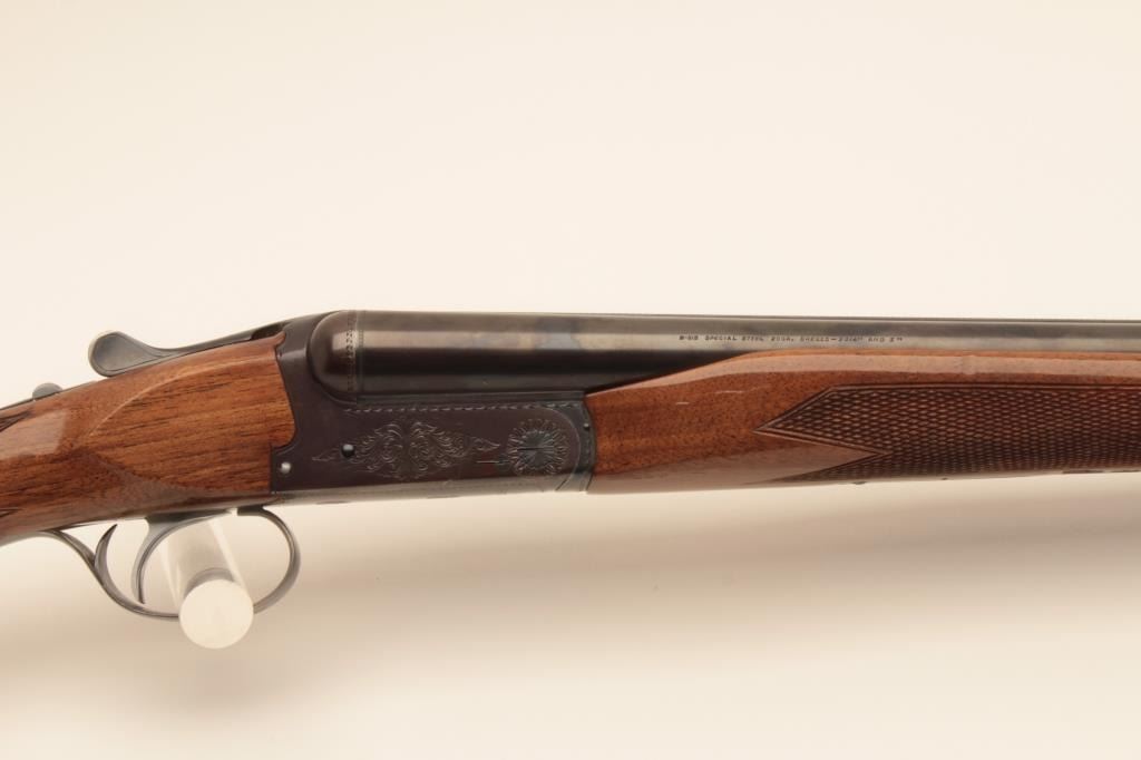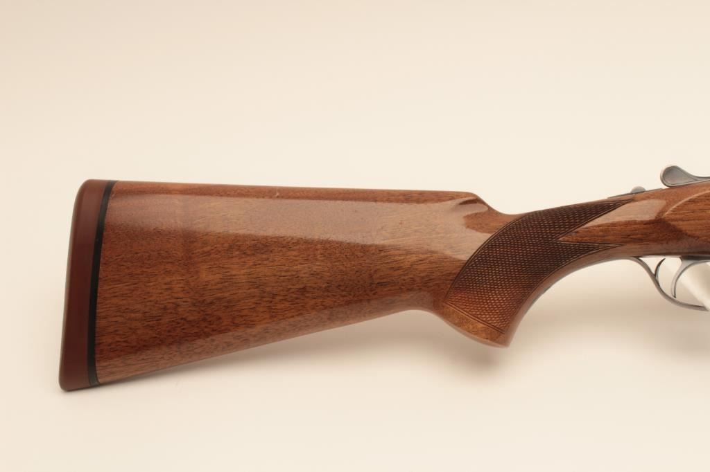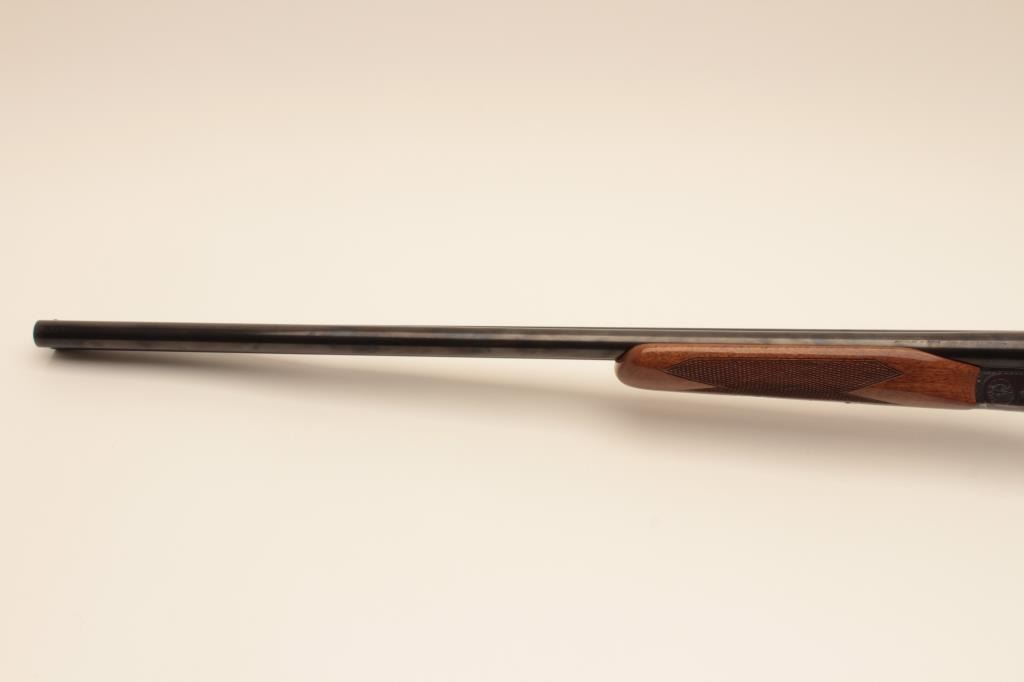 Browning SxS 20GA shotgun in Browning luggage case, S/N 01155. The barrels measure 26”, single trigger and auto ejectors with pistol grip stock and beaver tail fore end. Open or skeet choked. Very good plus conditionshowing 85%-95% original blue. Numerous small use marks in the stock. Locks tight with bright bores. Measures 14 ¼” to the end of the recoil pad. (Modern) Est.: $700-$1400