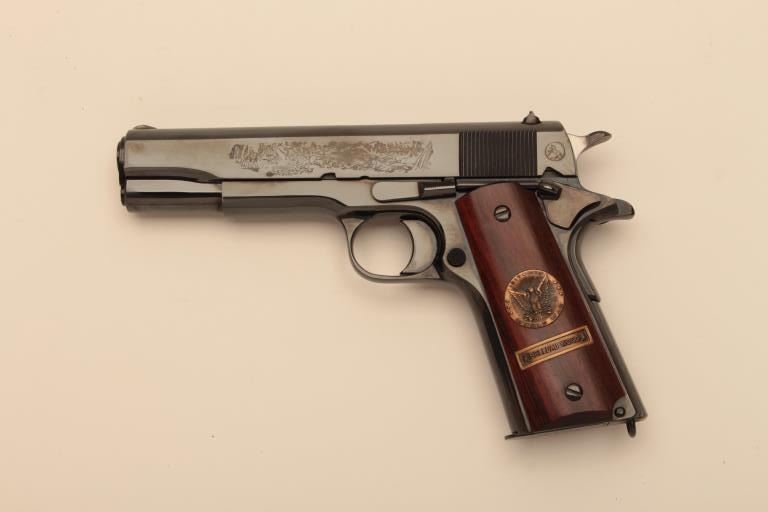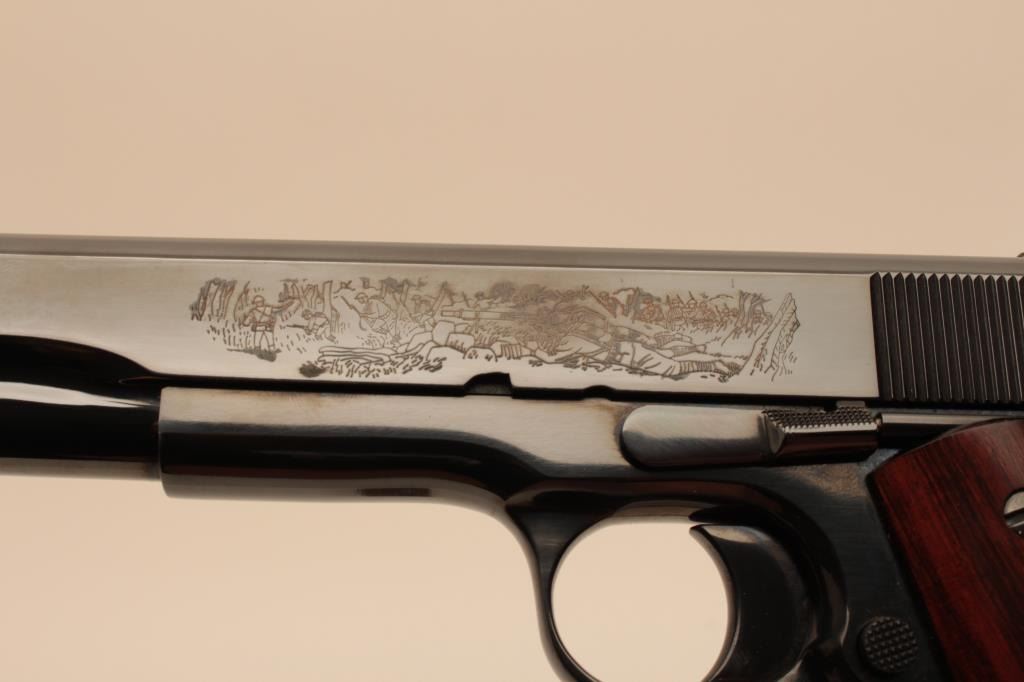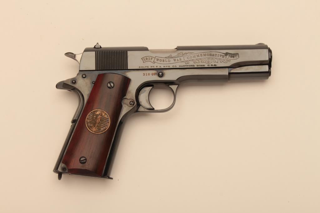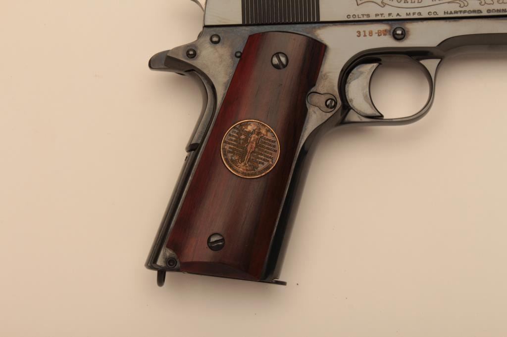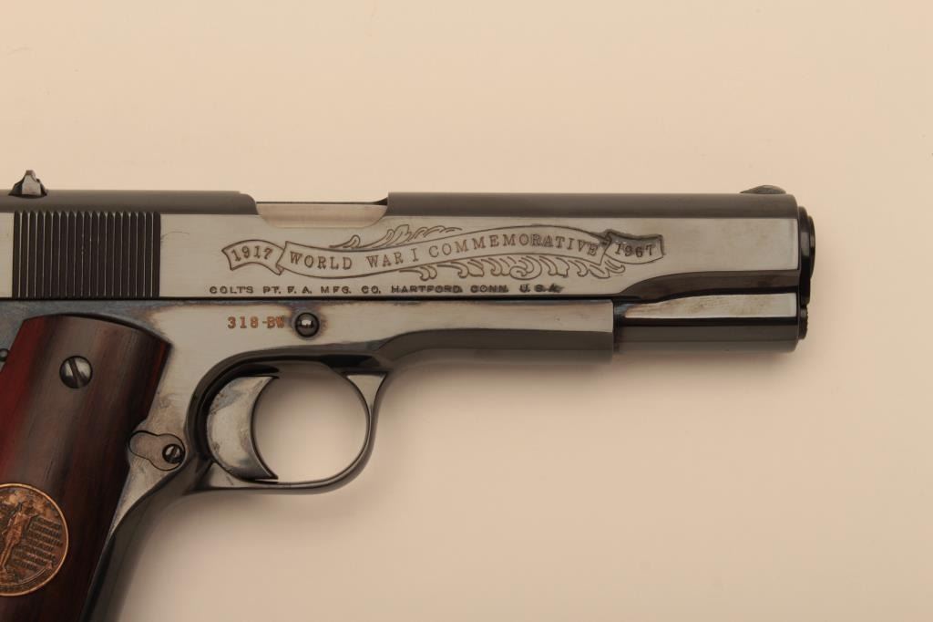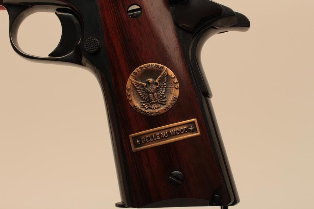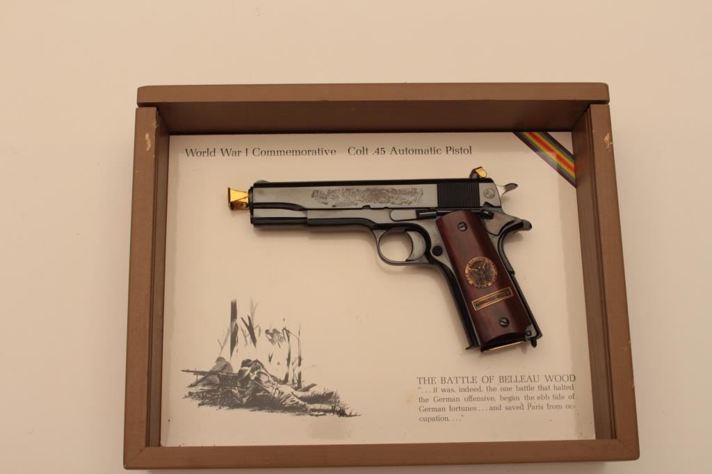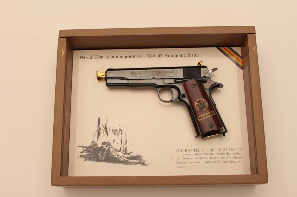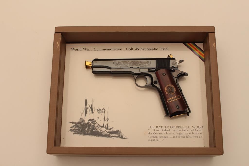 Colt Model 1911 .45 Auto WWI Commemorative of The Battle of Belleau Wood in display case, S/N BW318. Fine to excellent used condition. 98%-99% overall. Minor firing and use. Display case shows minor marks. (C&R) Est.:$700-$1400