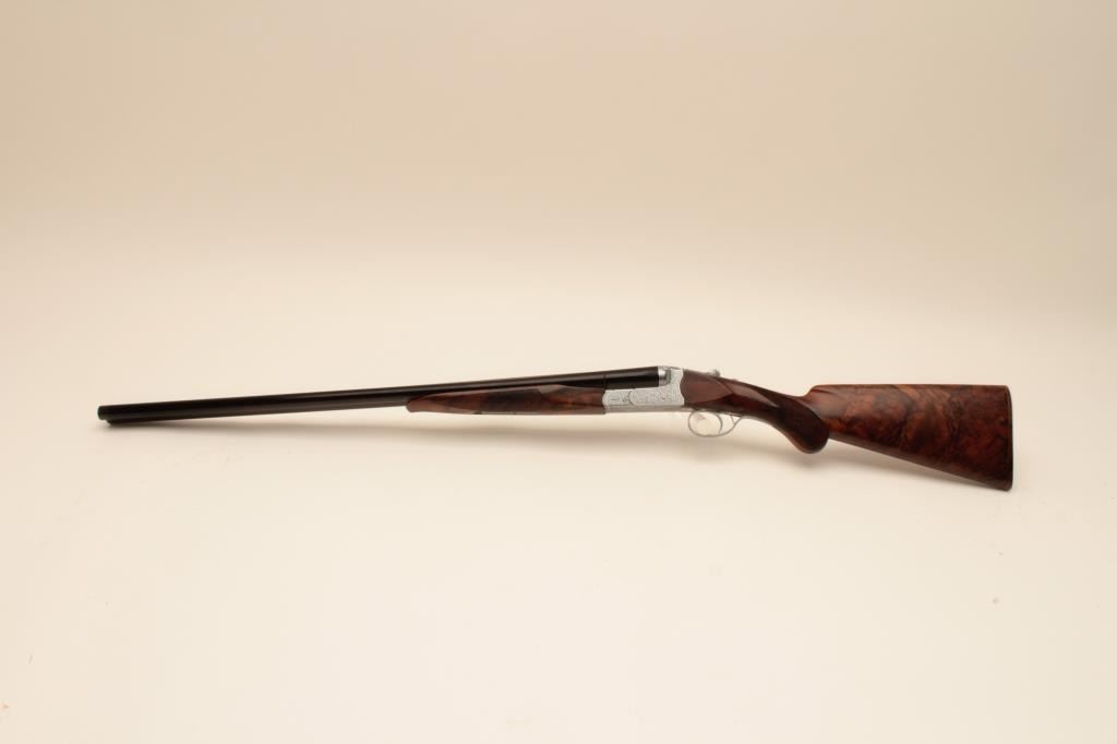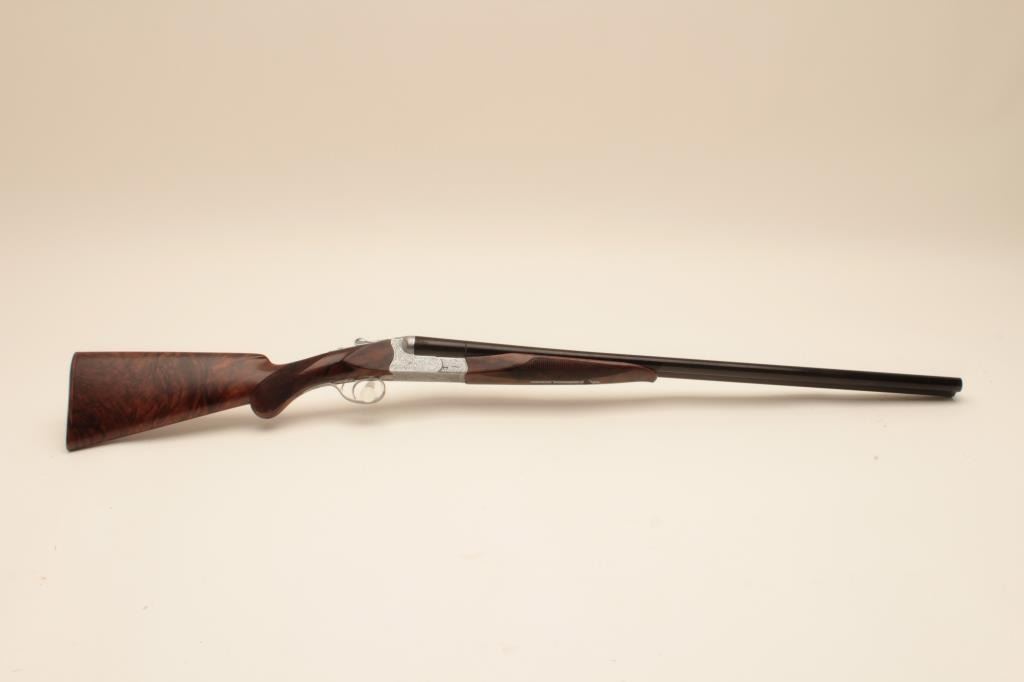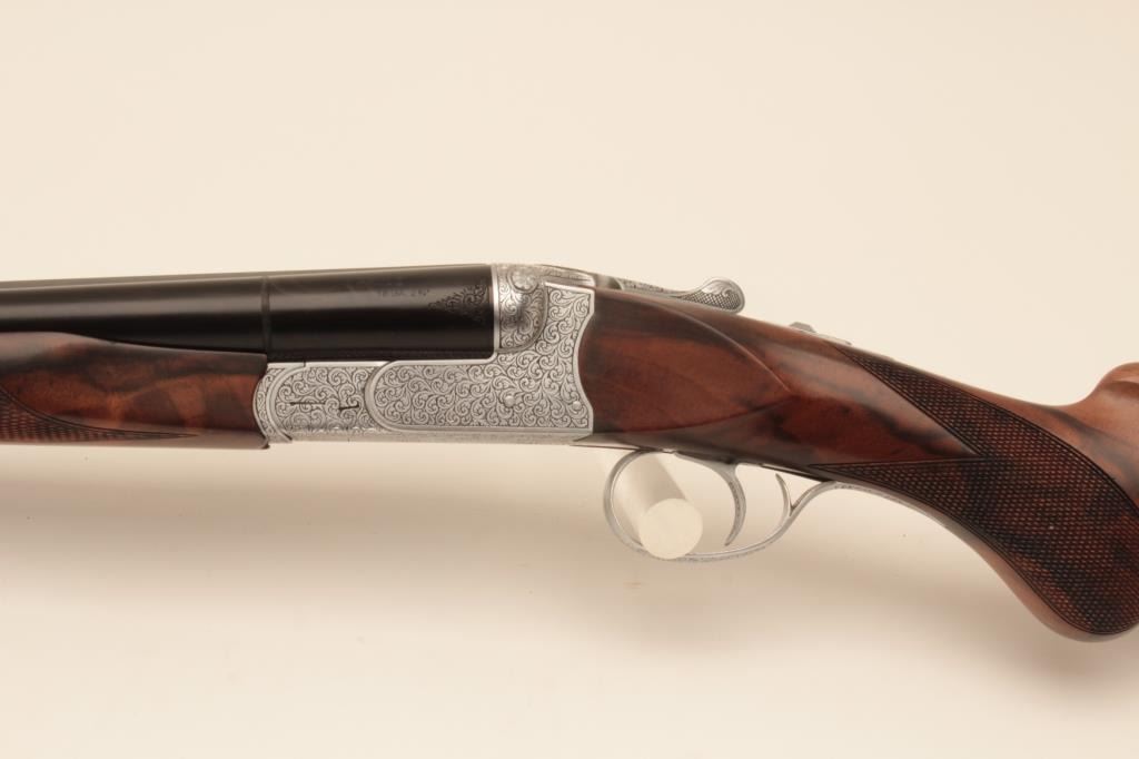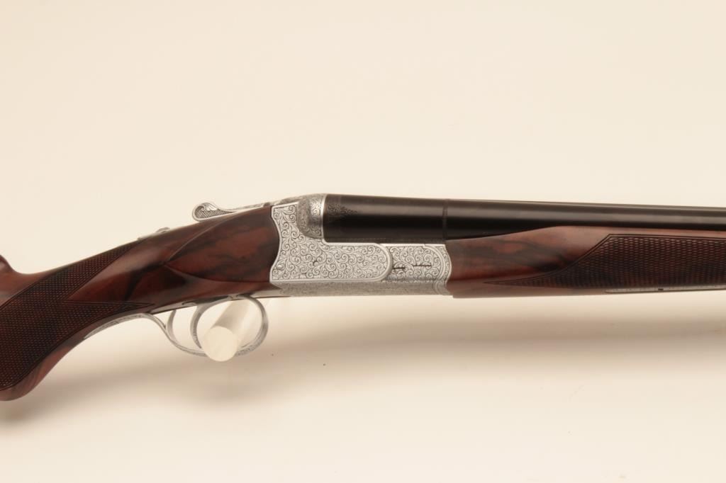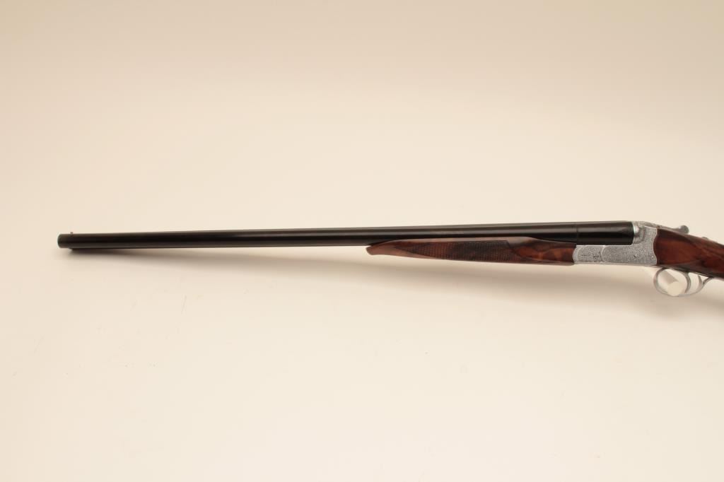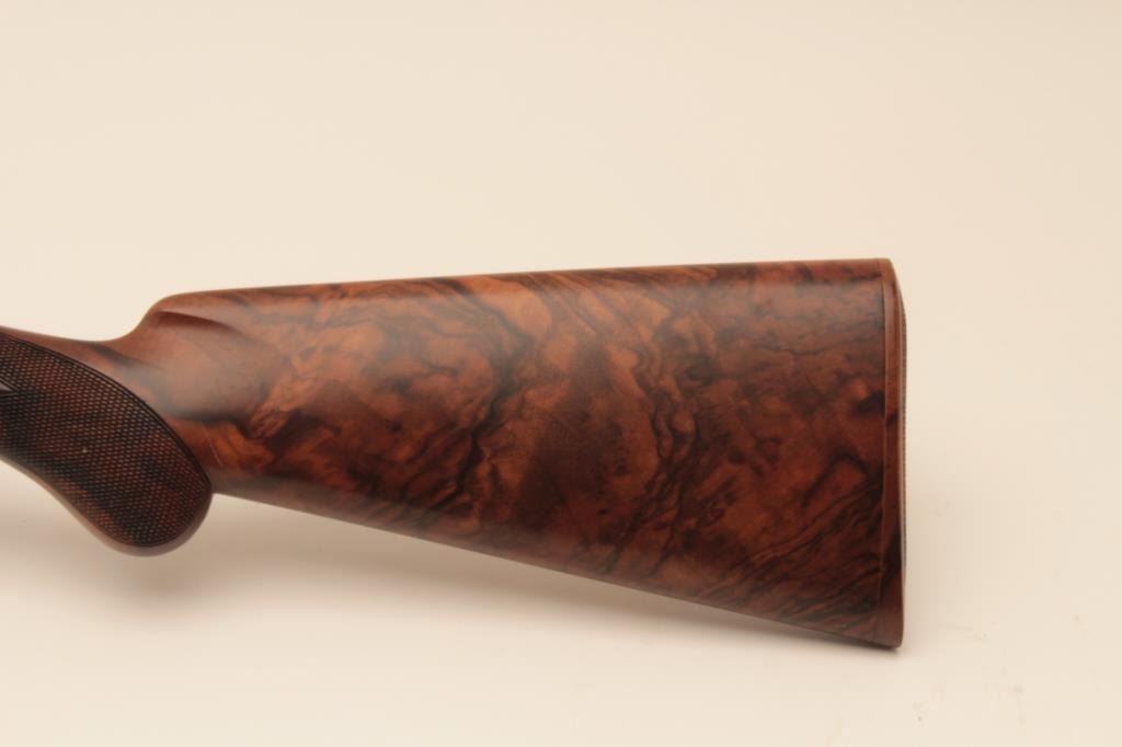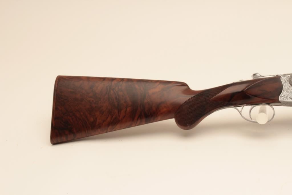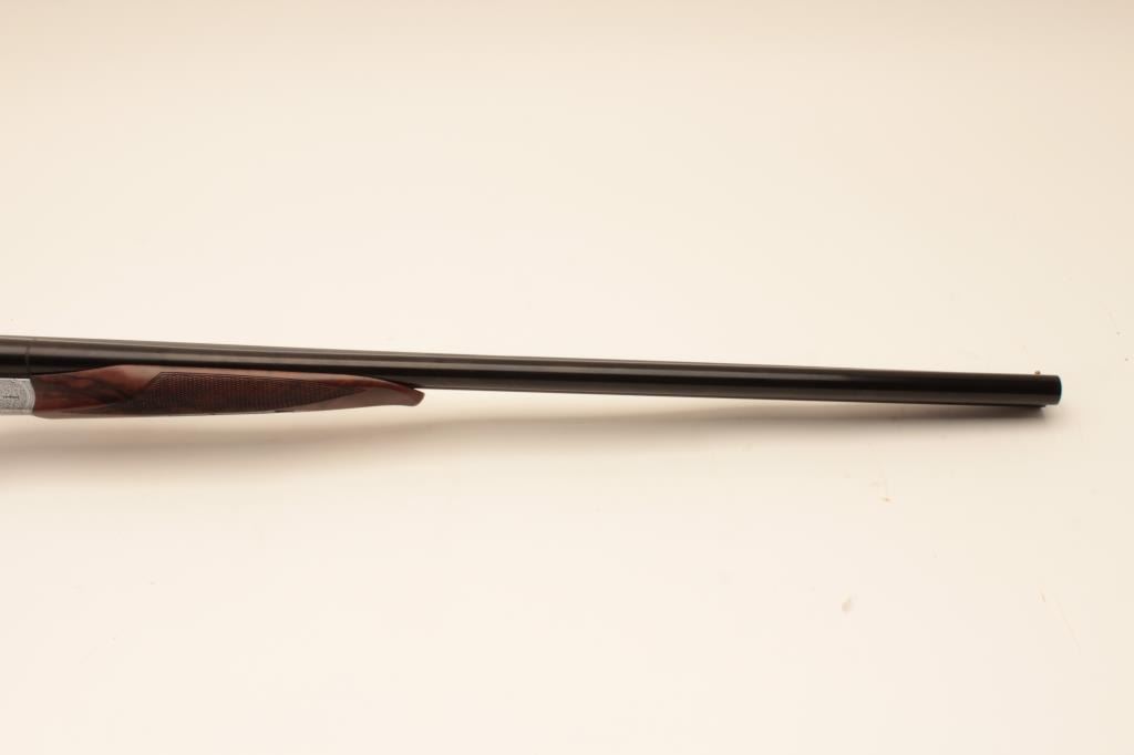 Huglu (Turkey) high grade hunter model 16GA box lock shotgun with two barrels, and Browning luggage case included, S/N 03C4784. The barrels measure 30” and 28”. The 30” set are choked full and full. The 28” set arechoked improved and improved. Single trigger and auto ejectors. The pistol gripped stock with broad checkering. Wide scroll engraved and satin finished frame with blued barrels fine to excellent used condition. (Modern)Est.: $2400-$4800