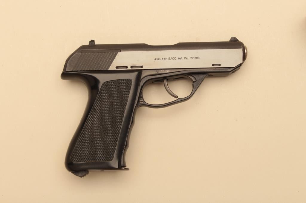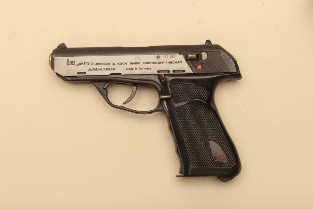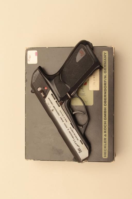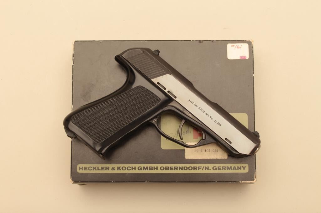 Heckler Koch P9S, #102382, 9mm, 4" barrel, blued finish, checkered plastic logo grips. Pistol is in fine condition, retaining 95% original finish, thinning at the edges, excellent grips, minty bore. The P9S was the side arm of choice of SEAL teams. Includes original box and 2 correct mags. (Modern/PPT) Est. $1250-2500