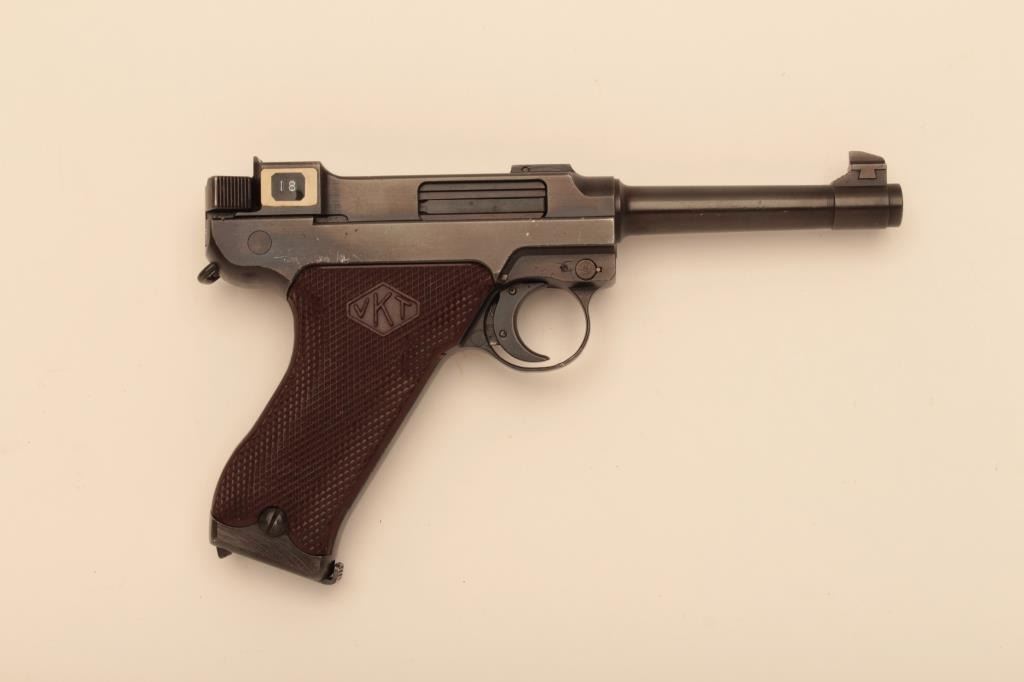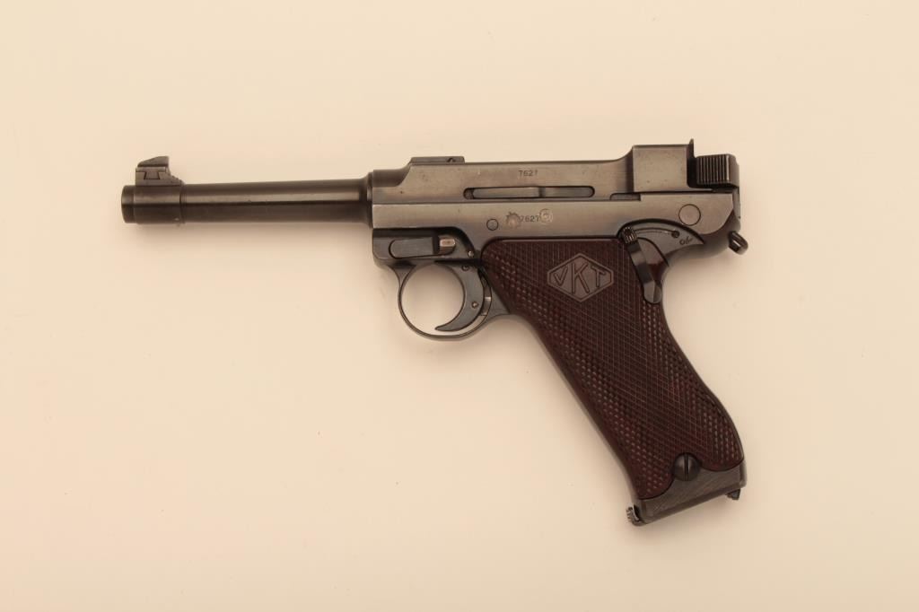 Valmet L-35 Lahti semi automatic pistol, #7627, 9mm, 4 3/4" barrel, blued finish, checkered plastic logo grips. Pistol is in fine condition overall, showing 95-97% original finish, bore is good, with minorpitting, grips are excellent, as is action. Military marks on left side of frame have been removed with 1/4" milling marks. One mag. (C&R/PPT) Est. $1250-2500