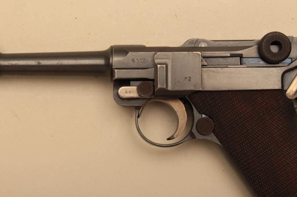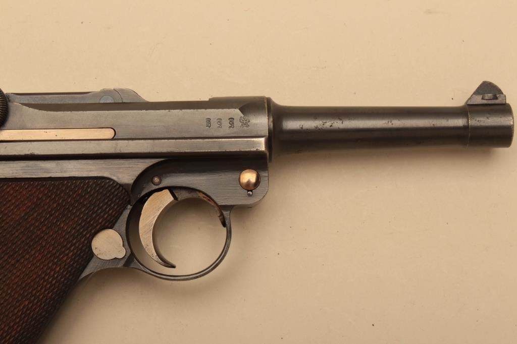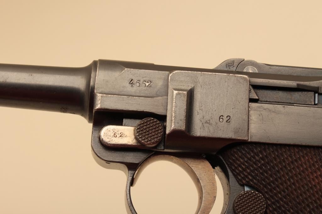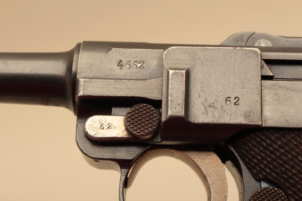 1916 dated Luger by DWM in 9mm with German military acceptance proofs, S/N 4662. Very good condition plus with 90%-95% original toning and dulling slightly original blue finish. 50% straw on small parts. Good plusgrips with minor wear to the top of checkering and small loss of wood. Matching visible numbers. Correct style wood bottom mag. Minor erosion and slight pinprick pitting. The bore is bright. A good example.(C&R/PPT) Est.: $1400-$2800