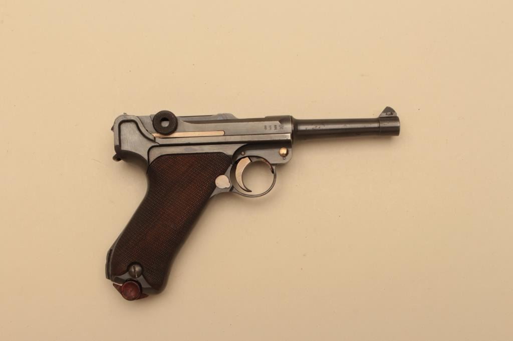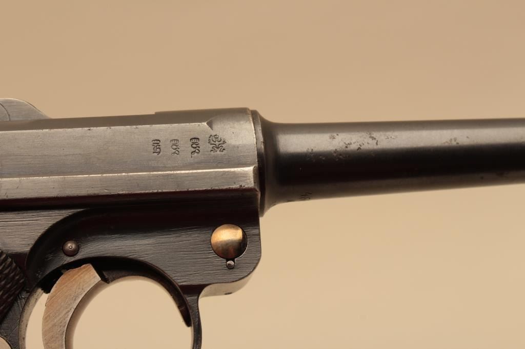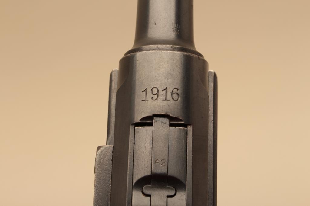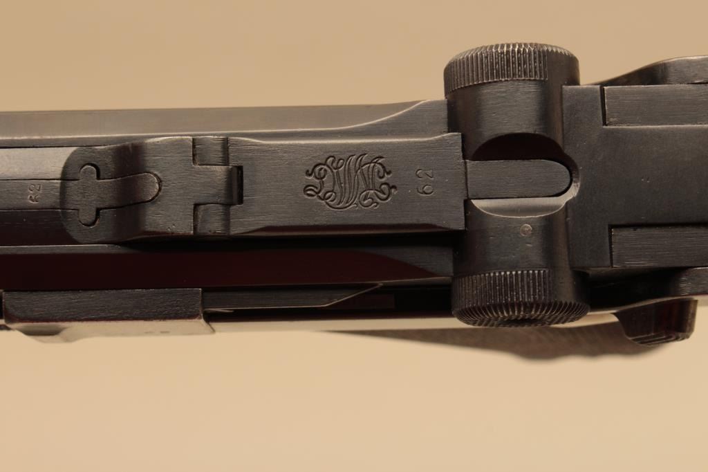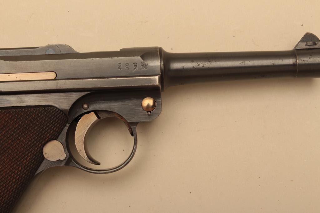 1916 dated Luger by DWM in 9mm with German military acceptance proofs, S/N 4662. Very good condition plus with 90%-95% original toning and dulling slightly original blue finish. 50% straw on small parts. Good plusgrips with minor wear to the top of checkering and small loss of wood. Matching visible numbers. Correct style wood bottom mag. Minor erosion and slight pinprick pitting. The bore is bright. A good example.(C&R/PPT) Est.: $1400-$2800