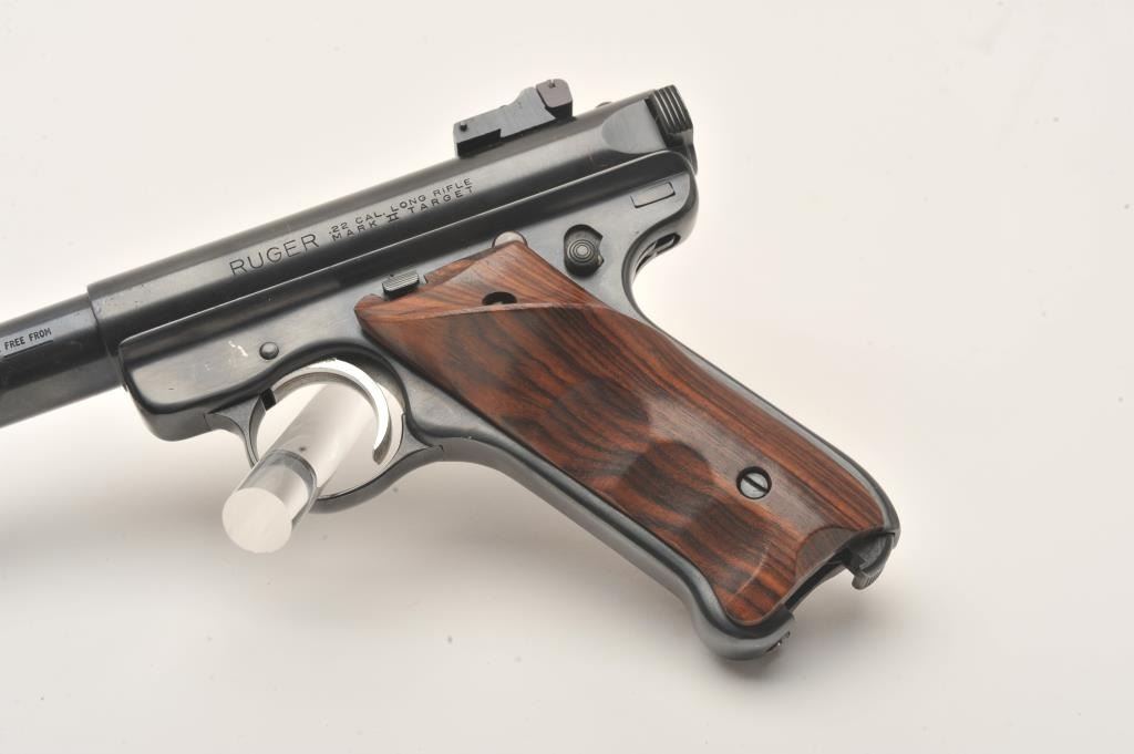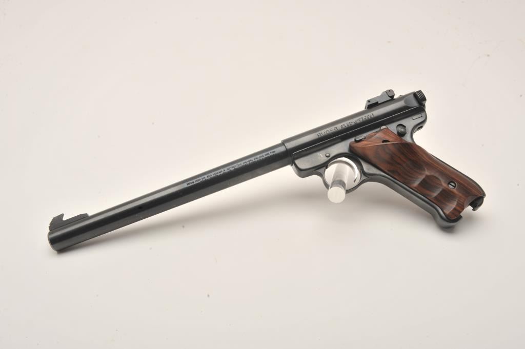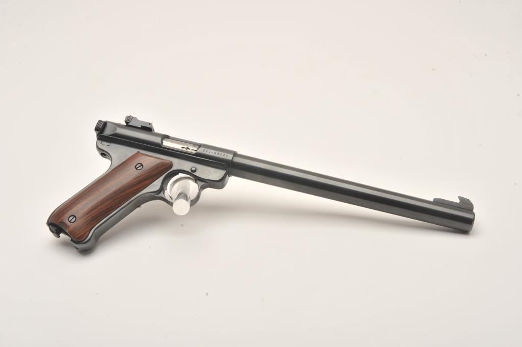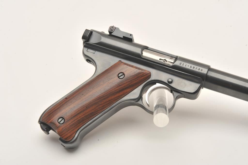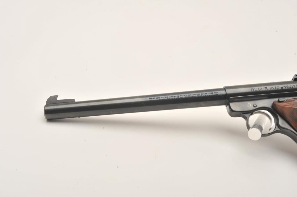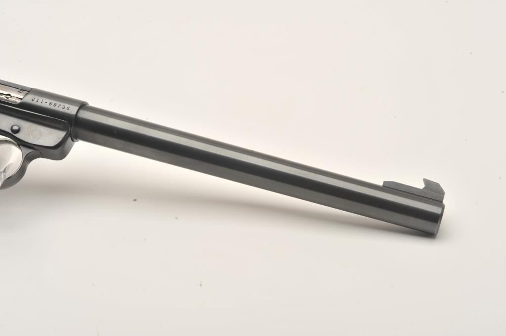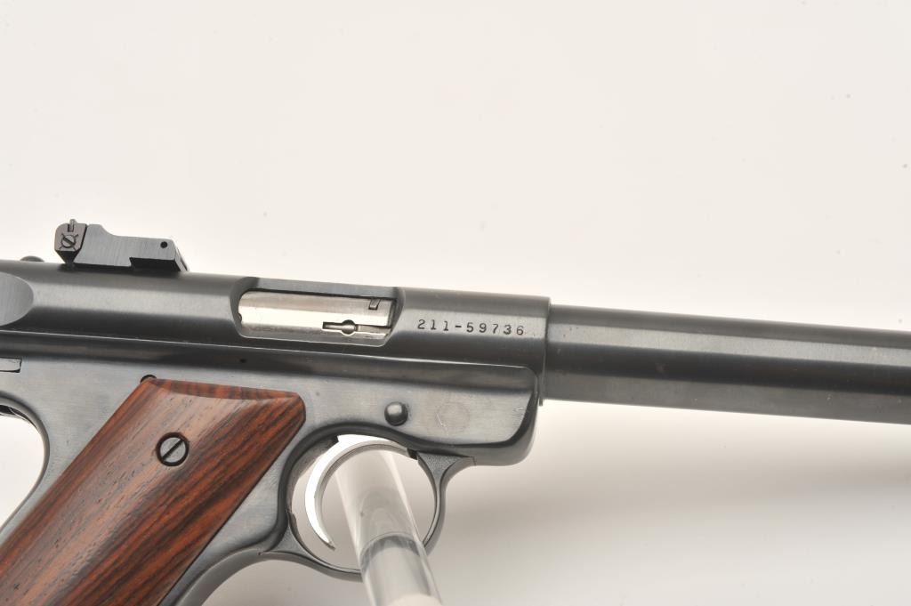 Ruger Mark II Target, #211-59736, .22 LR, 10" bull barrel, blued finish, adjustable sights, thumb rest target grips.Pistol is in very good to near fine conditionshowing approximately 90-95% original finish, withsome scratches and wear marks. Aftermarket grips are fine, with no chips or cracks, bore is very good, action is good. Great shooting gun in seldom seen barrel length. NO MAG. (Modern/PPT) Est. $300-600.