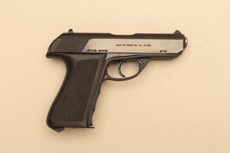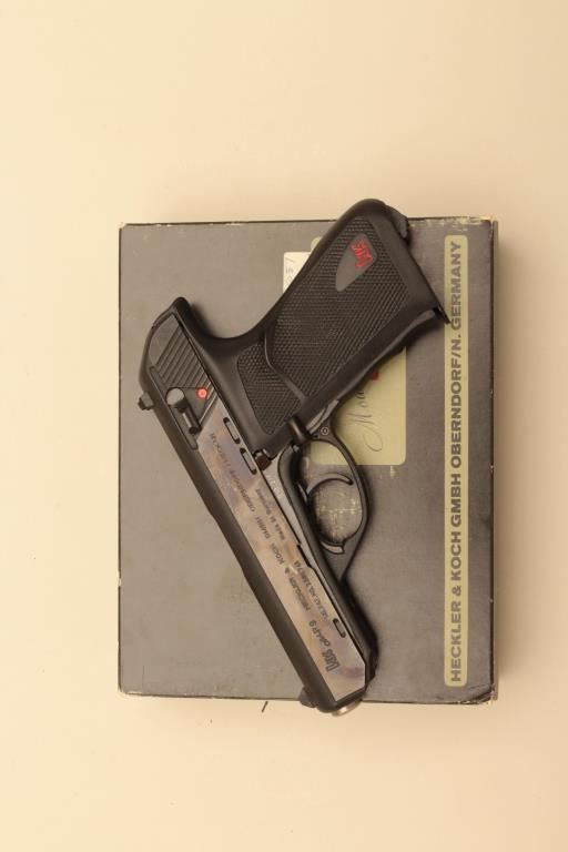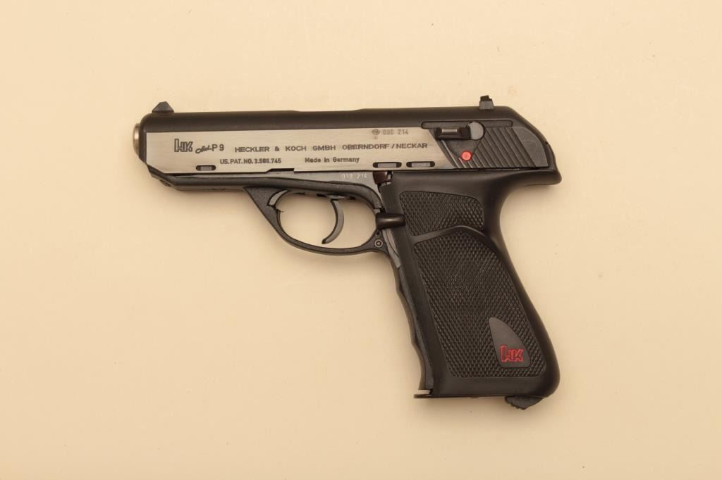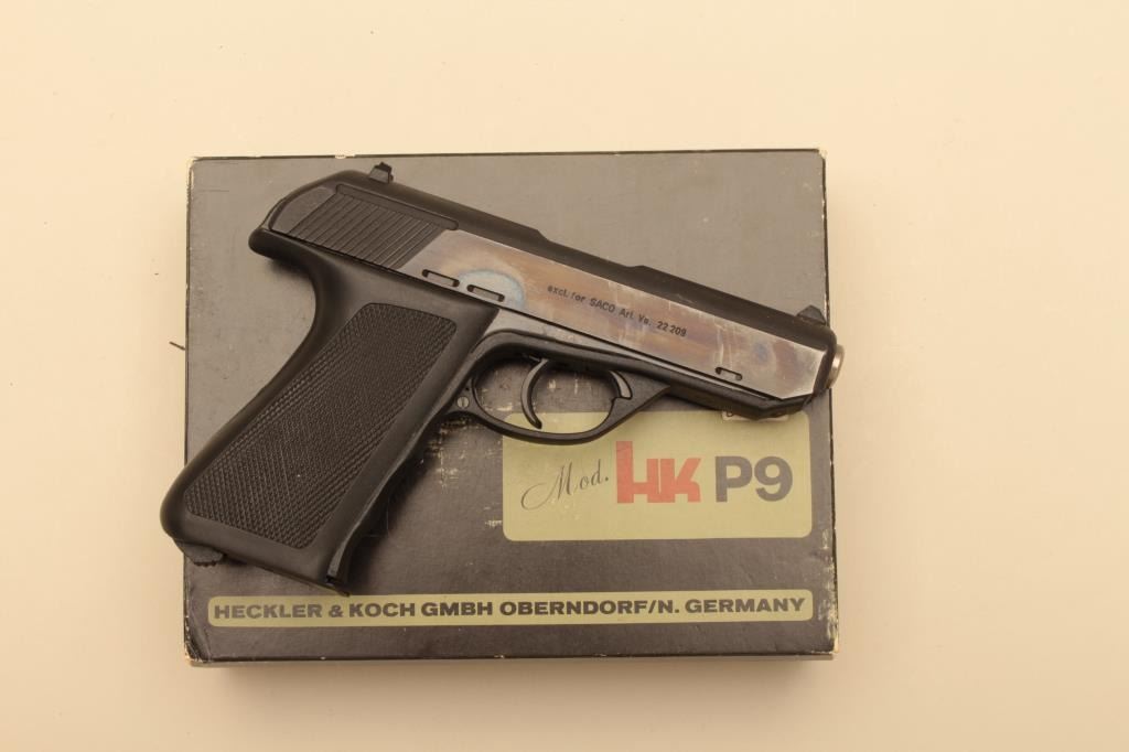 Ultra rare Heckler Koch P9, #090214, 9mm, 4" barrel, blued finish, single action only, checkered plastic logo grips. Pistol is in fine plus condition, retaining 98% original finish, excellent grips, minty bore. Onlyapproximately 485 P9 pistols were made. Includes original box and 2 correct mags. (Modern/PPT) Est. $1250-2500