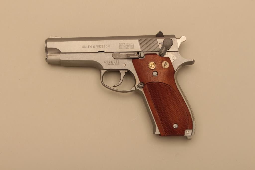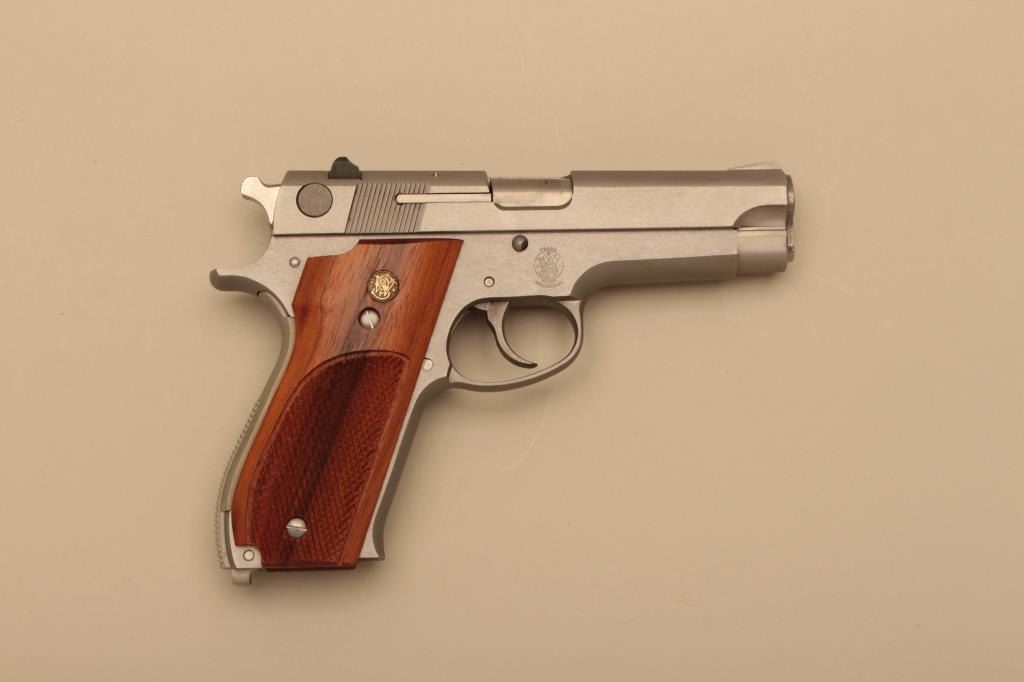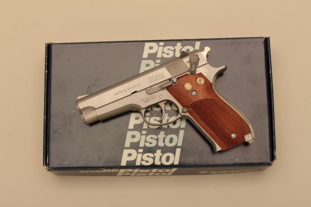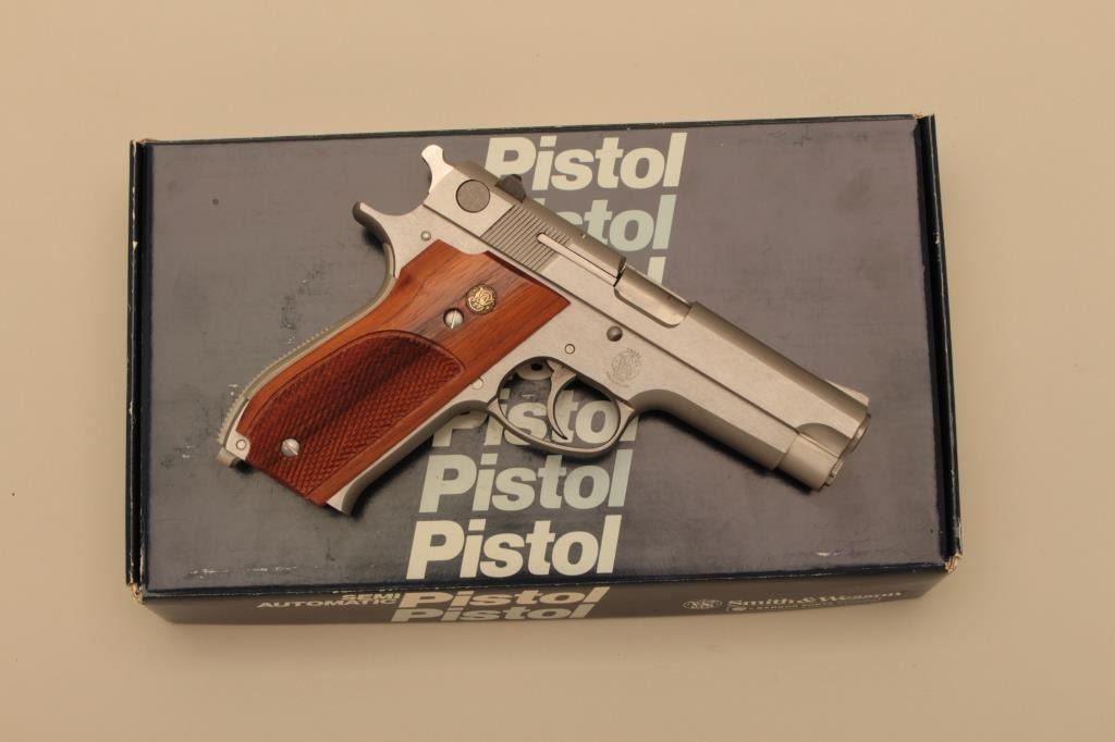 Smith & Wesson Model 639, #A878161, 9mm, 4" barrel, stainless, rounded trigger guard, fixed sights, checkered medallion walnut grips. Pistol is in fine condition overall, mint bore, excellent action, grips are finewith no chips or cracks and have crisp checkering. Special order #4089 from Smith & Wesson as indicated on box. Minor handling marks only. Includes original box, instructions and 2 mags. (Modern/PPT) Est.$350-700