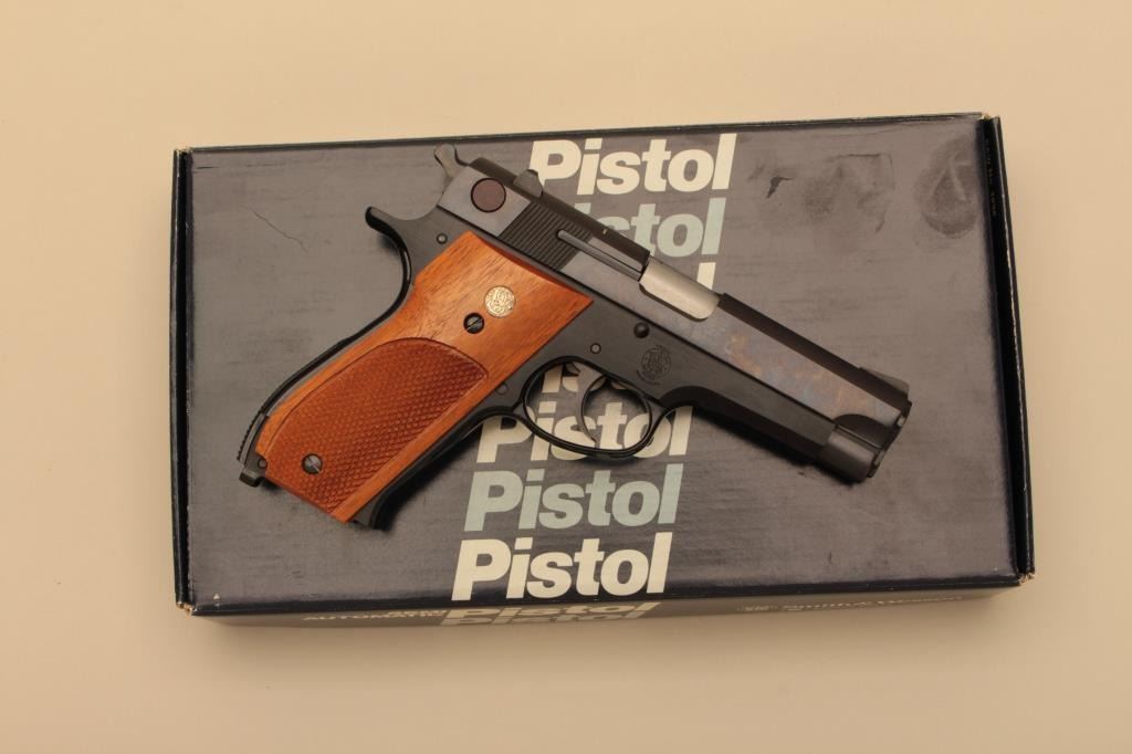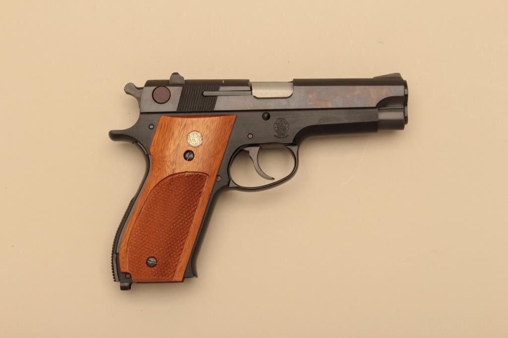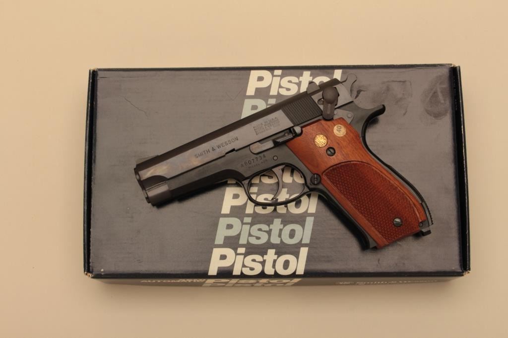 Smith & Wesson Model 439, #A807734, 9mm, 4" barrel, blued finish, fixed sights, rounded trigger guard, checkered medallion walnut grips. Pistol is in fine condition overall, showing 95-98% original finish, mint bore,excellent action, grips are fine with no chips or cracks and have crisp checkering. Box indicates special order #3318. Minor handling marks only. Includes original box, instructions and 2 mags. (Modern/PPT) Est.$350-700