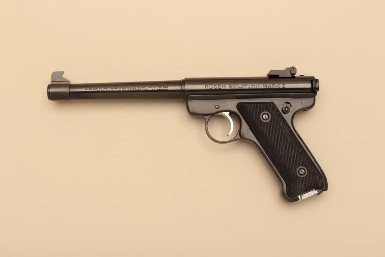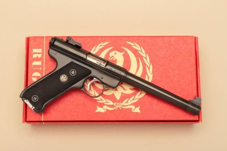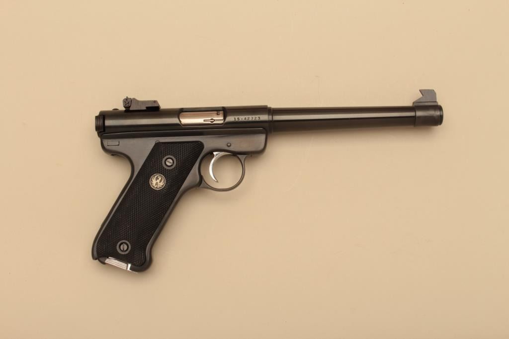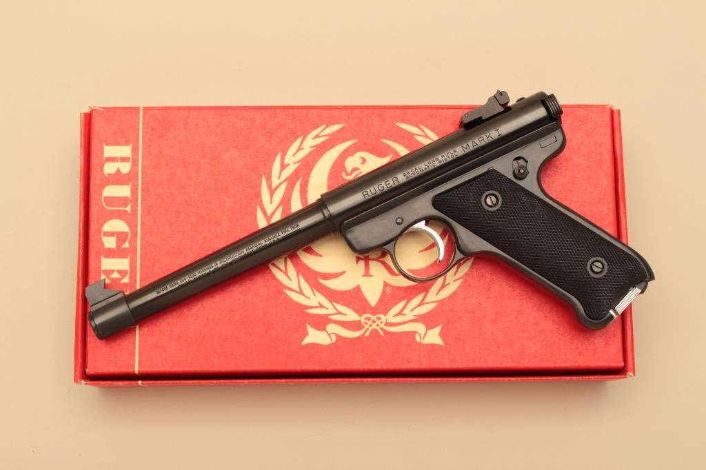 Ruger Mark I semi automatic pistol, #15-42723, .22 LR, 6 7/8" tapered heavy barrel, blued finish, adjustable sights, checkered medallion grips. Pistol is in fine condition overall, showing 95%+ originalfinish, very good bore and action. Grips are fine with no chips or cracks. Includes original box in very good condition numbered to the gun, with outer sleeve, and one mag. (Modern/PPT) Est. $250-500