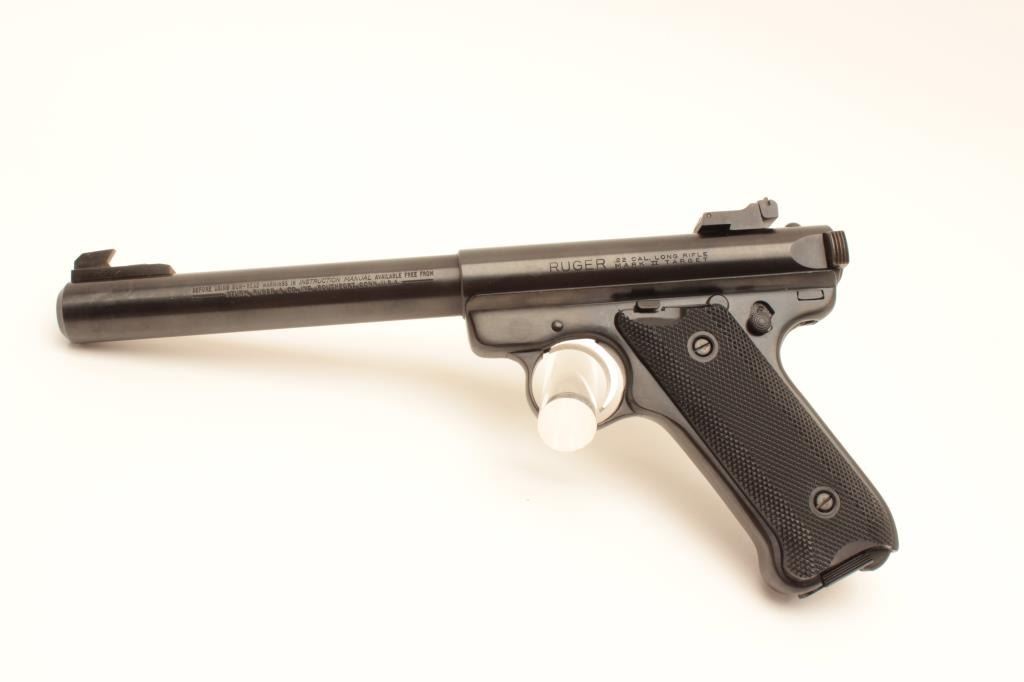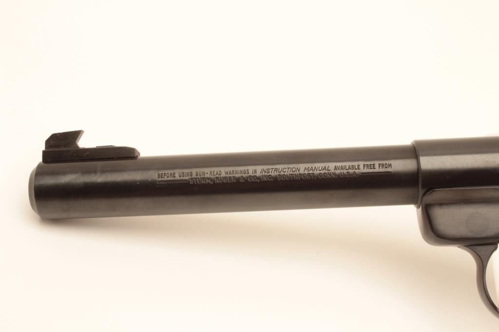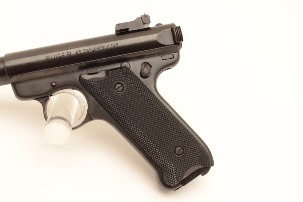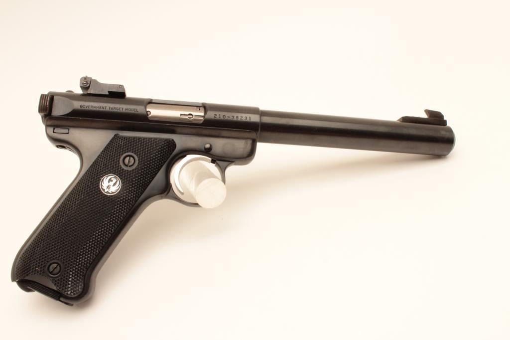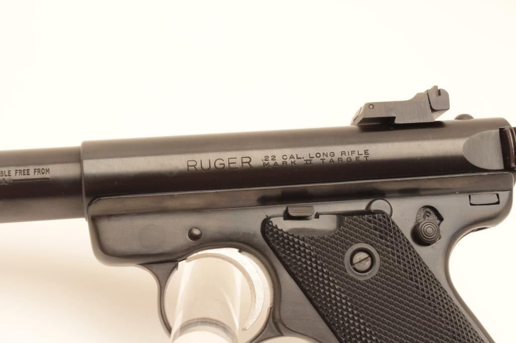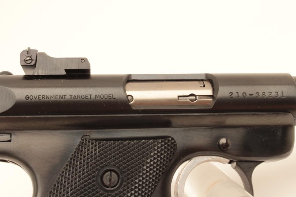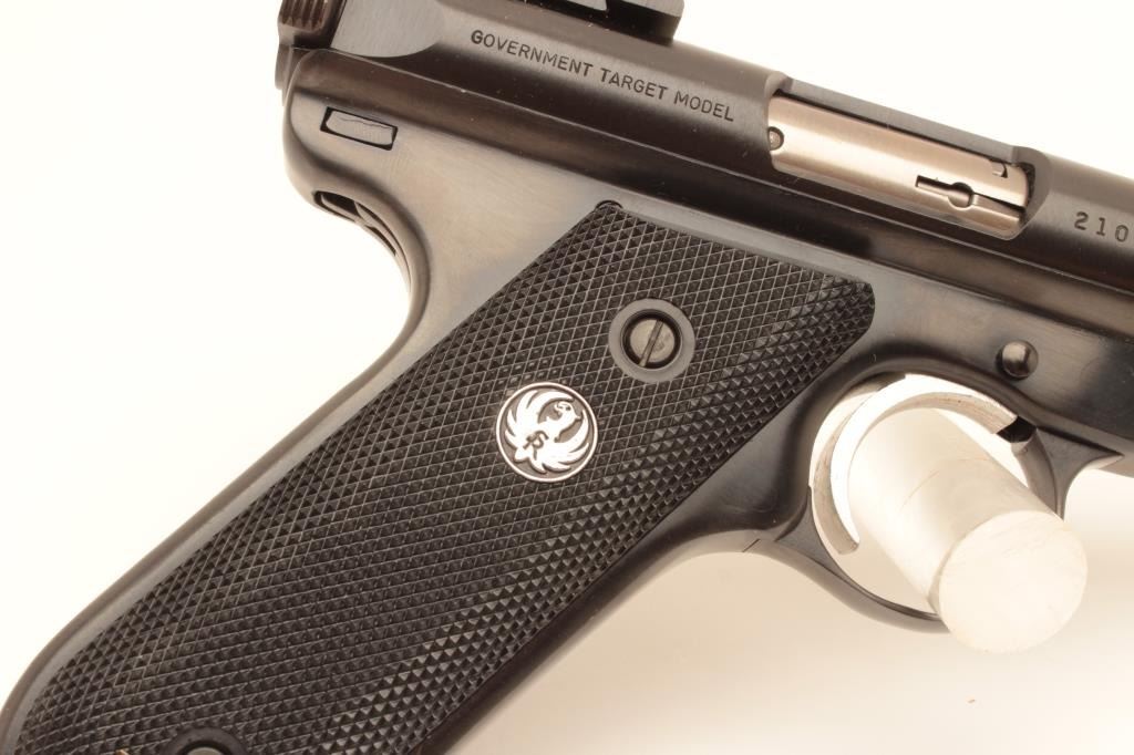 Ruger Mark II Government Target Model semi automatic pistol, #210-38231, .22 LR, 6 7/8" bull barrel, blued finish, adjustable sights, checkered medallion grips. Pistol is in fine condition overall, showing 95%+ original finish, fine bore and action. Grips are fine with no chips or cracks. Includes original box in very good condition numbered to the gun, with outer sleeve, and one mag. (Modern/PPT) Est. $250-500
