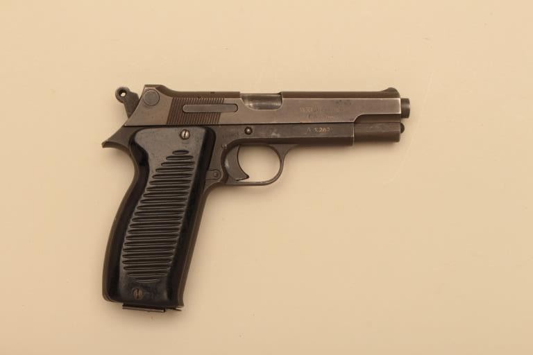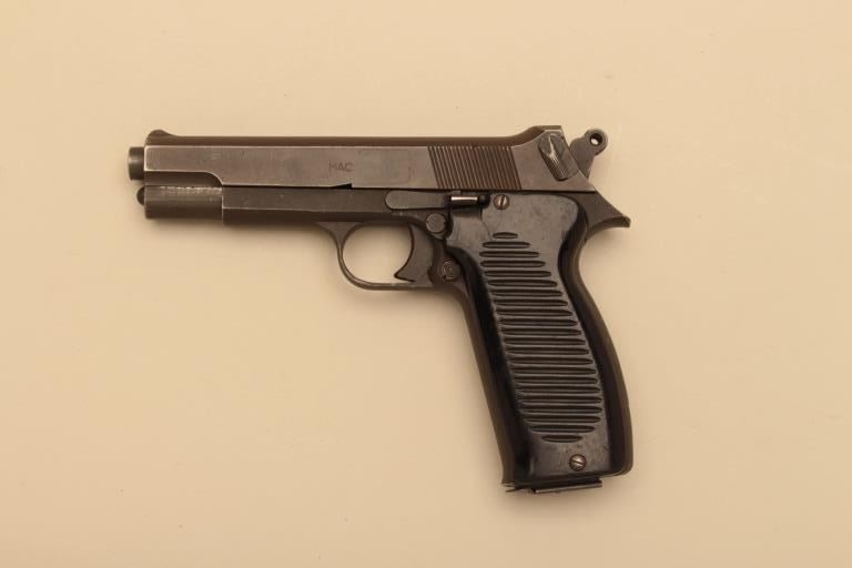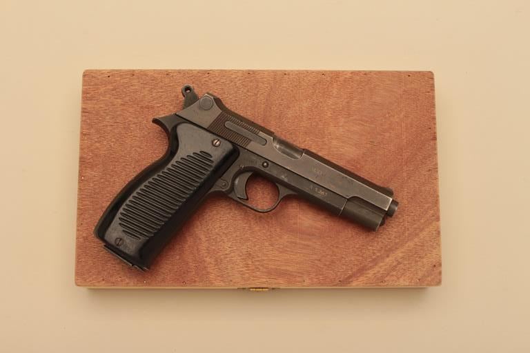 Scarce French MAC Model 1950 semi automatic pistol, #A1282, 9mm, 4.4" barrel, military finish with plastic grips. This pistol was the French sidearm adapted in 1950 and was used by France and a number of countries into the Vietnam era. Very good conditon overall, bore and action are good, retains the majority of it's military finish, good markings. No import marks. Includes one original mag and a hand made wooden boxfitted to the gun. (C&R/PPT) Est. $350-700