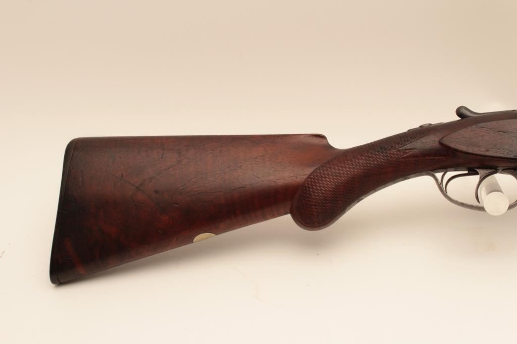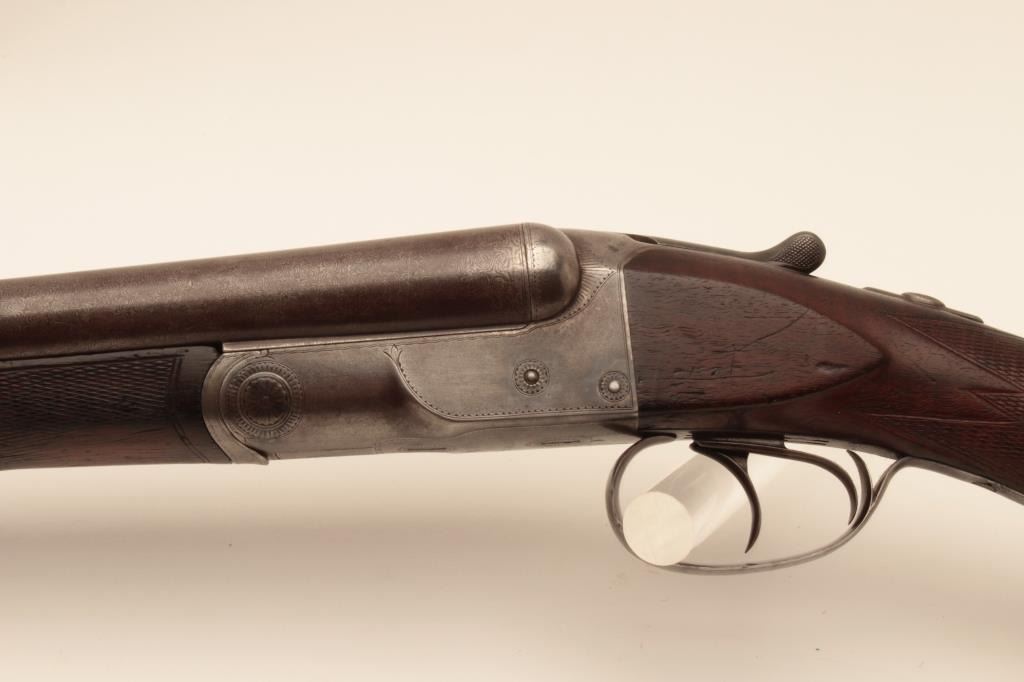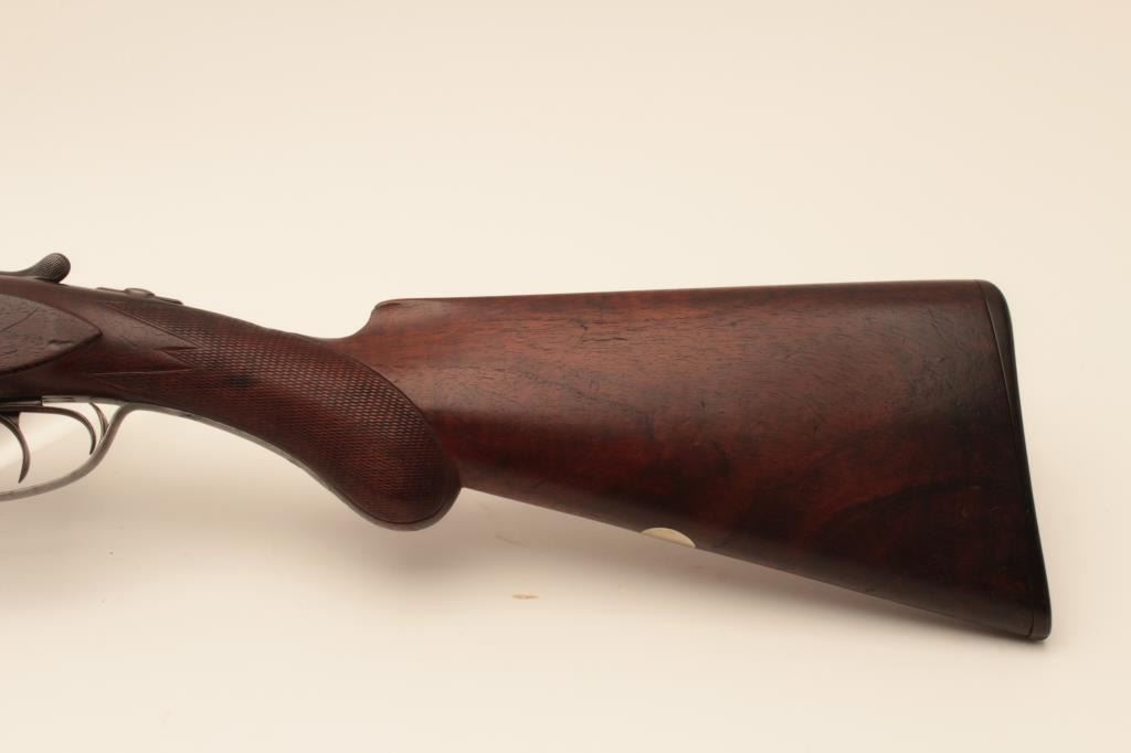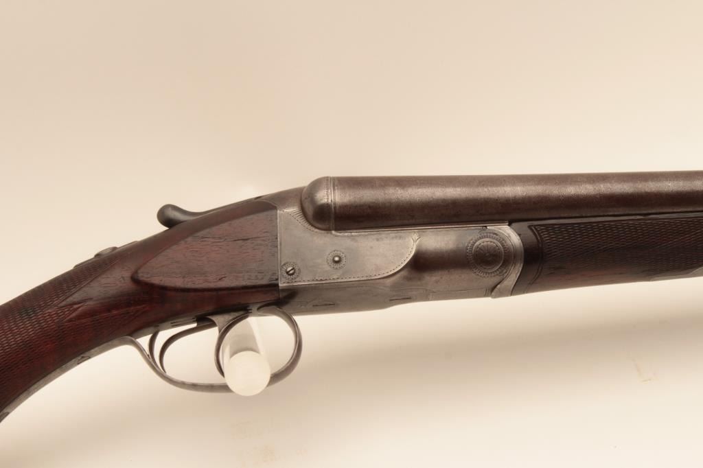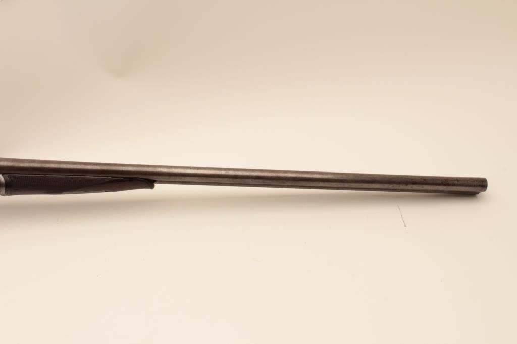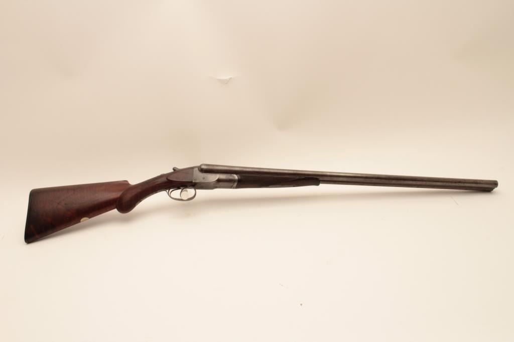 Colt Model 1883 Hammerless shotgun with 30” Damascus barrles in 12GA, S/N 1685 and choked full and full. Checkered pistol grip stock with nicely burled wood grain. Measures 14 1/8” to the end of original Colt buttplate.Standard extractors and double triggers. Good to very good overall with traces of case hardening. The bores are fair to good with a little erosion. (Antique) Est.: $900-$1800