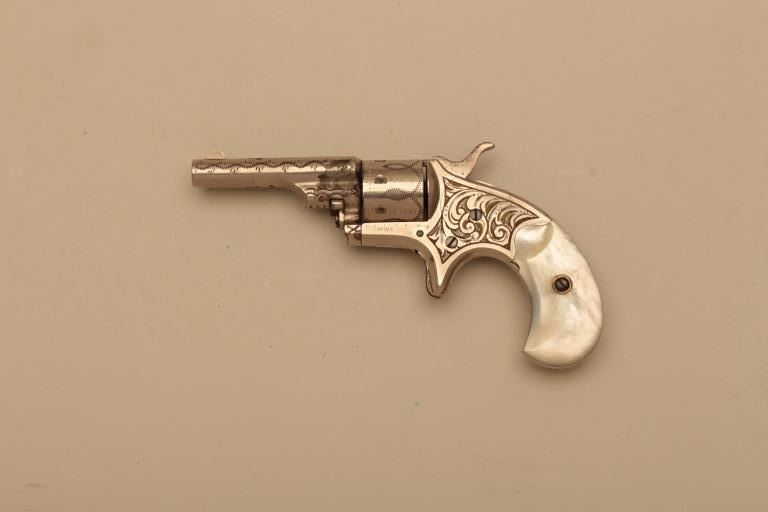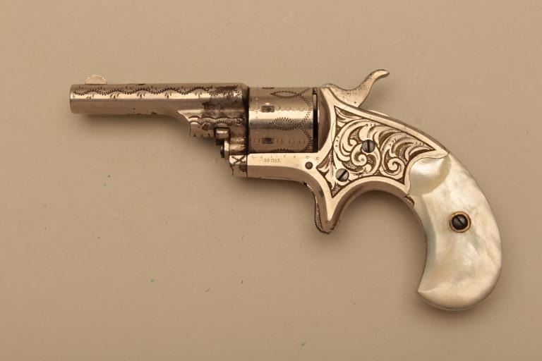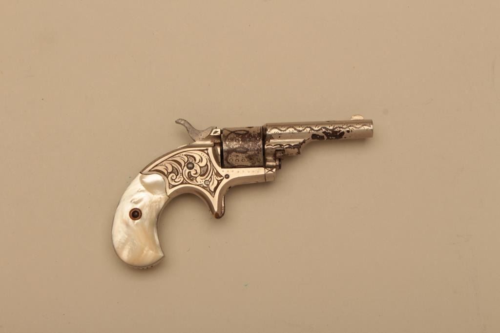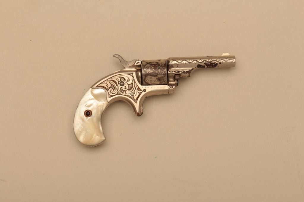 1872 Colt Open Top revolver, .22 caliber, Serial #111830. The pistol is in very good overall condition with a 2 3/8” barrel. The metal surfaces retain the majority of their nickel finish with wonderful periodengraving. The pistol shows flaking and loss of finish on the cylinder and under the barrel. The smooth pearl grips are in very good condition and fit well. The bore is good, the action is crisp and markings aresharp on this beautiful engraved Colt with fine pearl grips. Est.: $1,500-$3,000. (Antique).